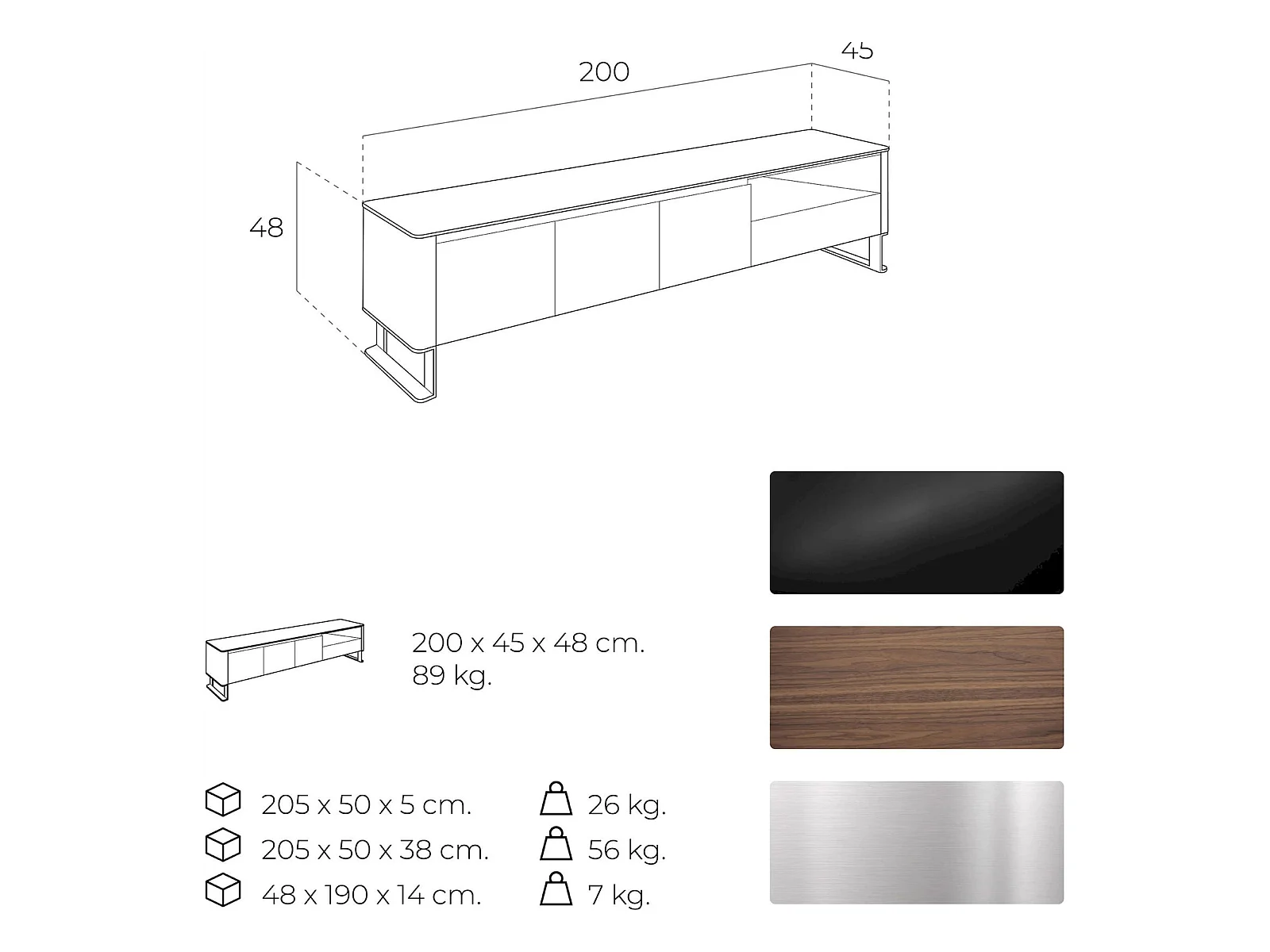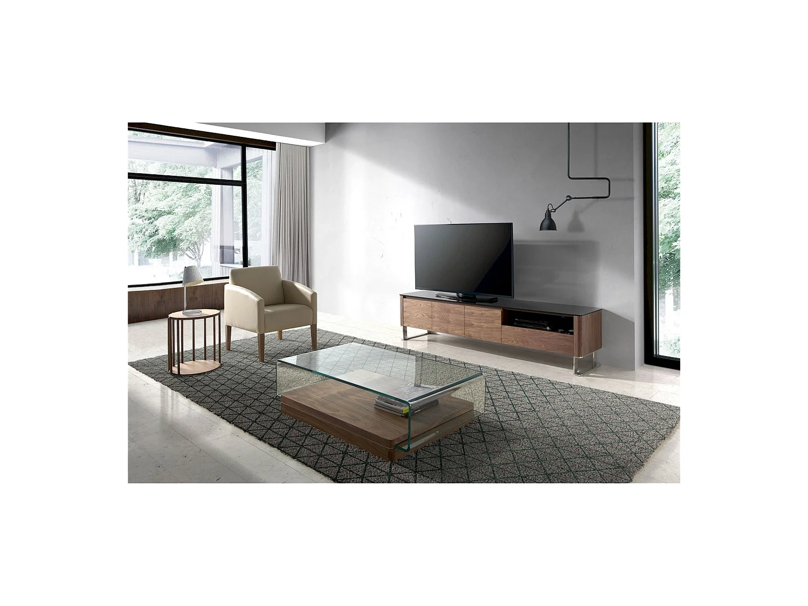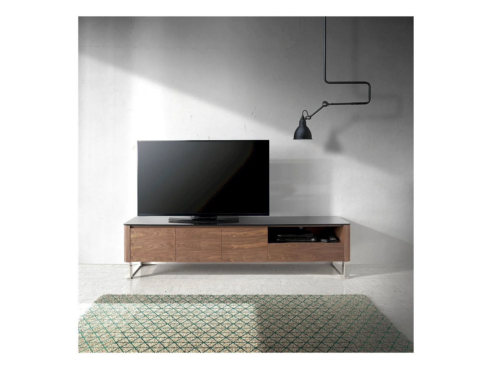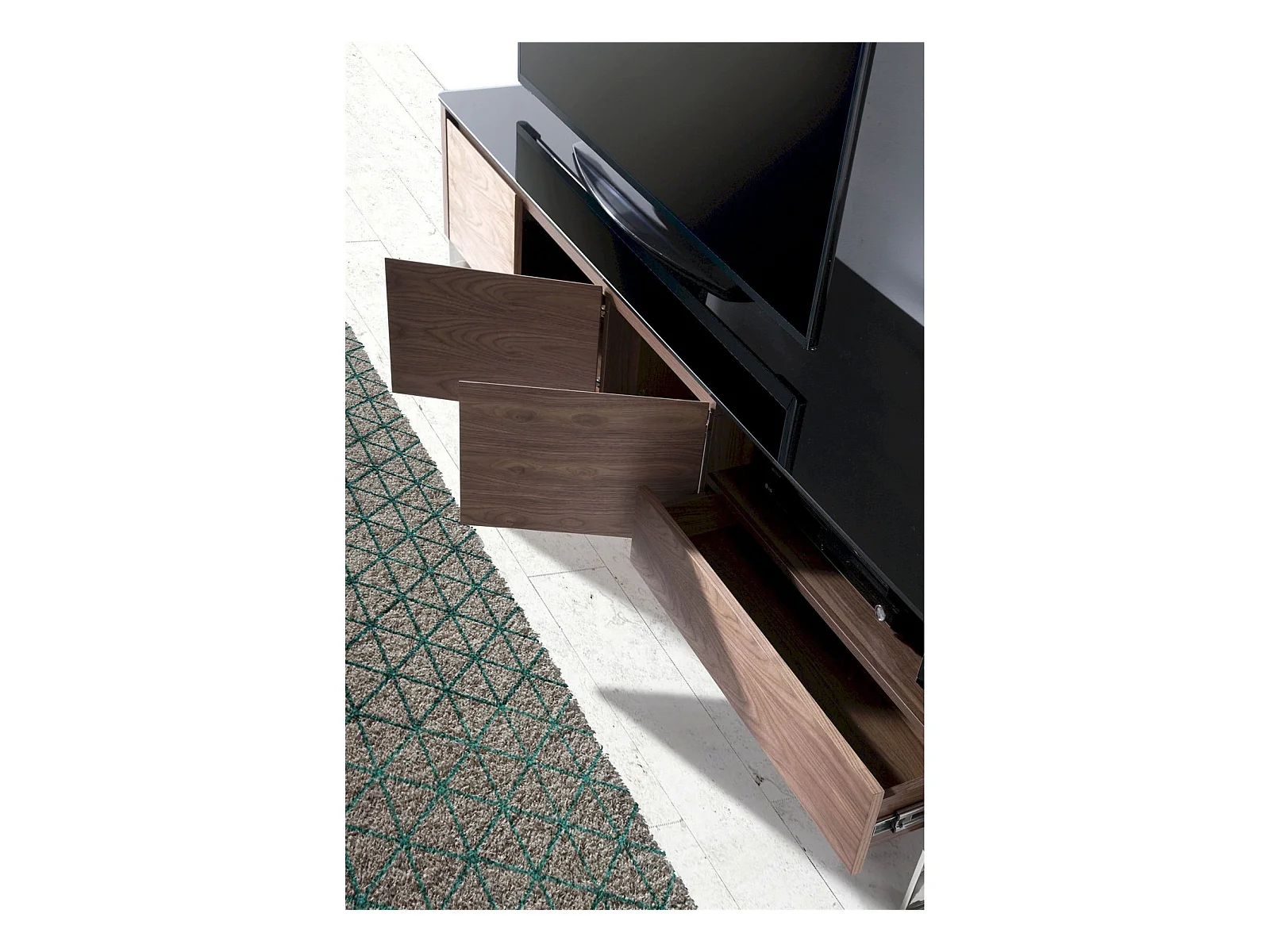 Buffet TV bois dessus en verre trempé noir 1 tiroir et étagères