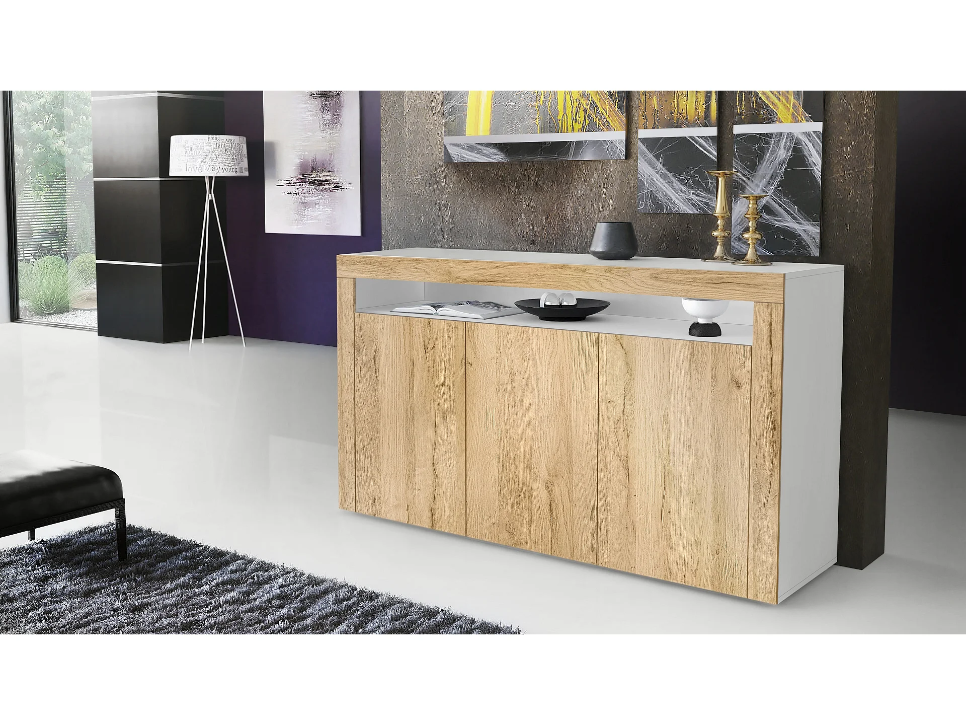 Buffet Valencia, Commode avec 3 portes et 1 compartiment ouvert, Blanc mat/chêne nature/chêne nature (155 x 92 x 40 cm)