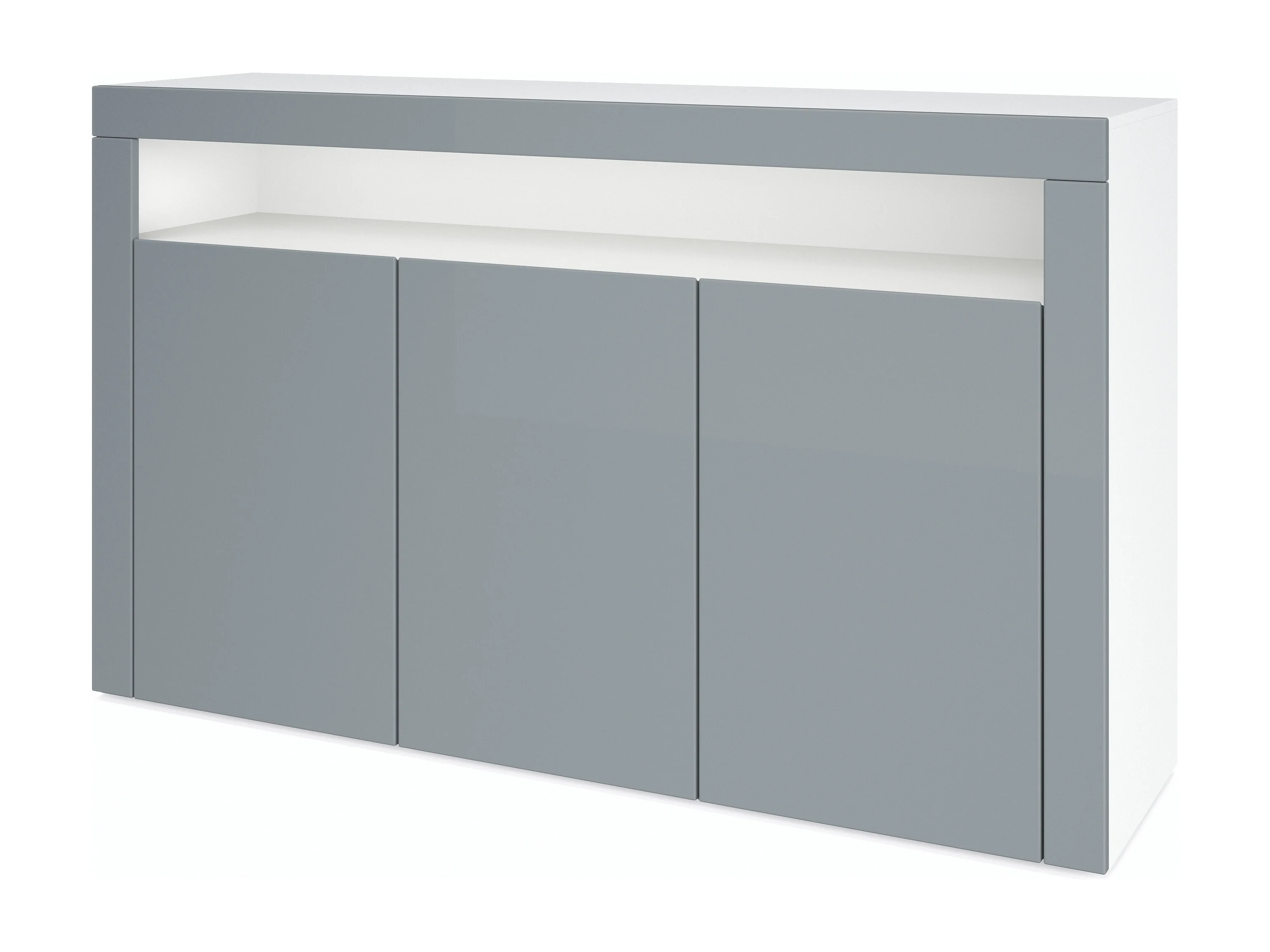 Buffet Valencia, Commode avec 3 portes et 1 compartiment ouvert, Blanc mat/gris haute brillance/gris haute brillance (155 x 92 x 40 cm)