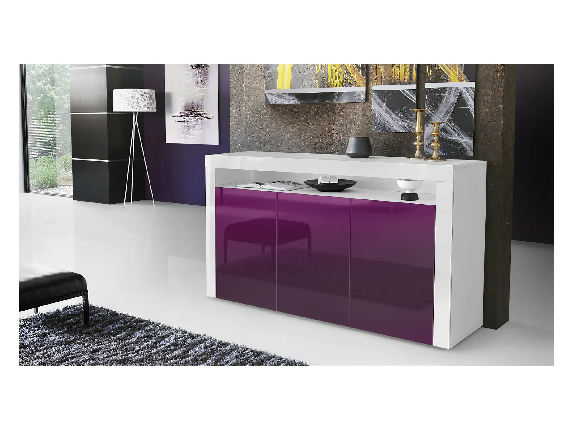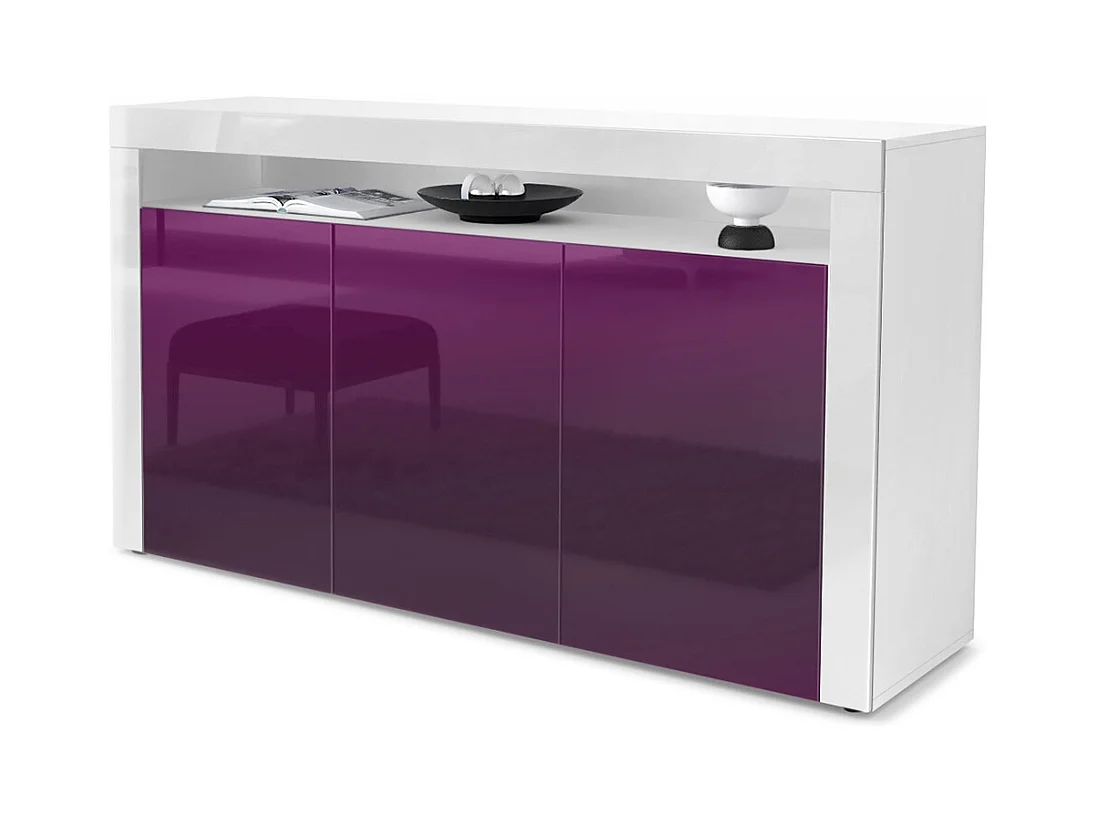 Buffet Valencia, Commode avec 3 portes et 1 compartiment ouvert, Blanc mat/mûre haute brillance/blanc haute brillance (155 x 92 x 40 cm)