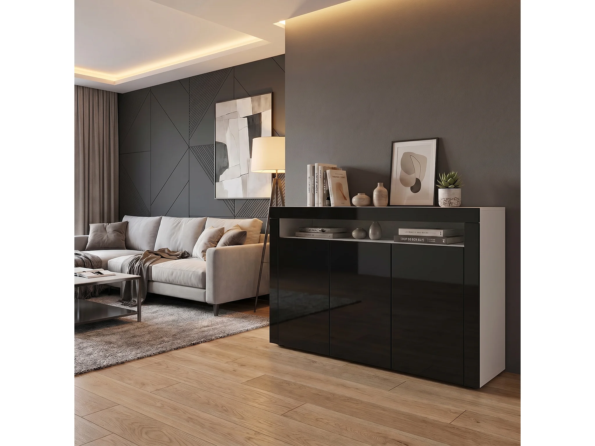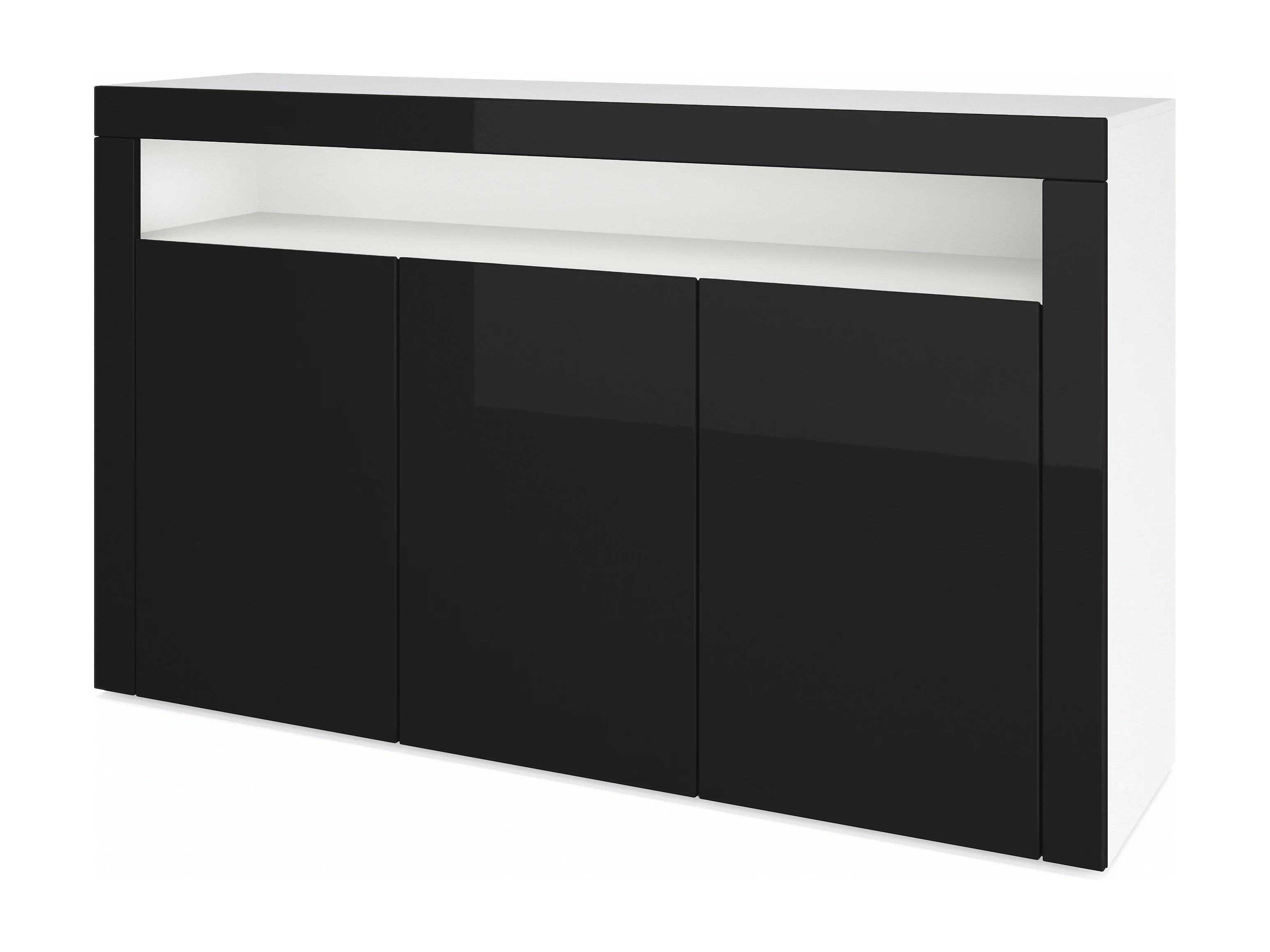 Buffet Valencia, Commode avec 3 portes et 1 compartiment ouvert, Blanc mat/noir haute brillance/noir haute brillance (155 x 92 x 40 cm)
