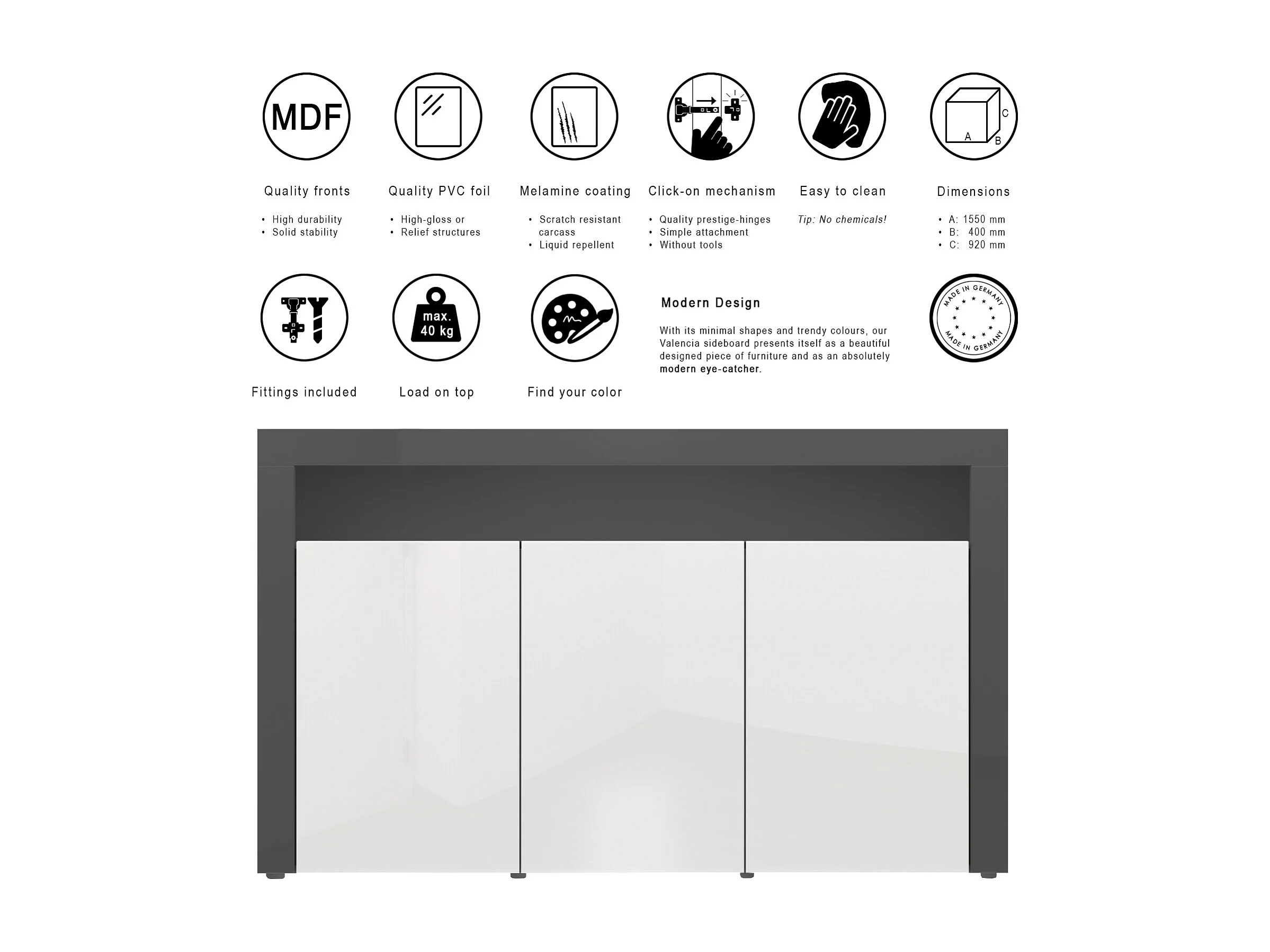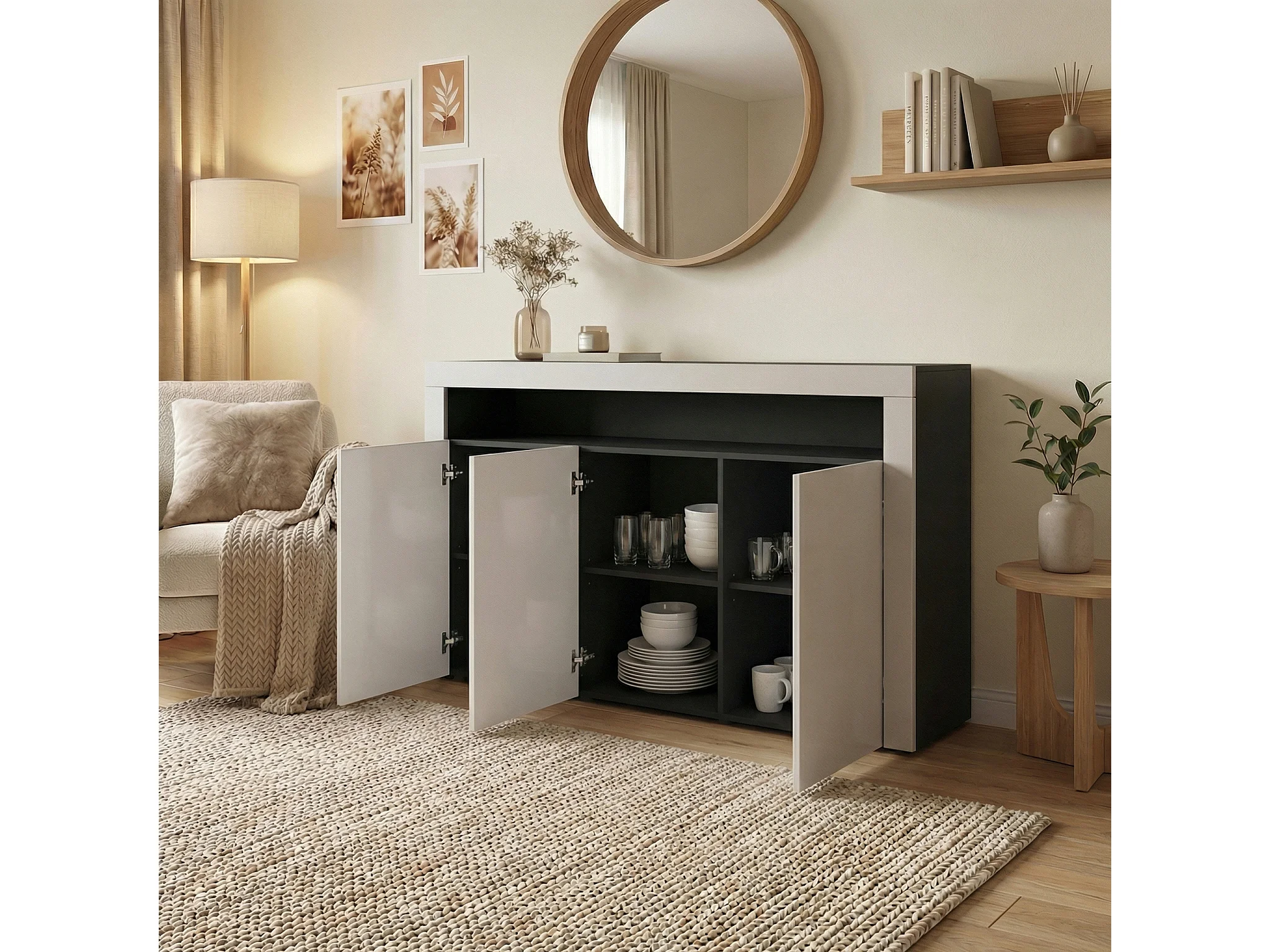 Buffet Valencia, Commode avec 3 portes et 1 compartiment ouvert, Noir mat/blanc haute brillance/noir haute brillance (155 x 92 x 40 cm)
