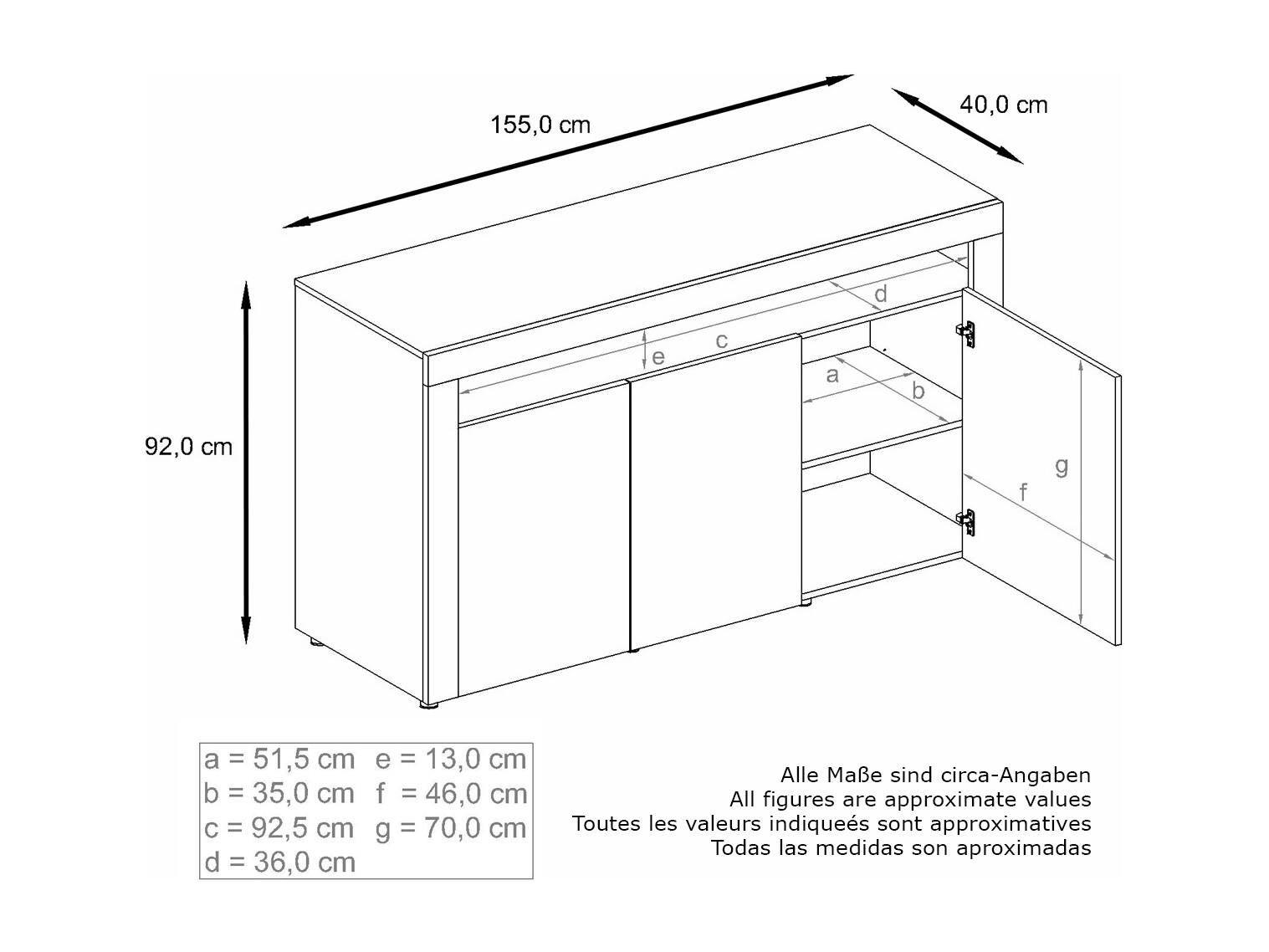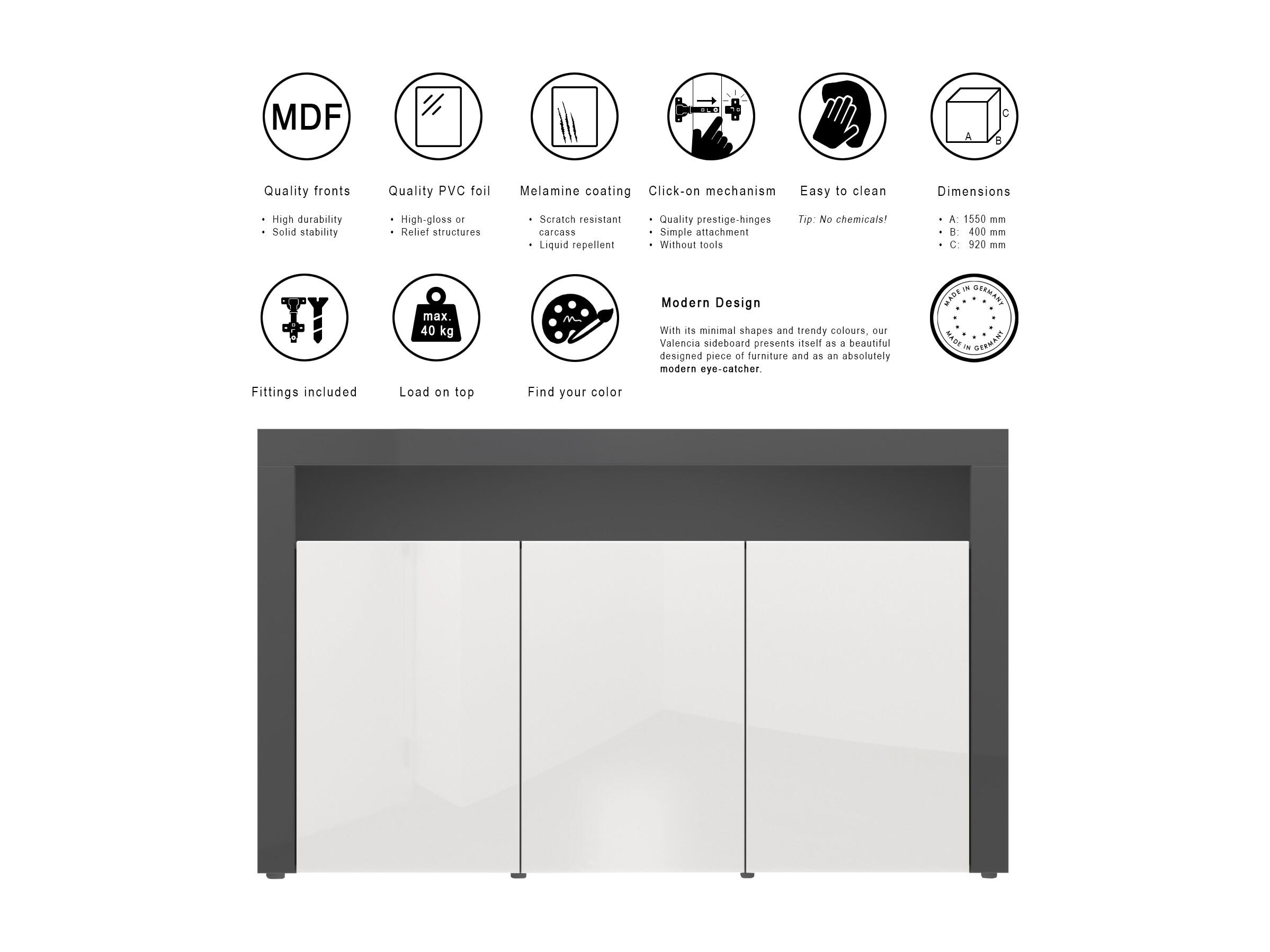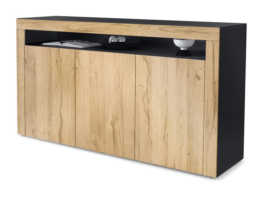 Buffet Valencia, Commode avec 3 portes et 1 compartiment ouvert, Noir mat/chêne nature/chêne nature (155 x 92 x 40 cm)