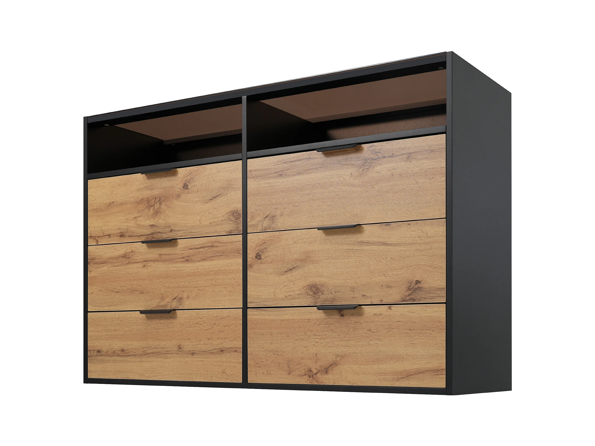 Buffet verre teinté ambre effet bois 6 tiroirs 2 vitrines poignées noirs 120x40x80cm STOKVANS