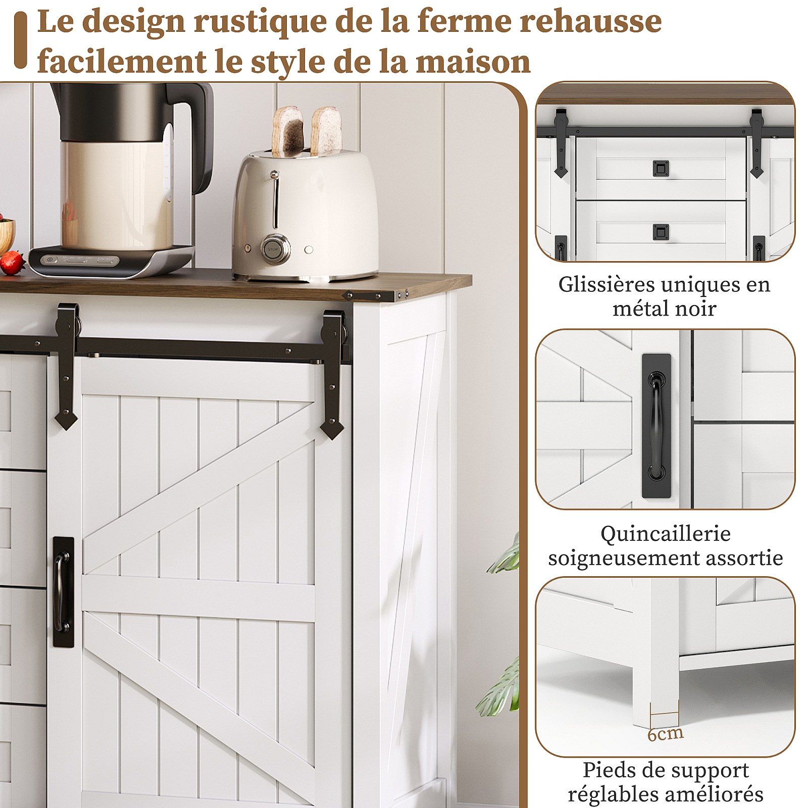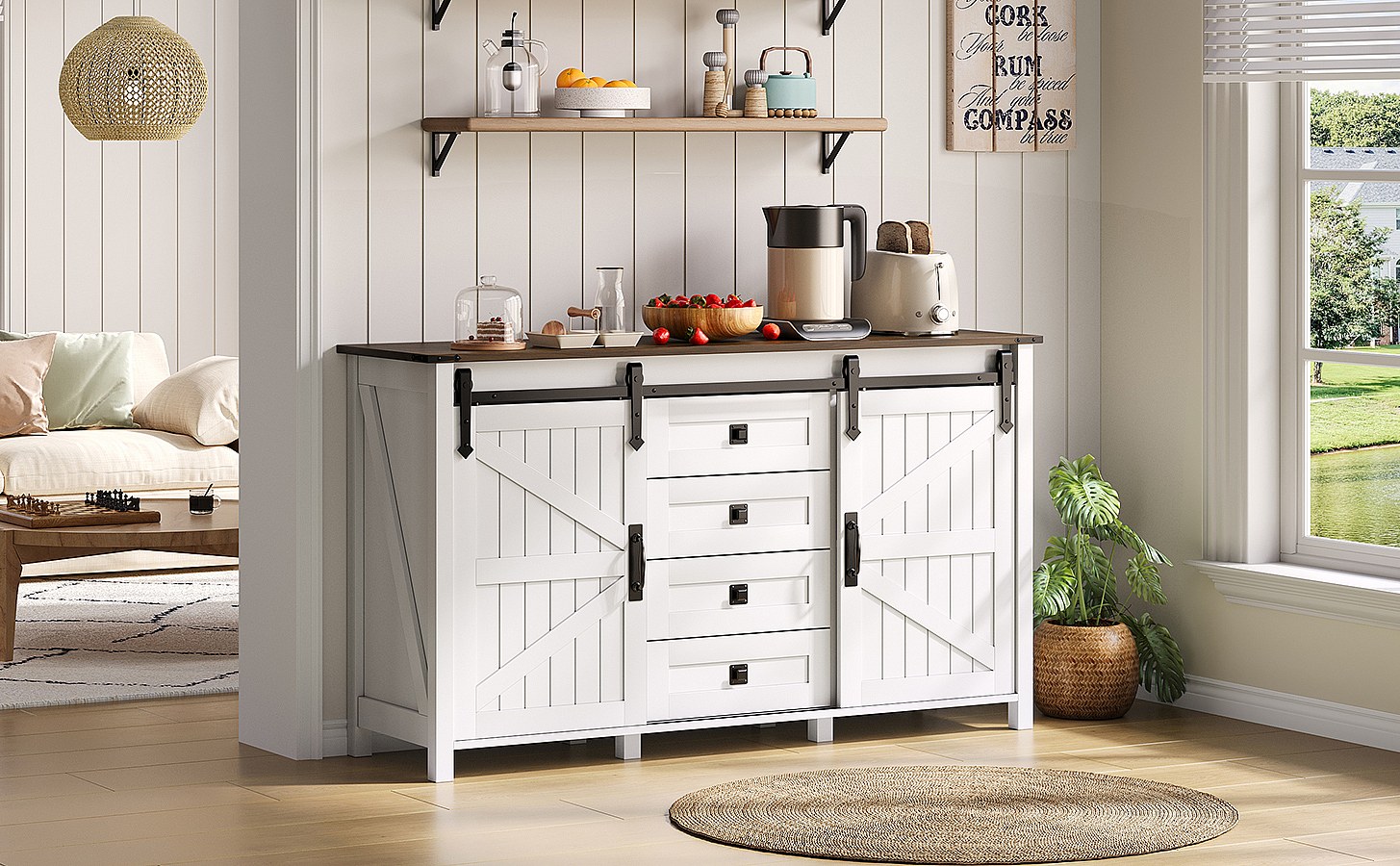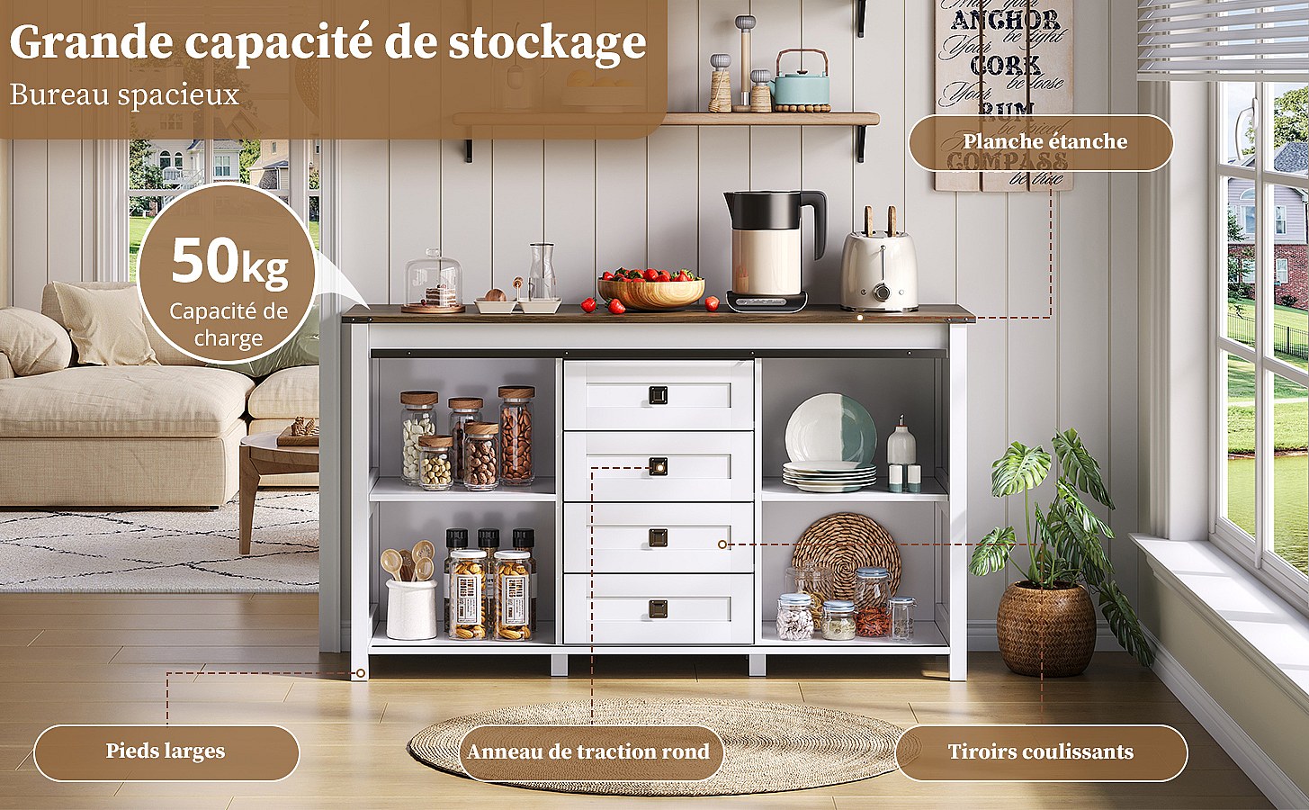 Buffet vintage blanc 137 cm avec 4 tiroirs et portes coulissantes – Parfait pour cuisine, salle à manger ou salon