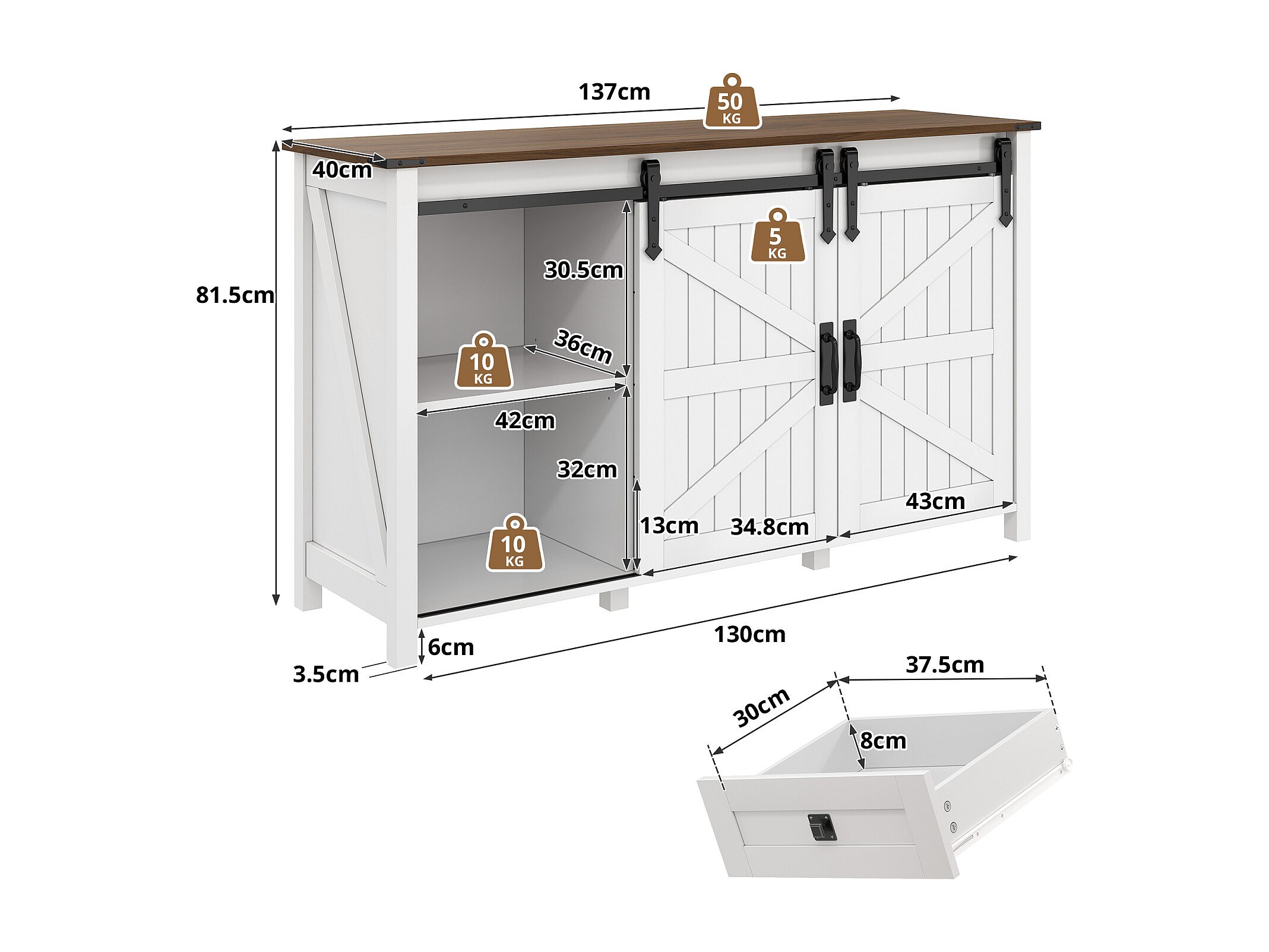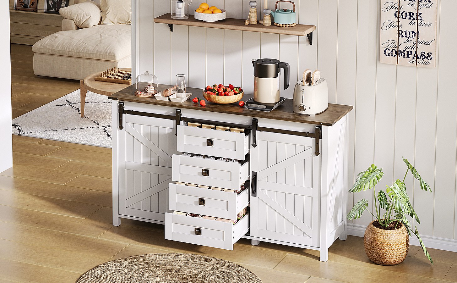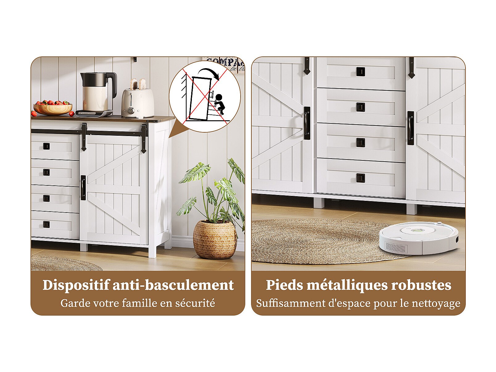 Buffet vintage blanc 137 cm avec 4 tiroirs et portes coulissantes – Parfait pour cuisine, salle à manger ou salon
