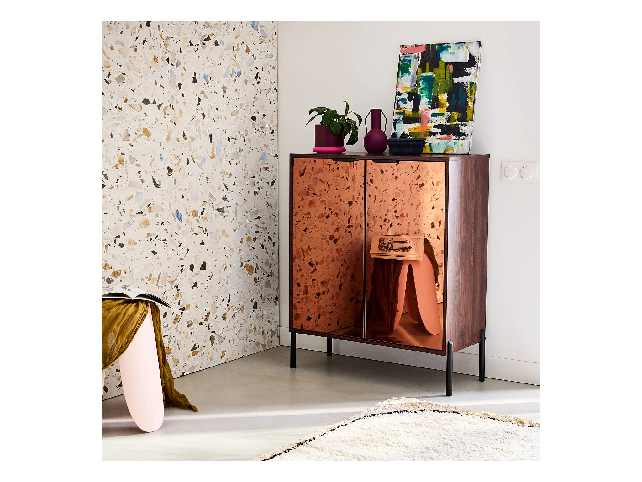 URBAN MEUBLE Buffet effet bois noyer avec 3 portes en rotin poignées pieds dorés 129,8x40x76cm