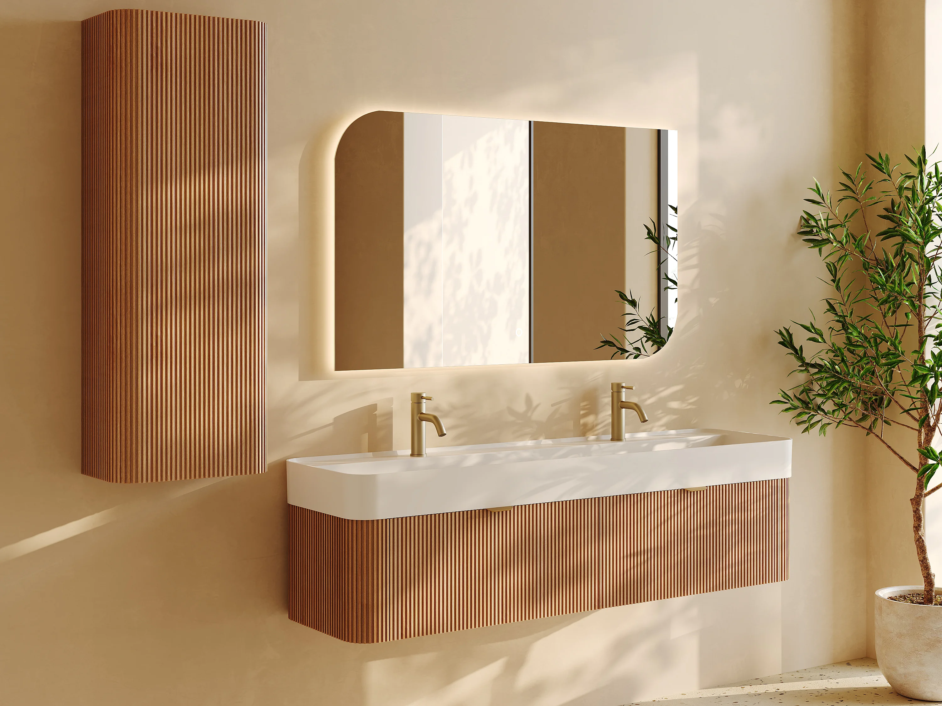 Meuble de salle de bain suspendu strié en bois de frêne avec double vasque à encastrer et colonne - Naturel clair - 150 cm - BULMAS