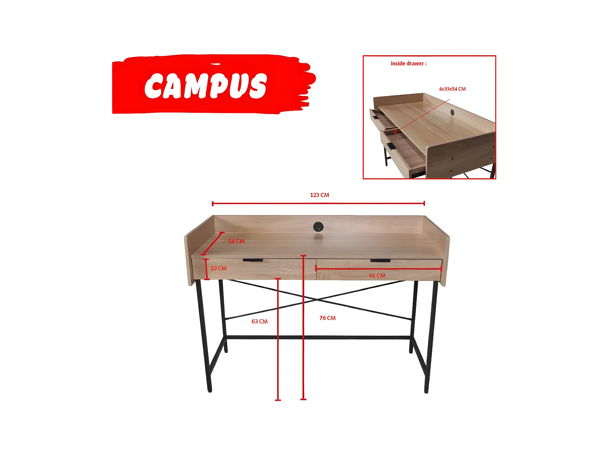 Bureau CAMPUS 123x54cm / Décor Chêne blanchi et métal noir