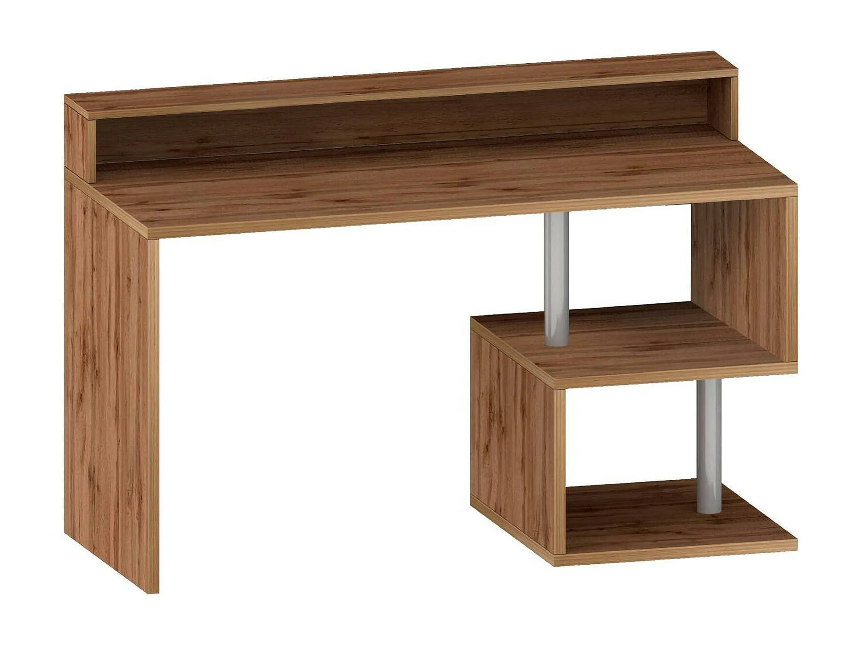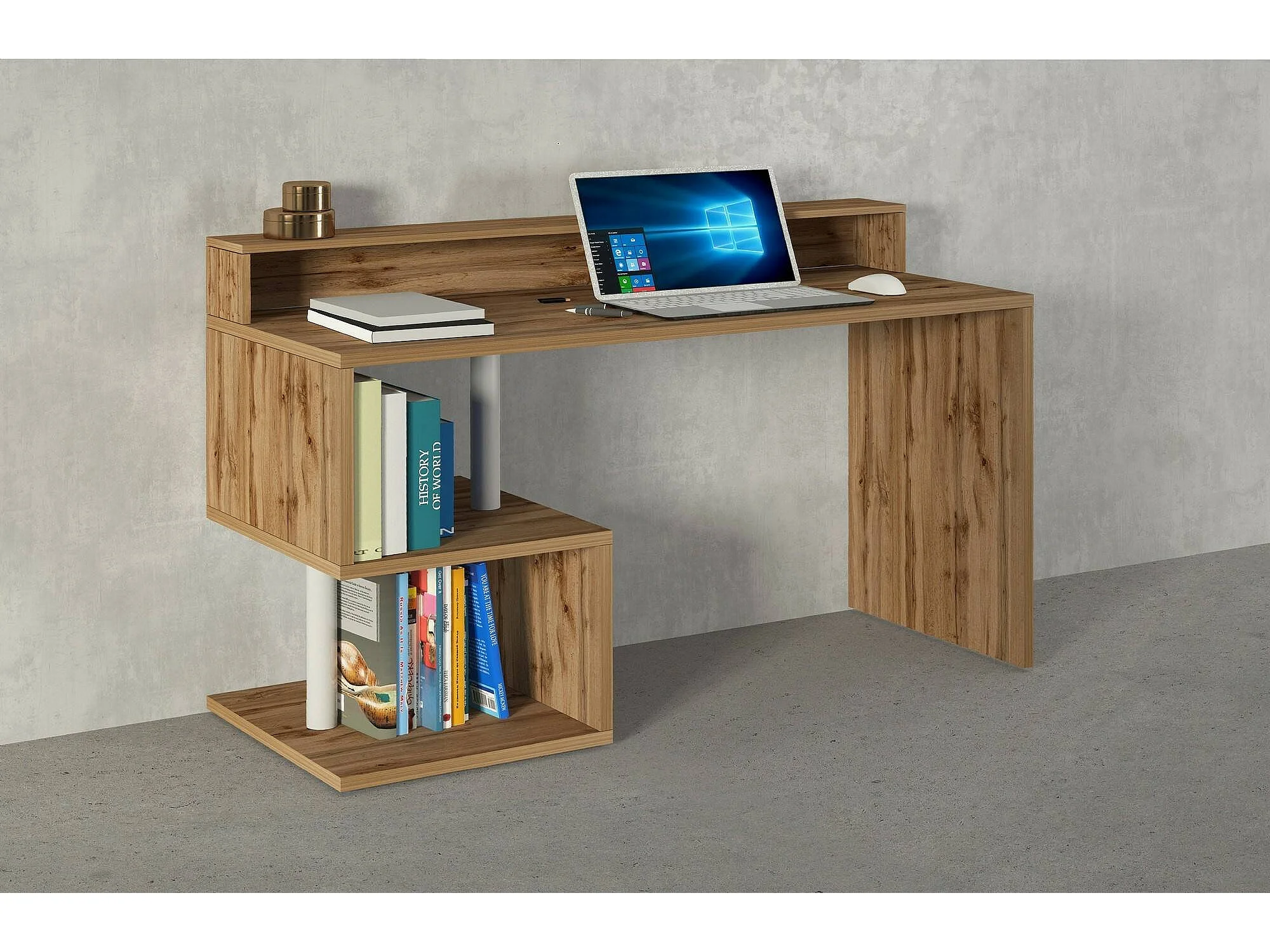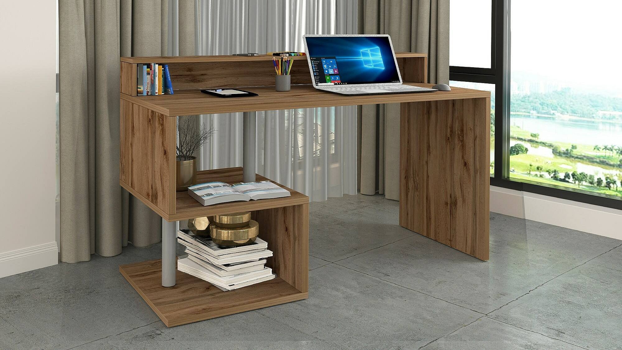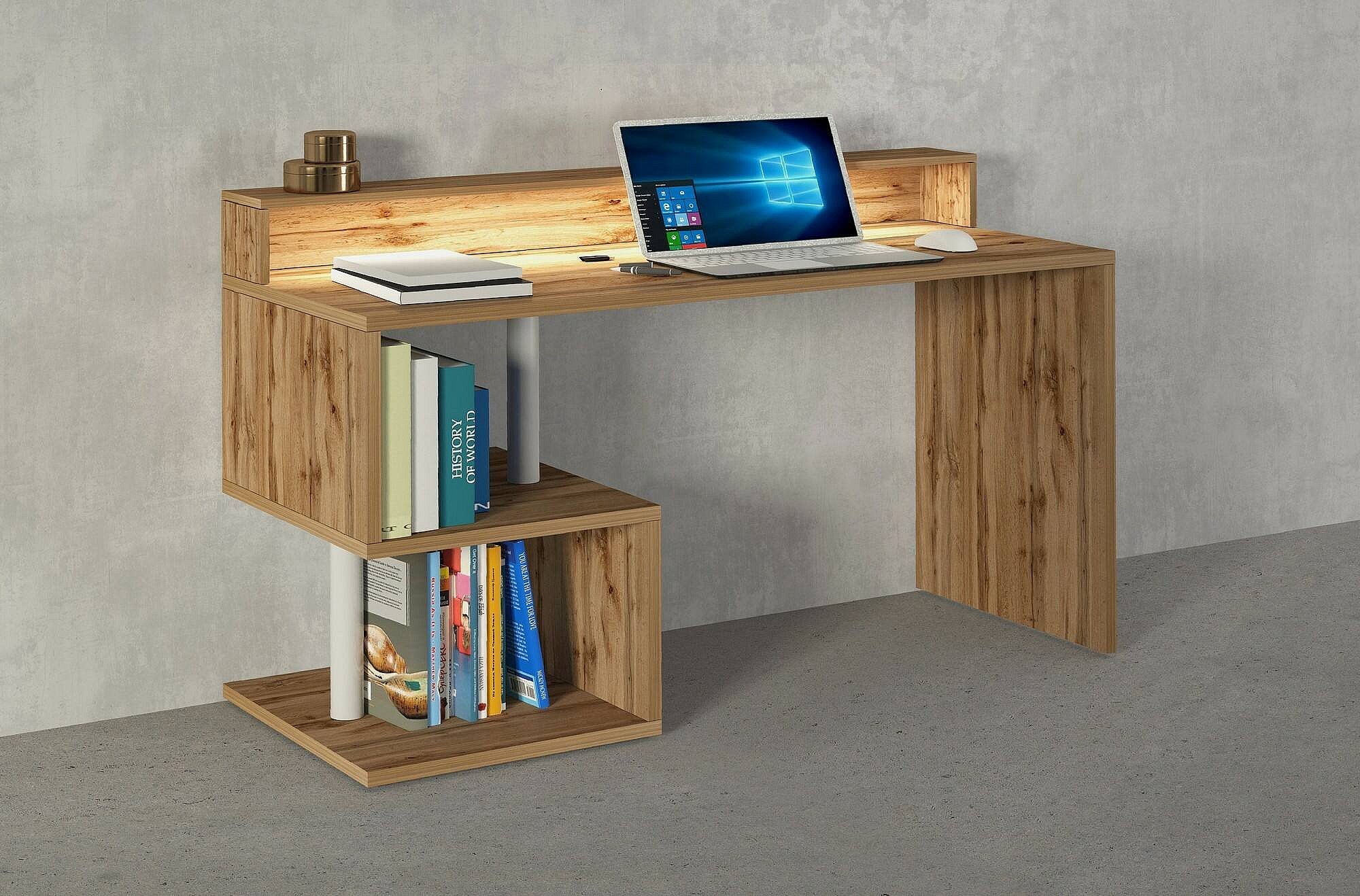 Bureau Alain, Bureau linéaire avec étagères de rangement avec lampes LED, Bureau polyvalent avec plateau, 140x60h93 cm, Chêne