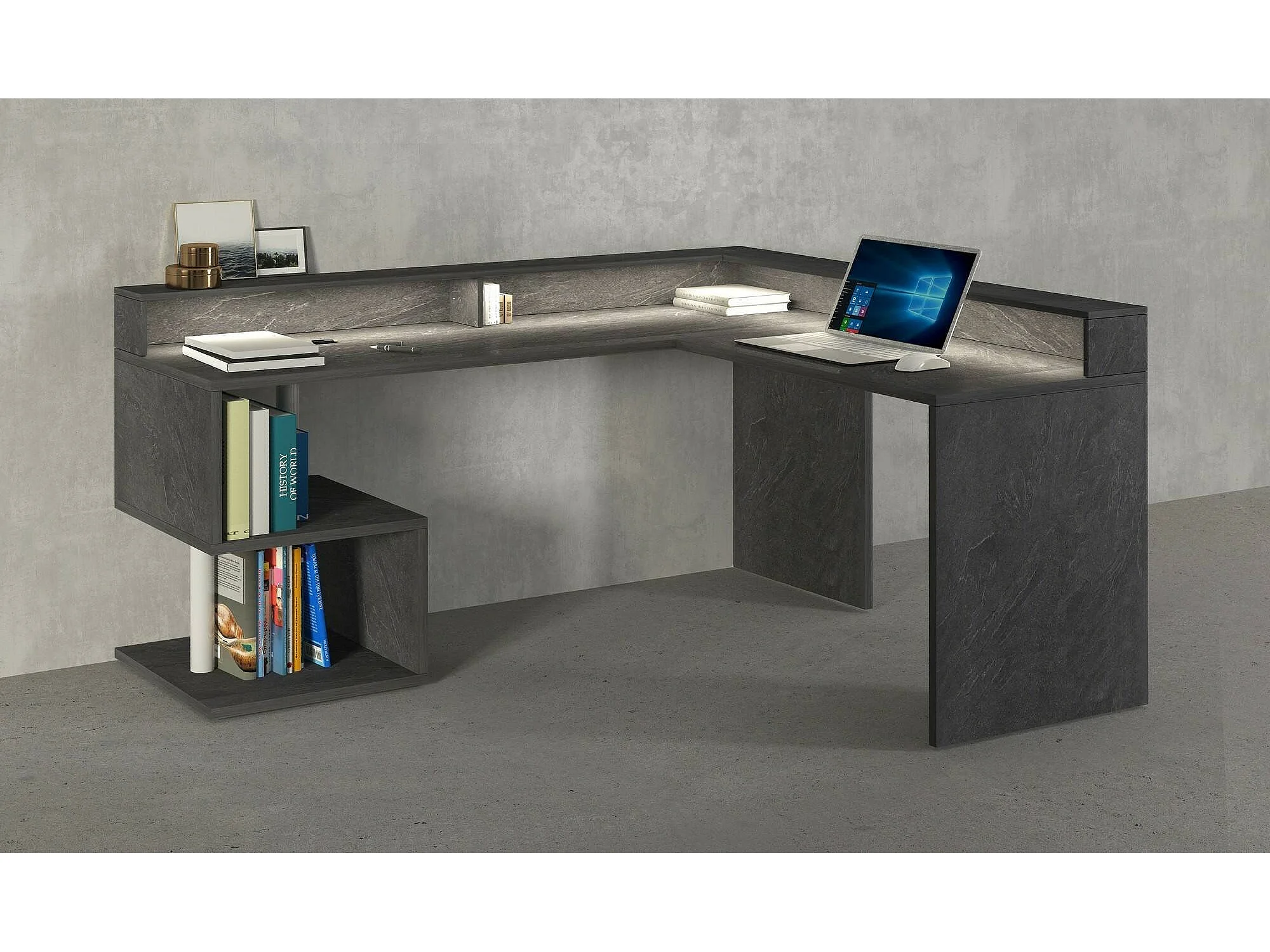 Bureau Albert, Bureau d'angle avec étagères de rangement avec lampes LED, Bureau polyvalent avec plateau, 180x60h93 cm, Ardoise