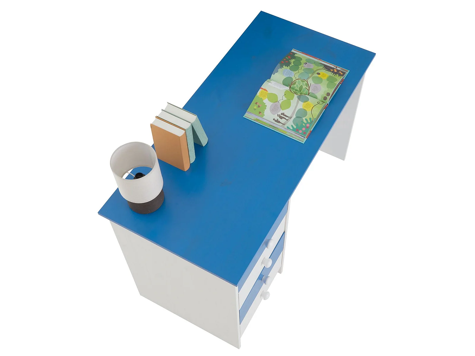 Bureau ARNE pour enfant ou adulte multi rangements, avec 4 tiroirs, en pin massif lasuré blanc et bleu