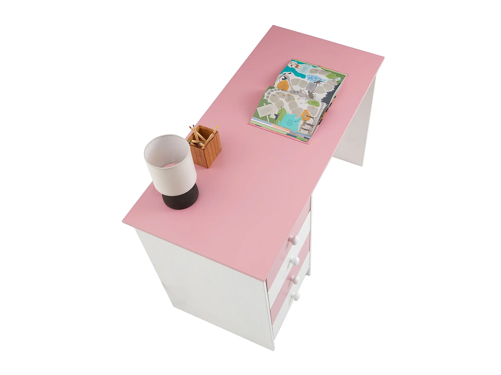 Bureau ARNE pour enfant ou adulte multi rangements, avec 4 tiroirs, en pin massif lasuré blanc et rose