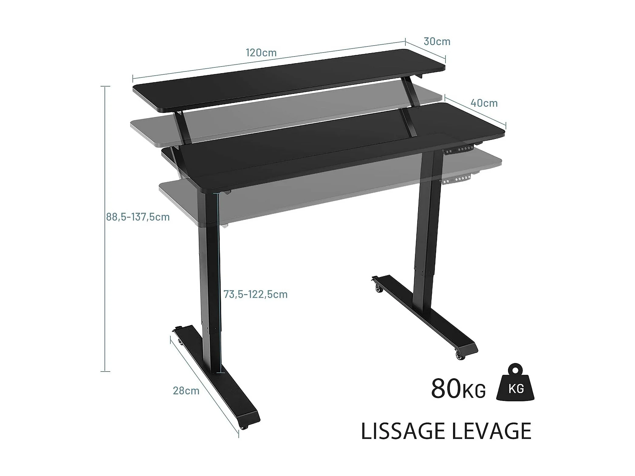 Bureau Assis-Debout Électrique, Bureau Réglable en Hauteur à 2 Niveaux avec Roues, 2 Plateaux de Table 120 x 68 cm et Réglage de la Mémoire, Charge Max 80KG (Noir)