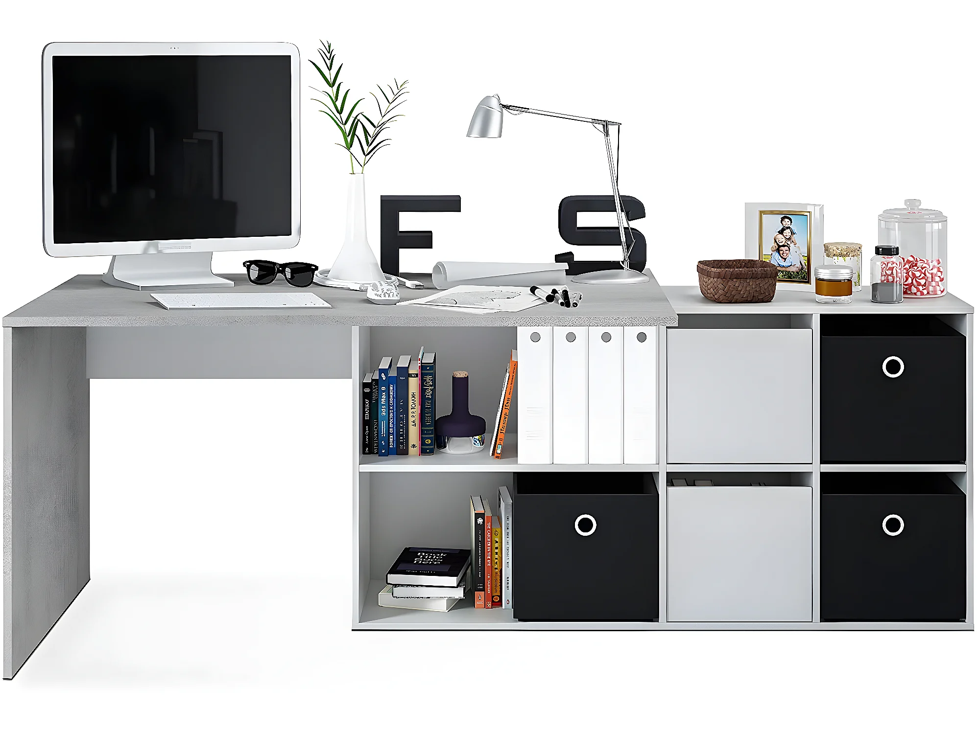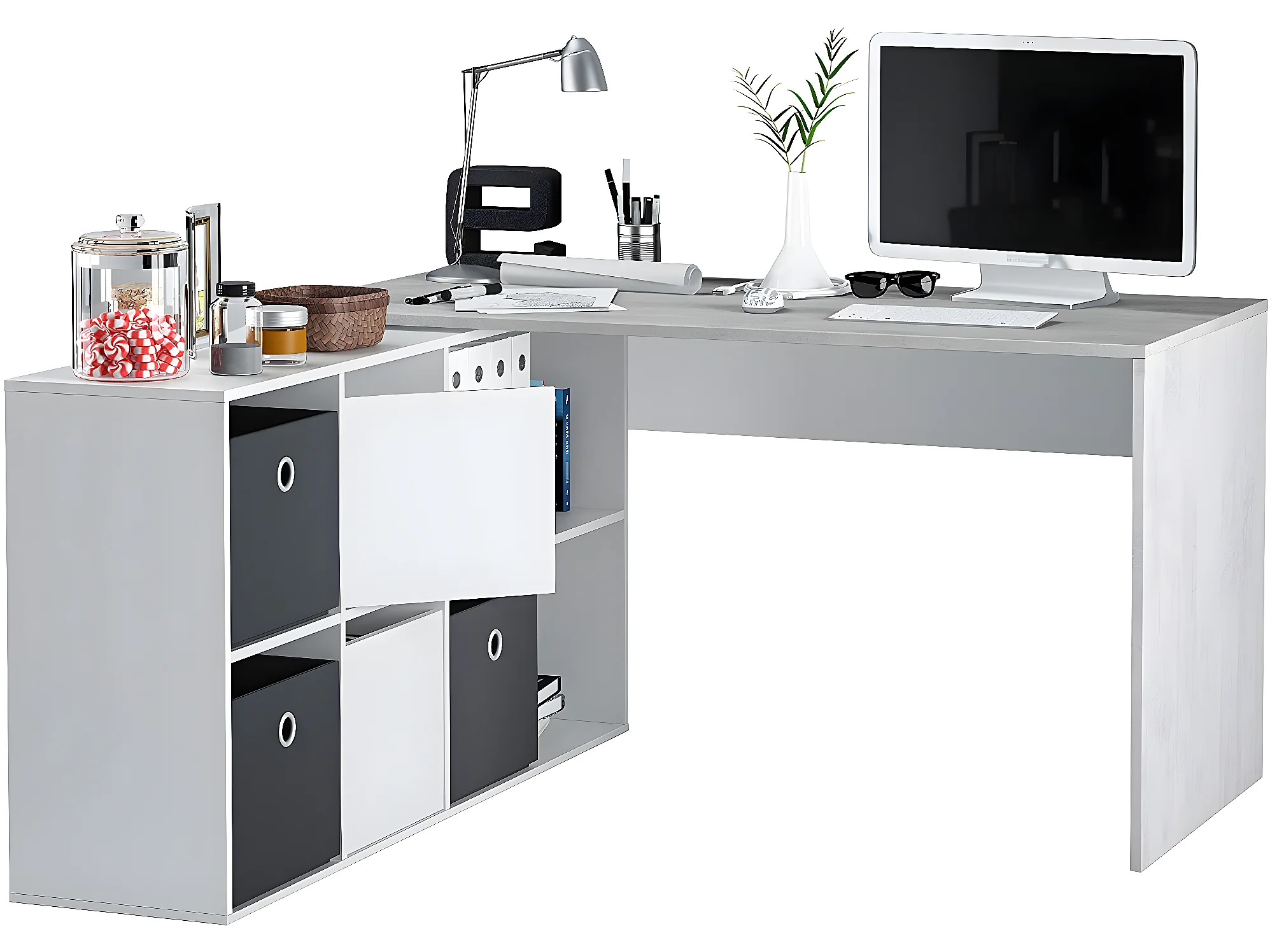 Bureau avec caisson coloris Blanc artic / béton- Hauteur 74 x Longueur 136 x 139 cm