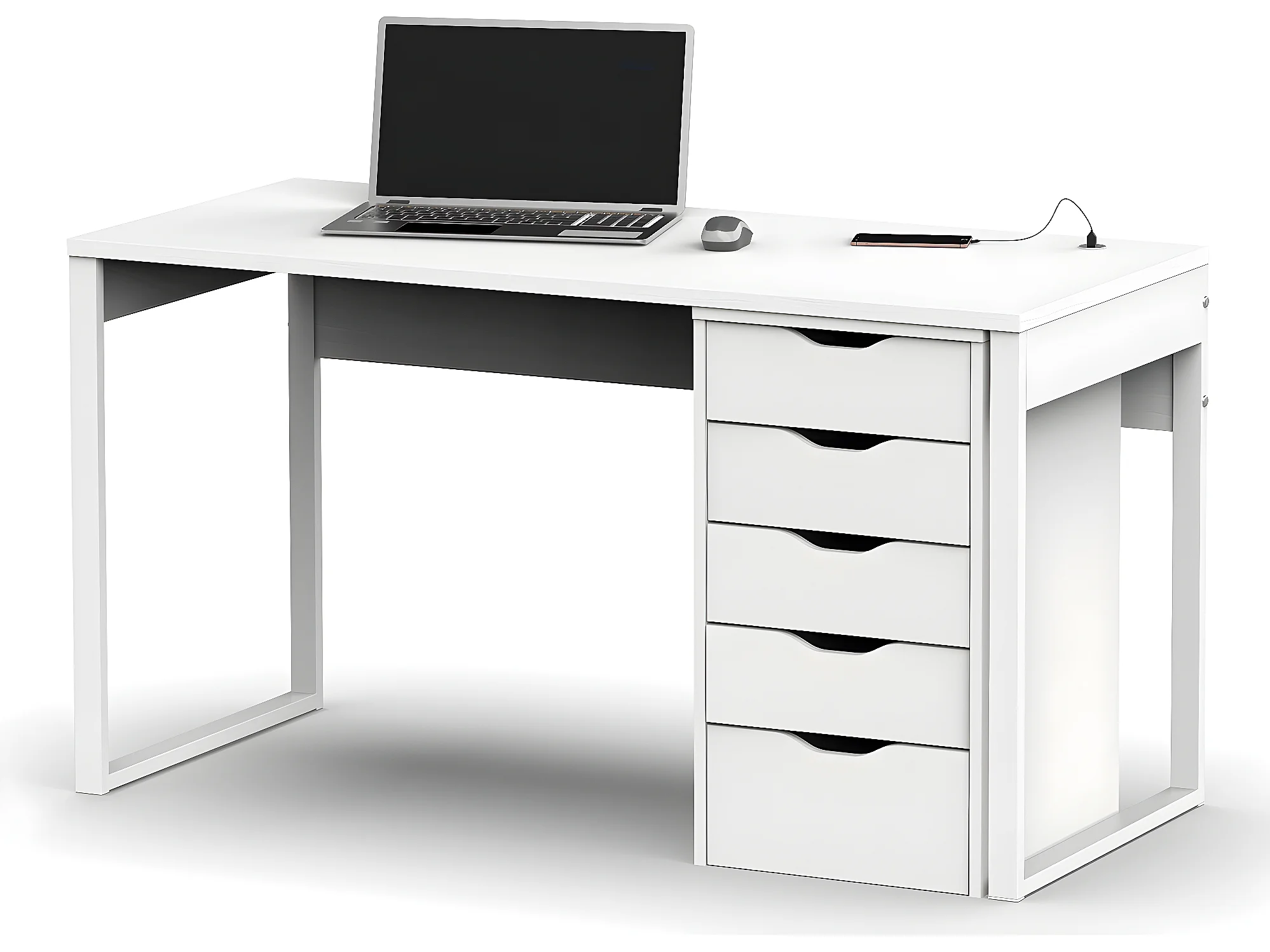 Bureau avec commode de rangement coloris blanc - Hauteur 76 x Longueur 135 x Profondeur 60 cm / Hauteur 71 x Longueur 40 x Profondeur 43 cm
