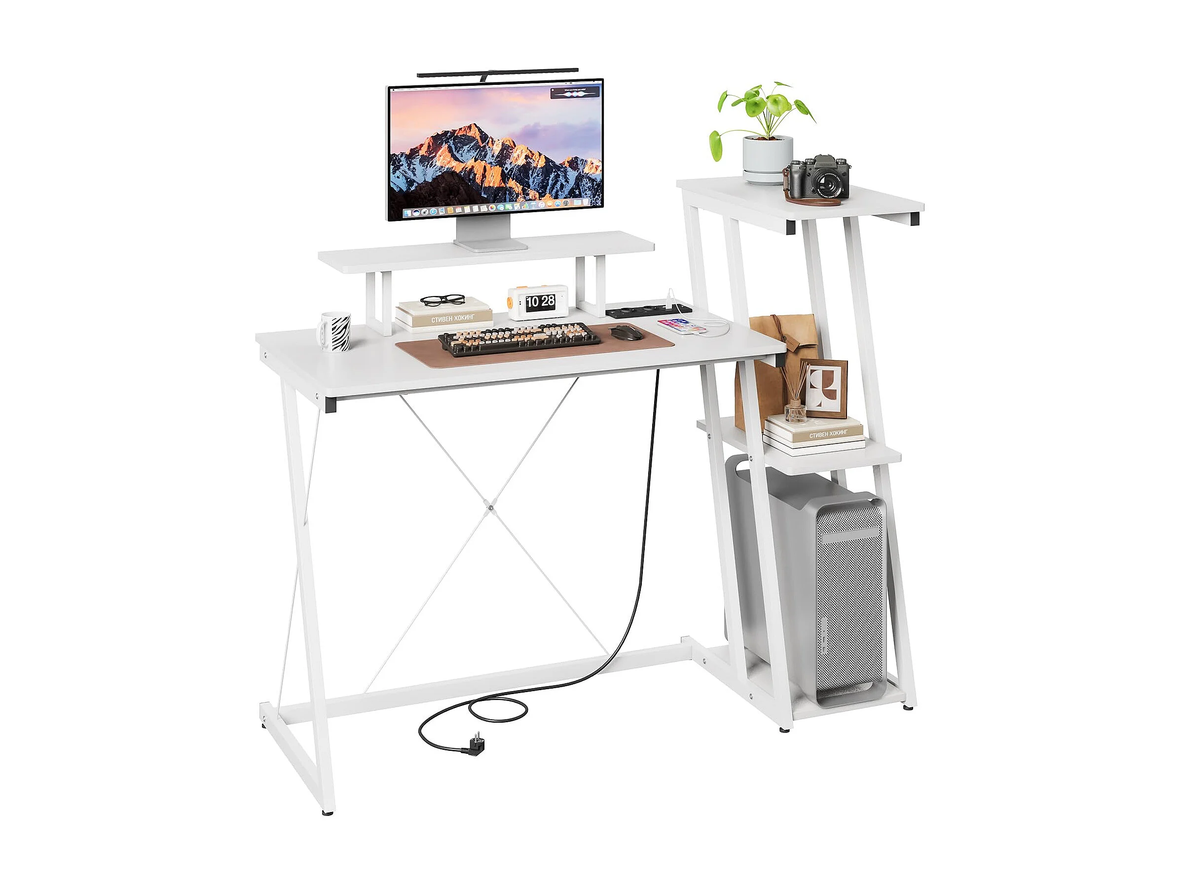 Bureau d'angle 120 cm avec étagère réversible, support d'écran, prise et ports USB, idéal pour maison ou bureau, usage jeu ou travail