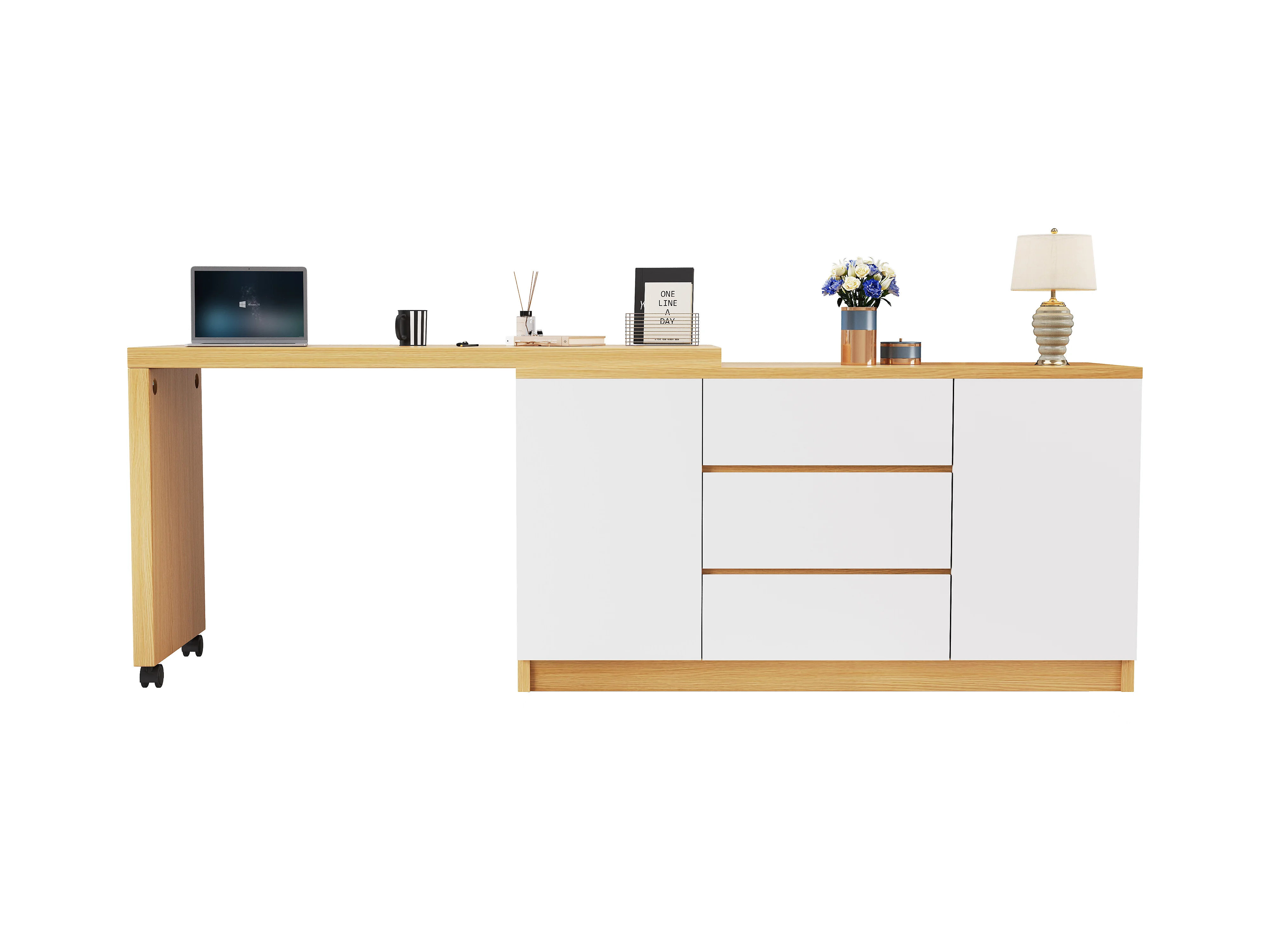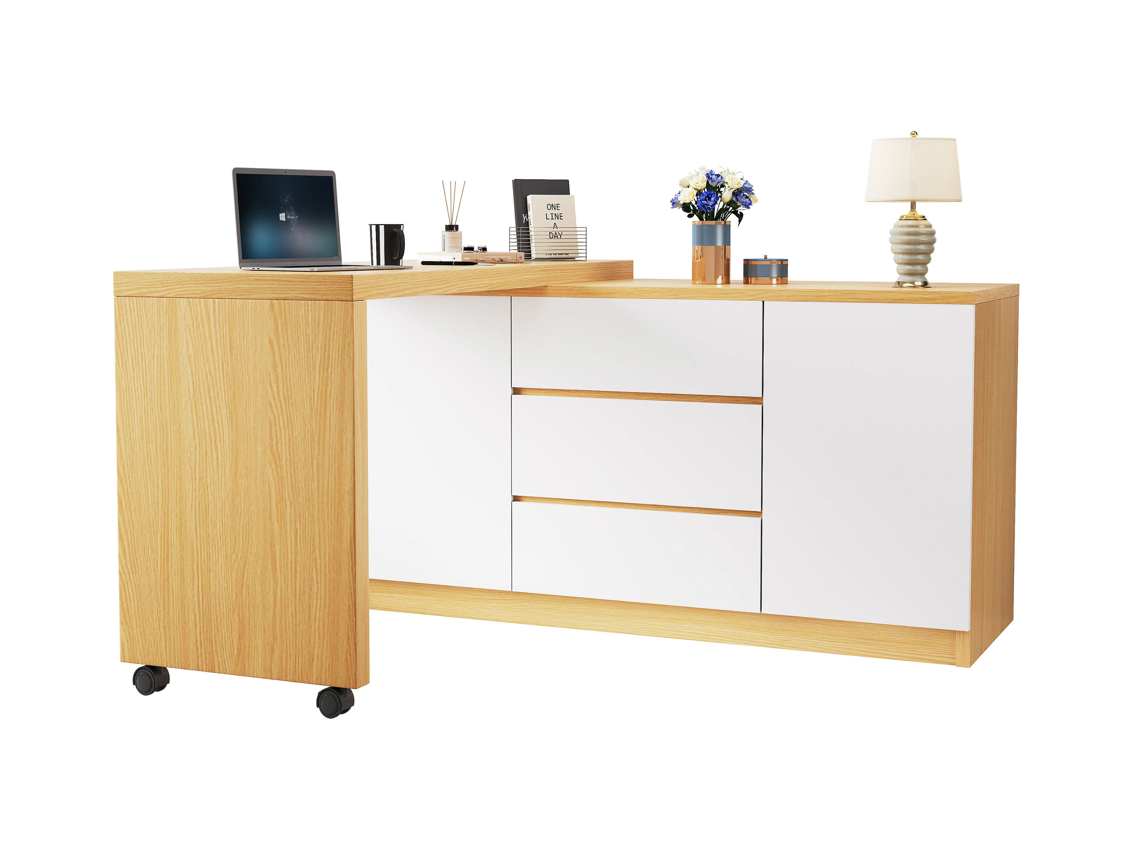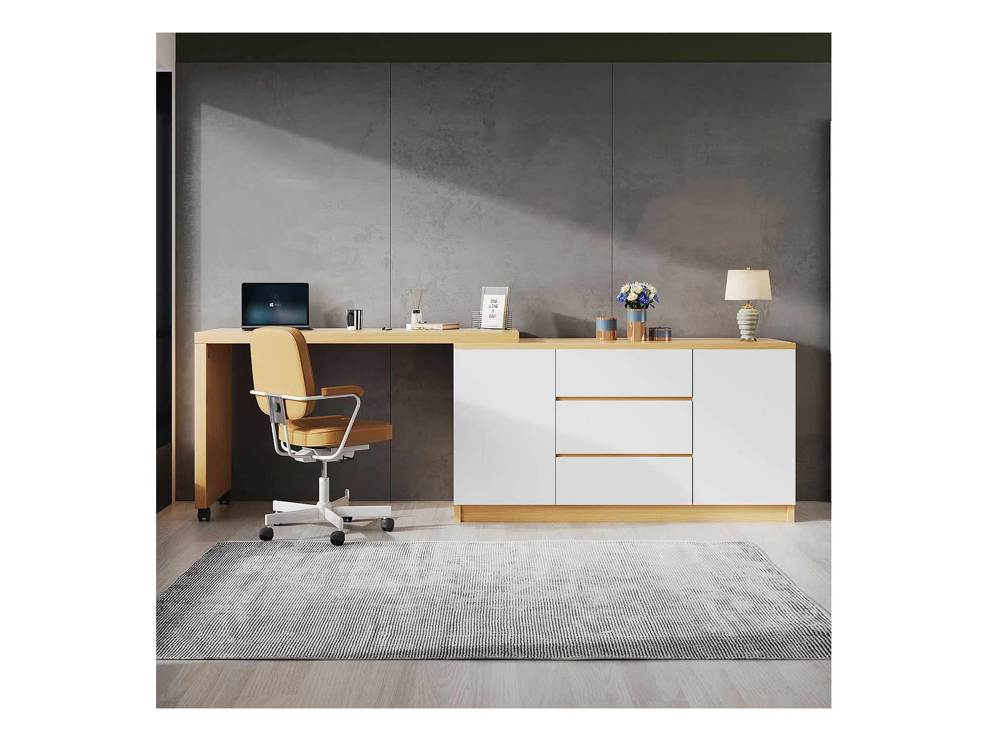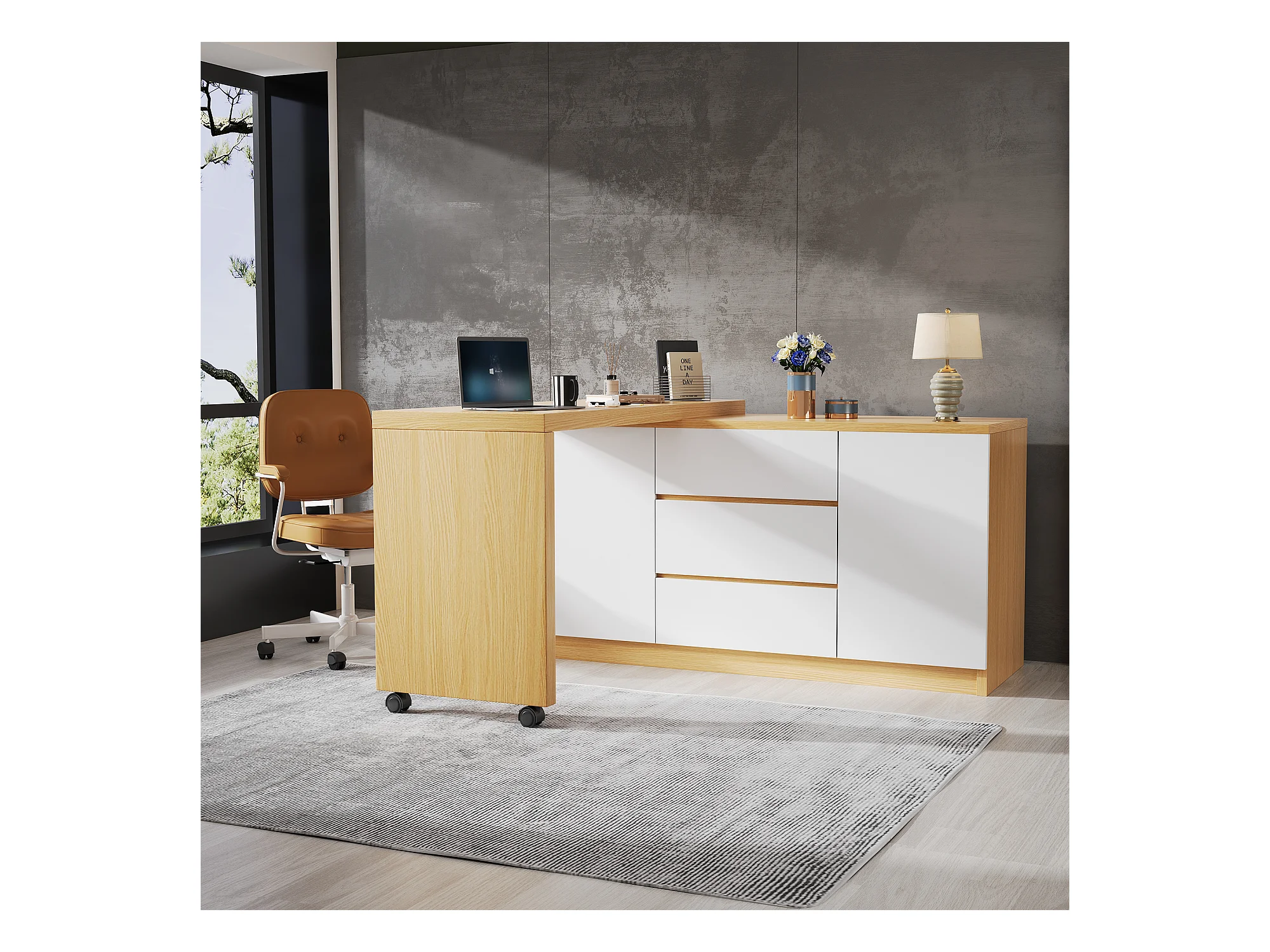 Bureau d'angle 120x50x76.5 cm - Plateau pivotant à 360° - 3 tiroirs et 2 portes - Avec roulettes verrouillables - Naturel + Blanc