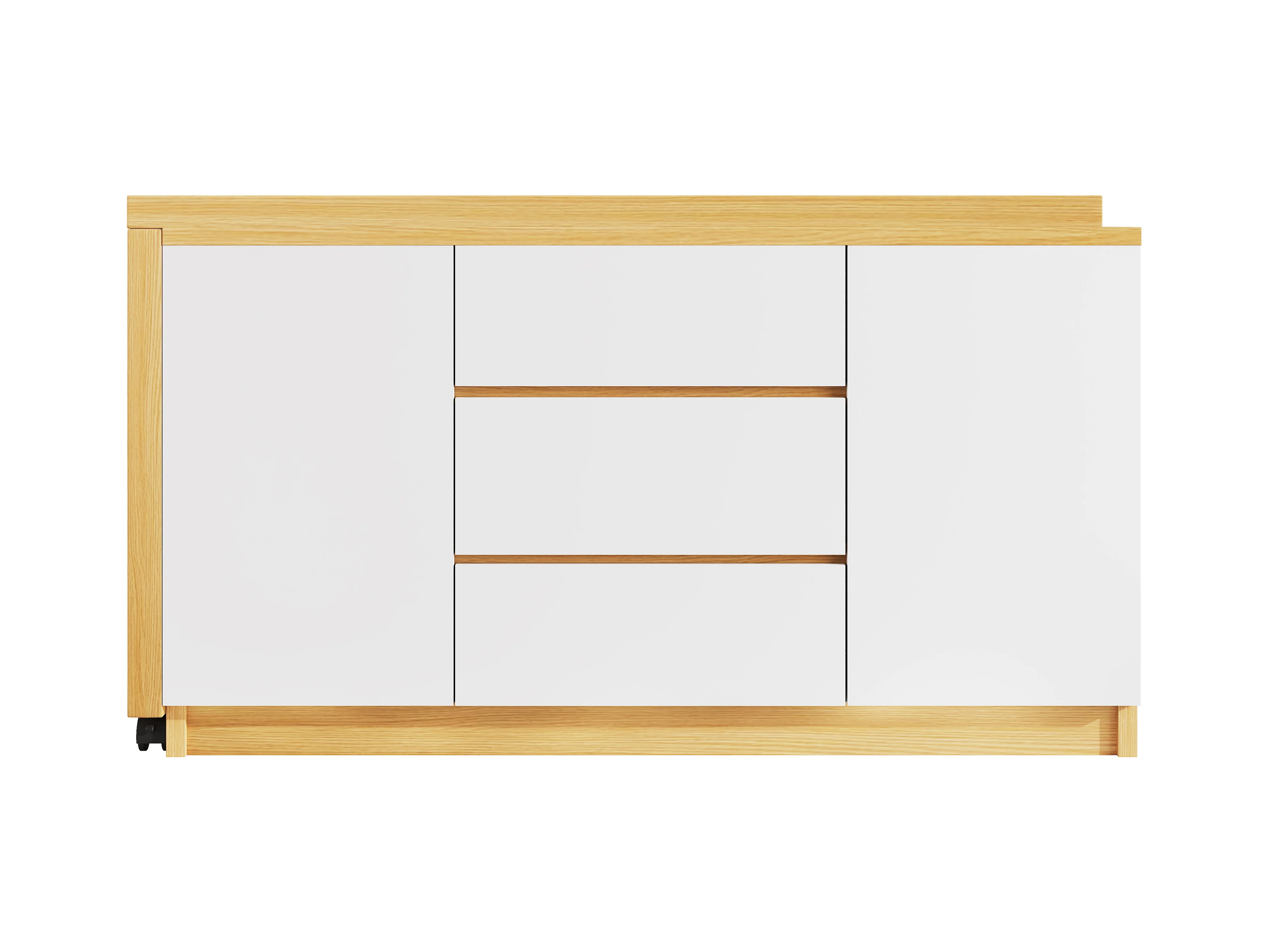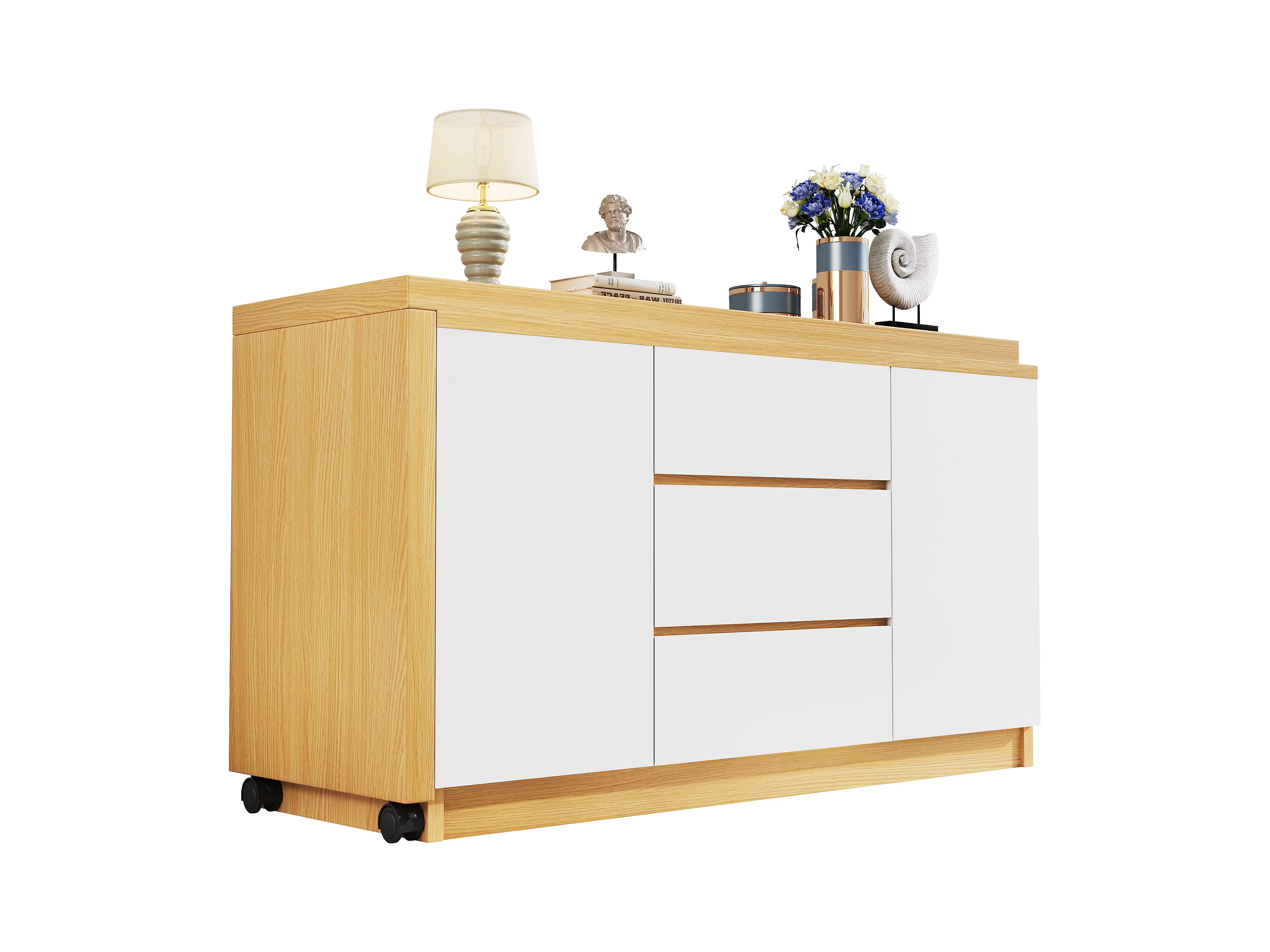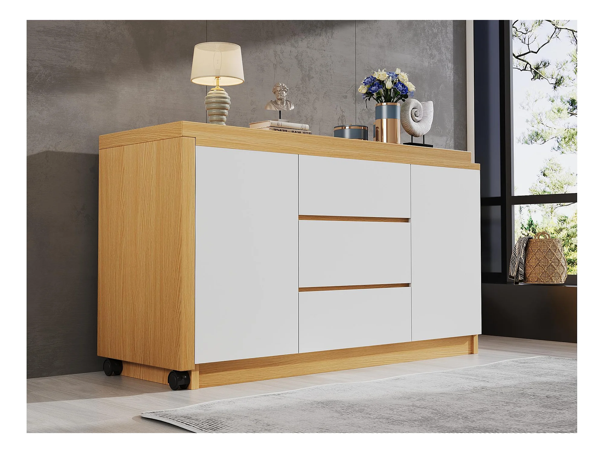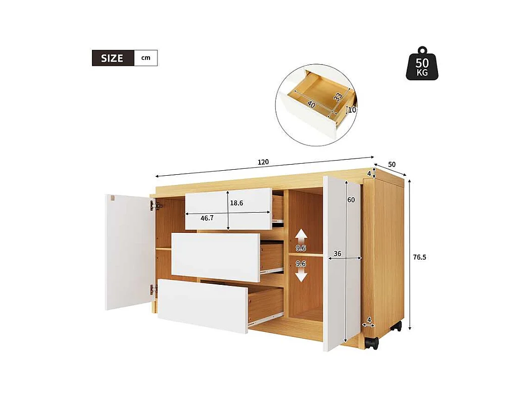 Bureau d'angle 120x50x76.5 cm - Plateau pivotant à 360° - 3 tiroirs et 2 portes - Avec roulettes verrouillables - Naturel + Blanc