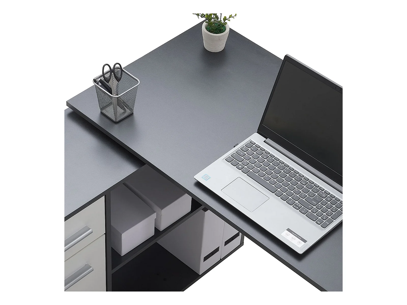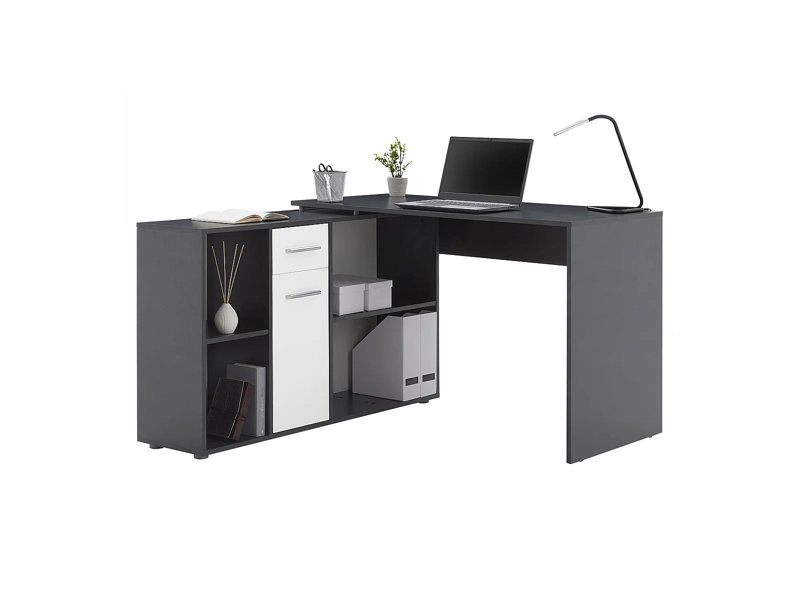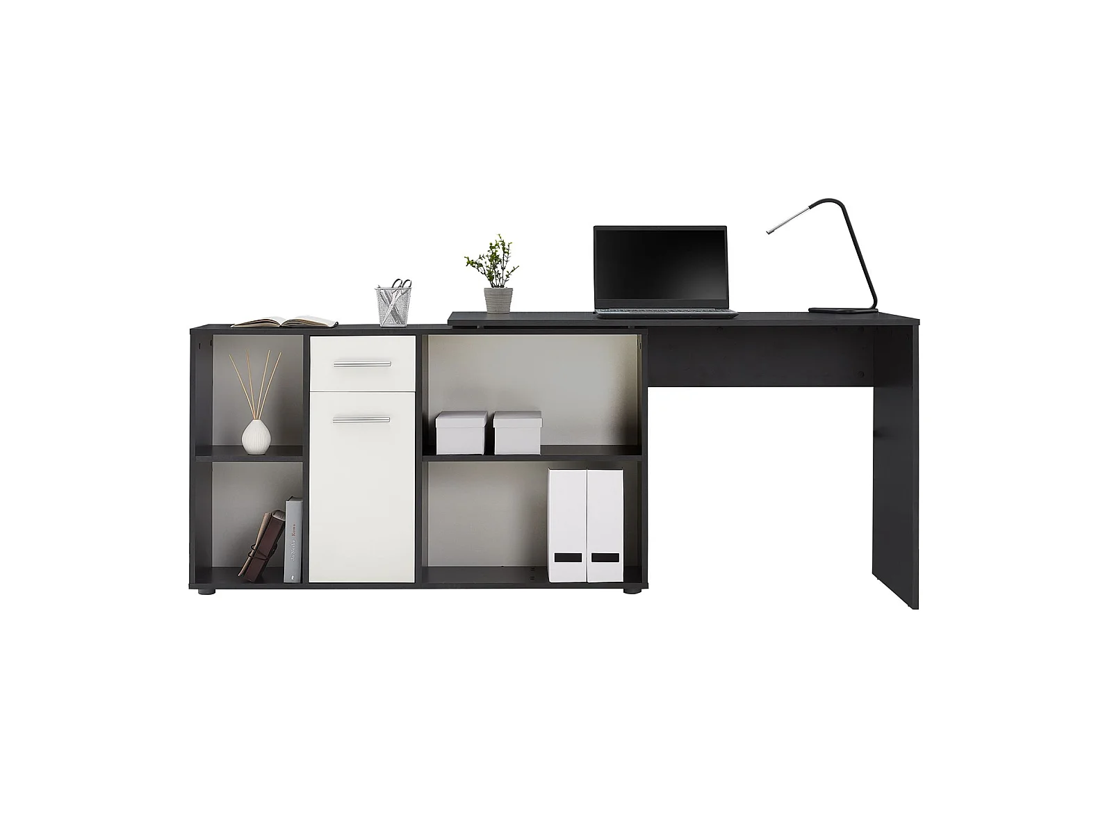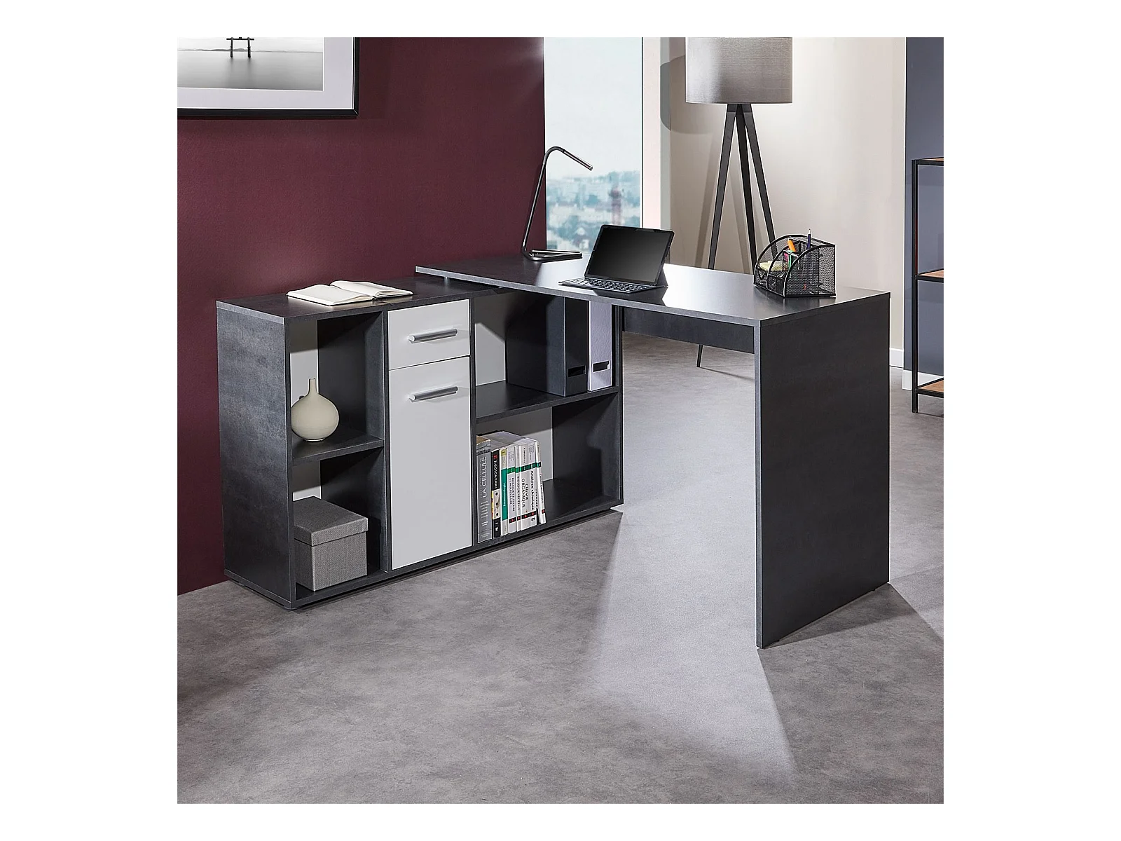 Bureau d'angle CARMEN table avec meuble de rangement intégré et modulable 4 étagères 1 porte et 1 tiroir, béton foncé/blanc