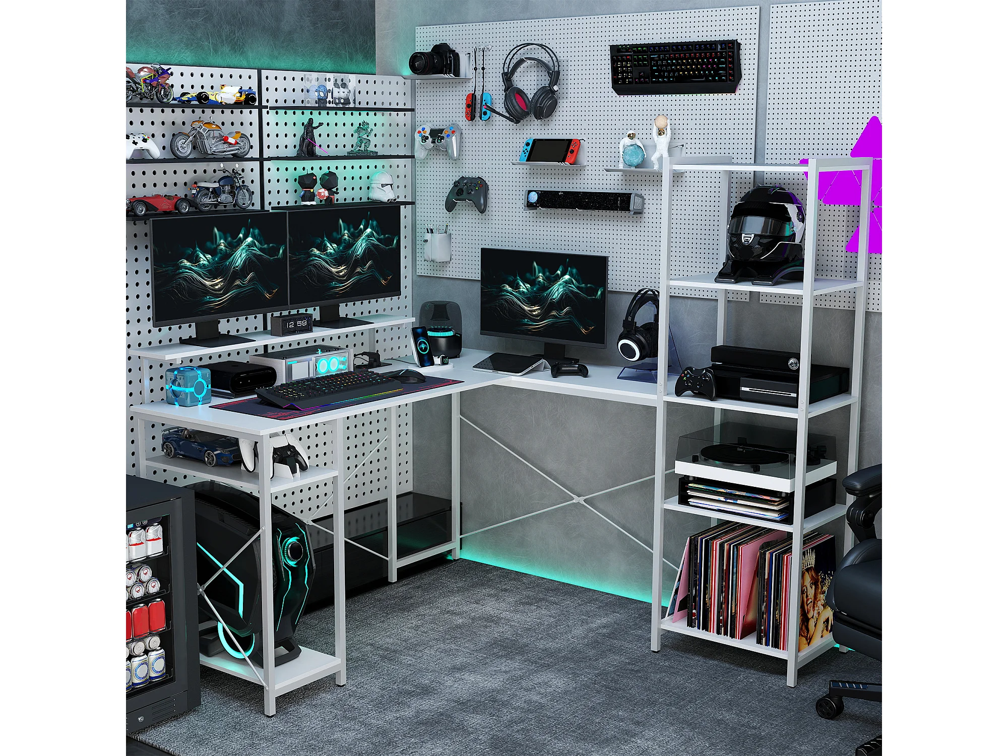 Bureau gamer, table de jeu coloris blanc, gris pastel - L. 160 x H. 92 x P. 115 cm