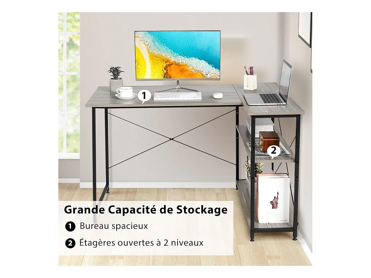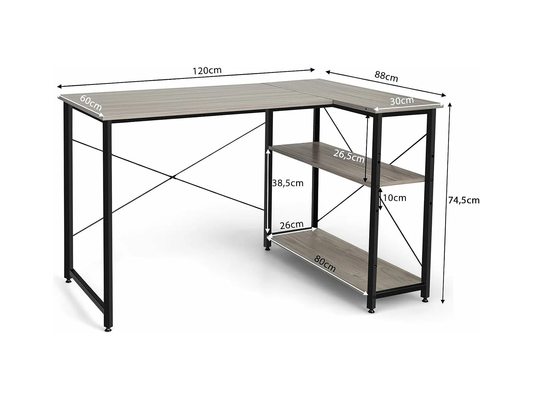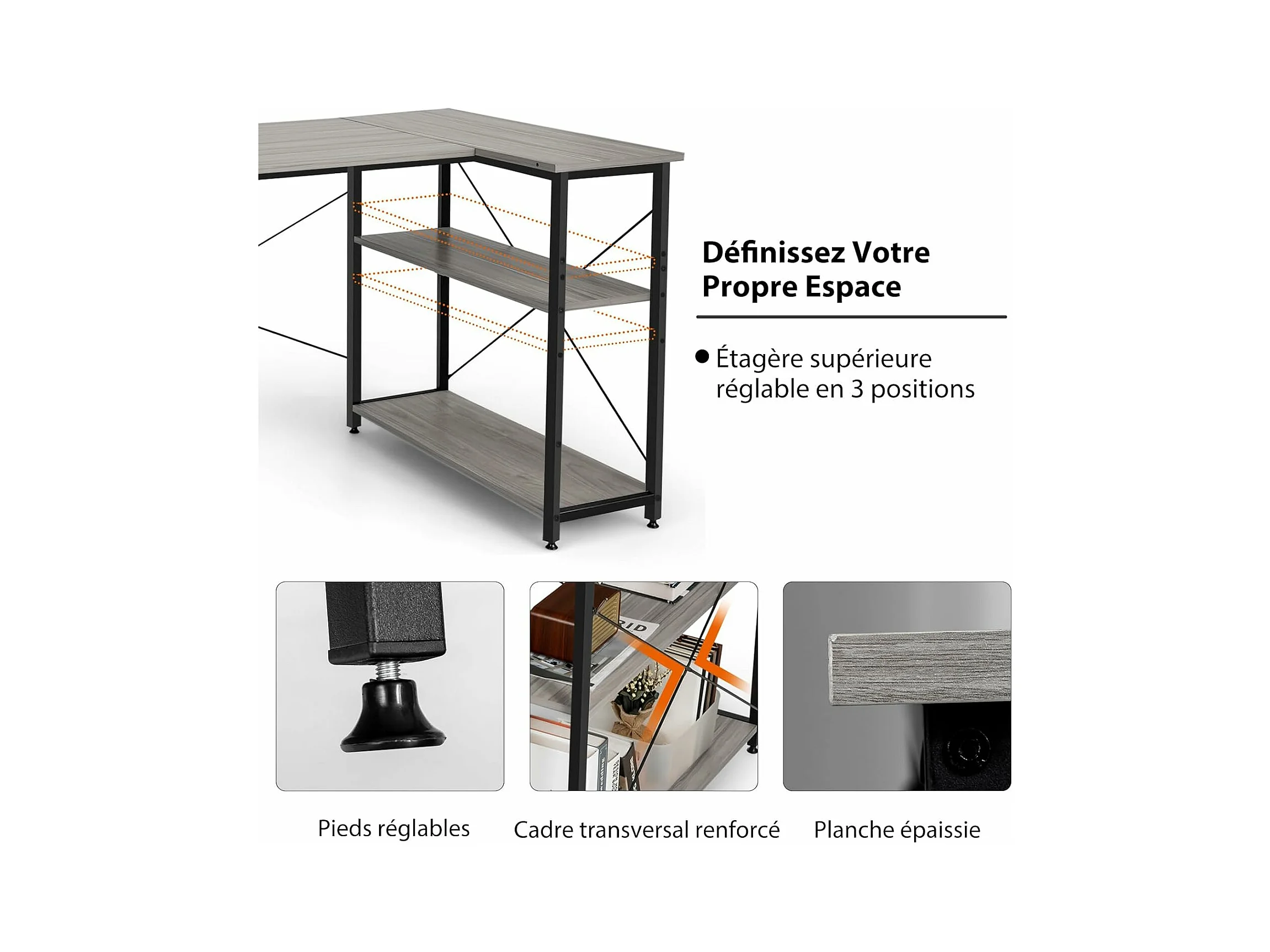Bureau d'angle en Forme L Réversible, Poste de Travail avec Étagères de Rangement, 120 x 88 x 74,5 cm, Peu Encombrant, pour Maison, Bureaux (Gris)