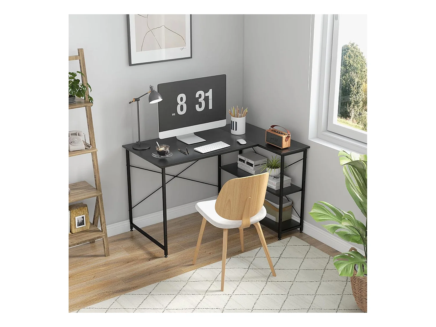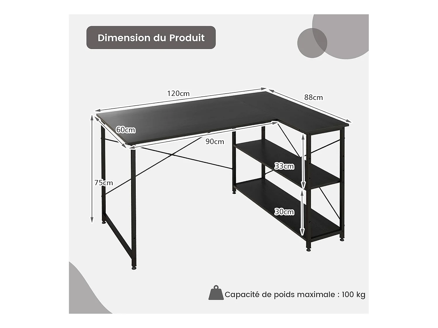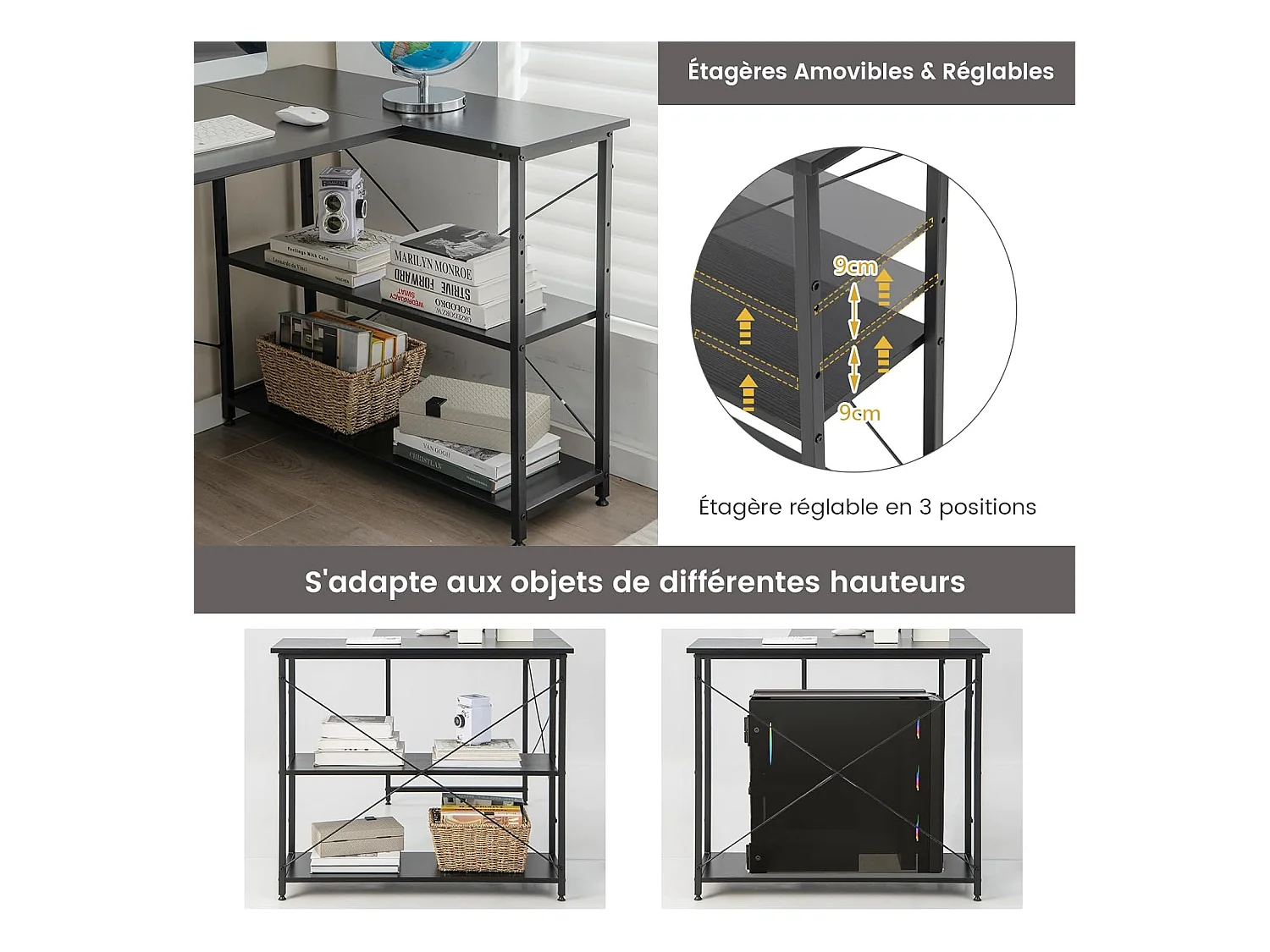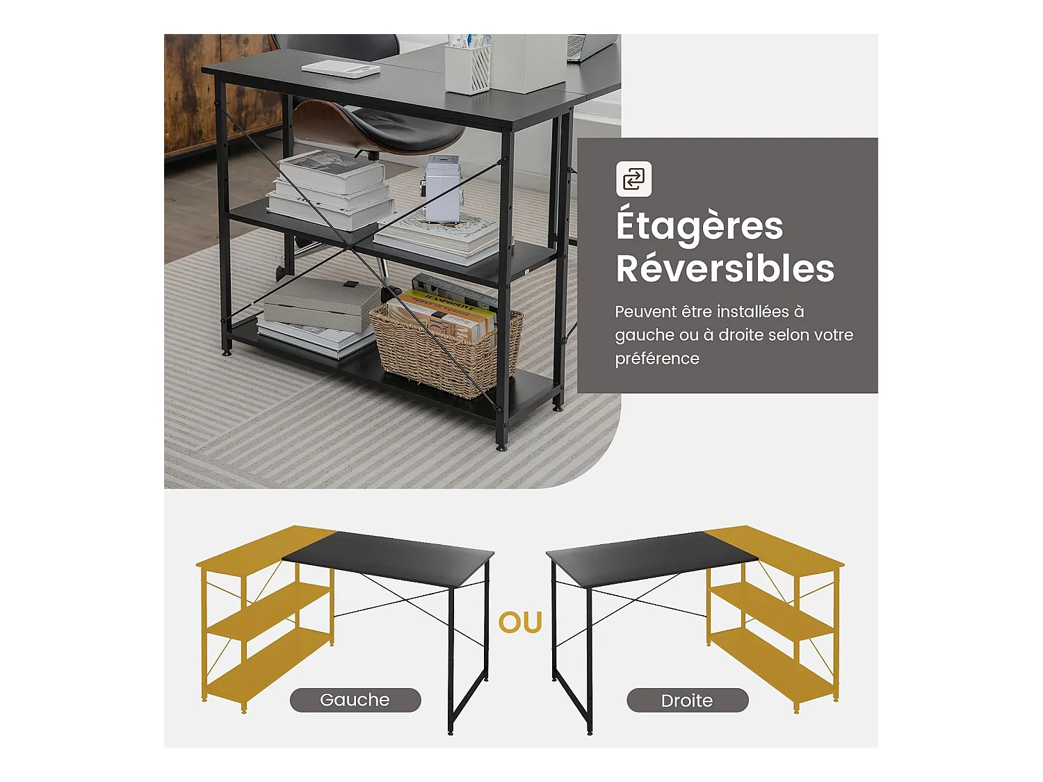 Bureau d'angle en Forme L Réversible, Poste de Travail avec Étagères de Rangement, 120 x 88 x 74,5 cm, Peu Encombrant, pour Maison, Bureaux (Noir)
