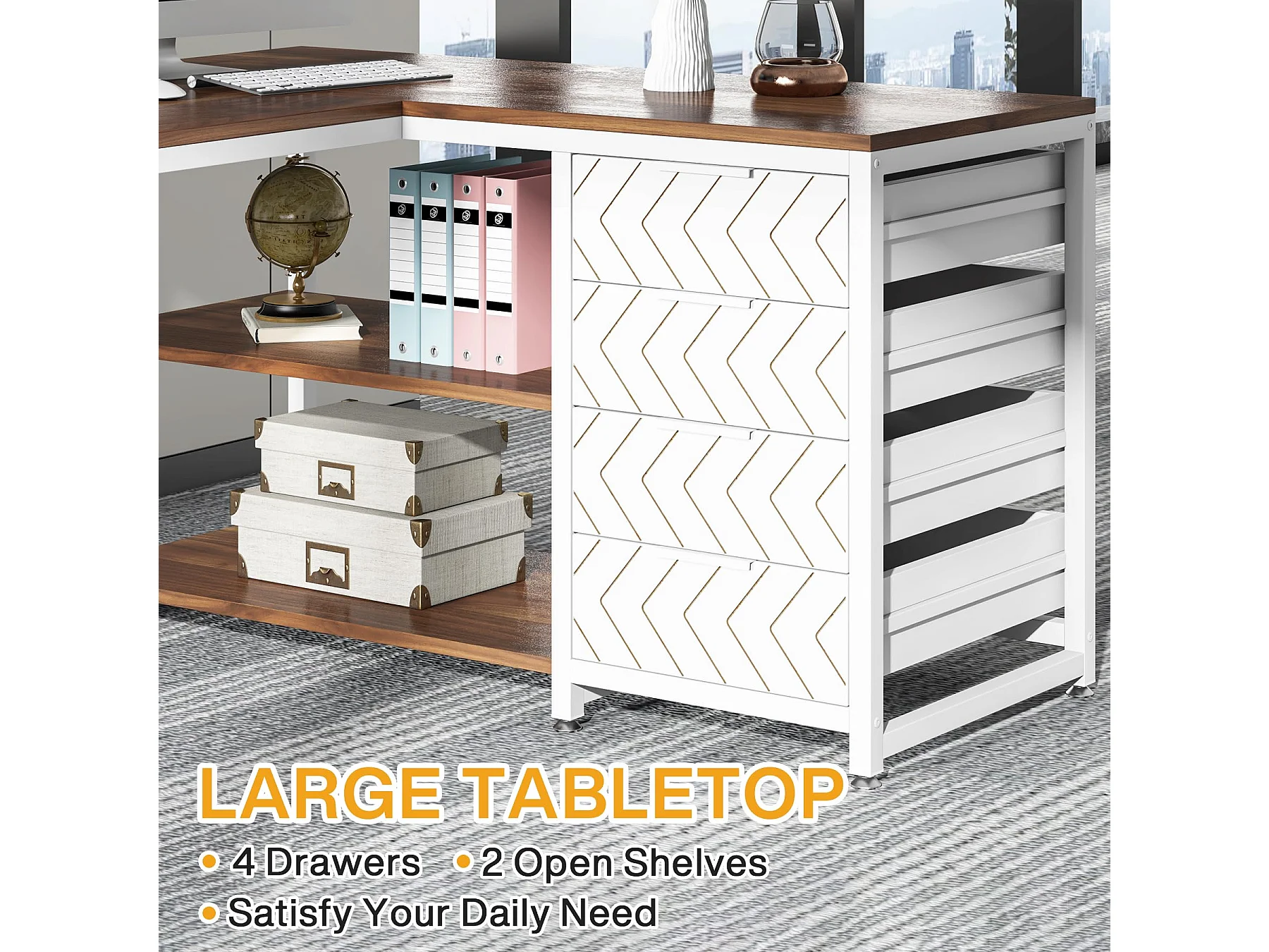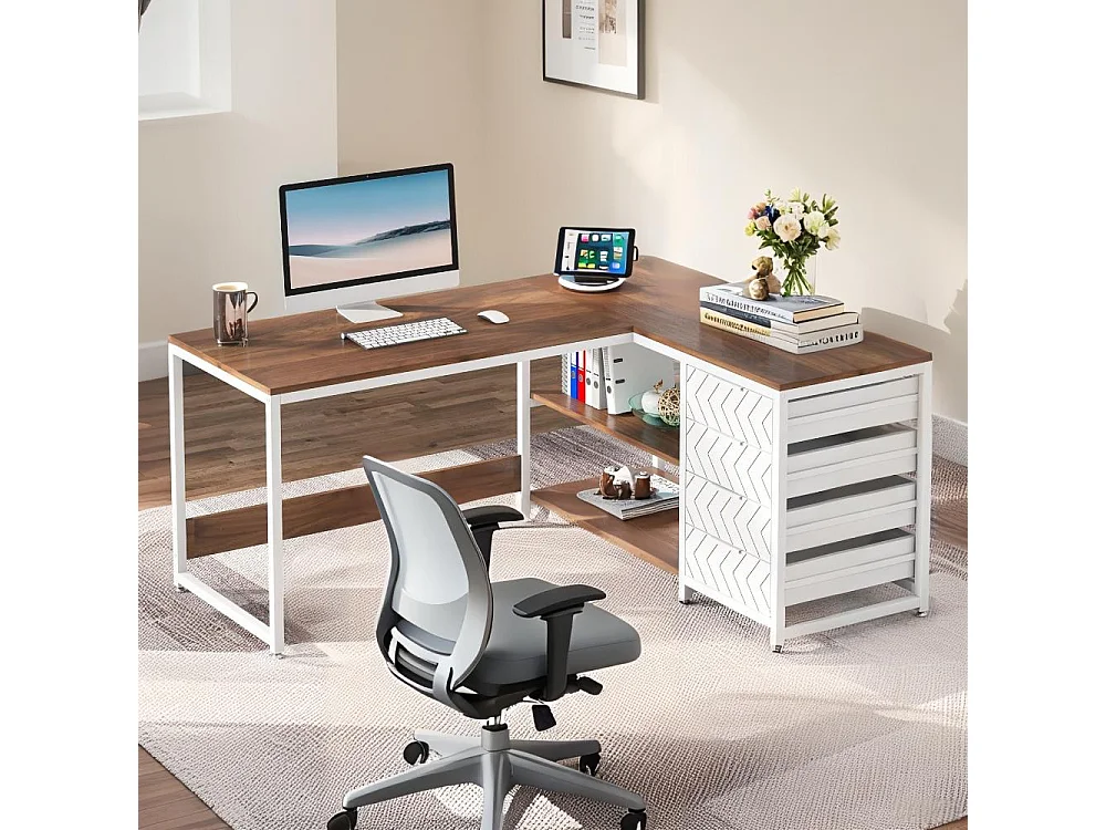 Bureau d'angle en L Professionnel ,150x110x75cm ,4 Tiroirs de Rangement,Cadre Métal Blanc Industriel,Bureau à Domicile Ergonomique