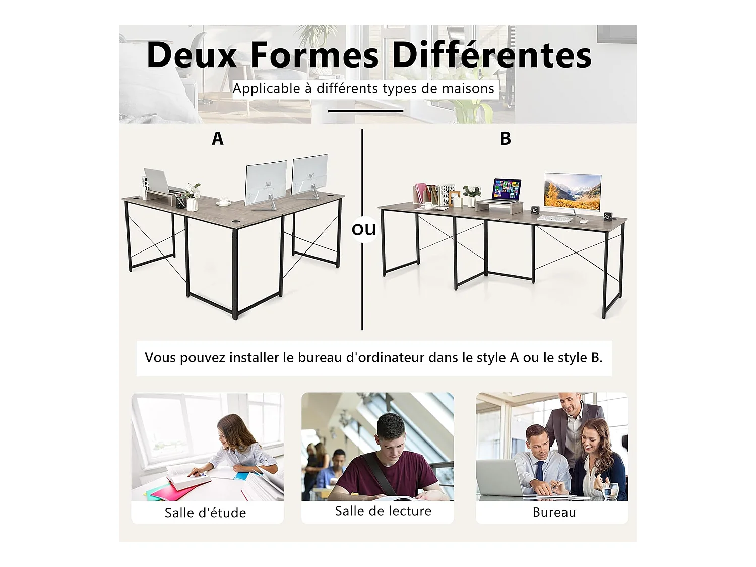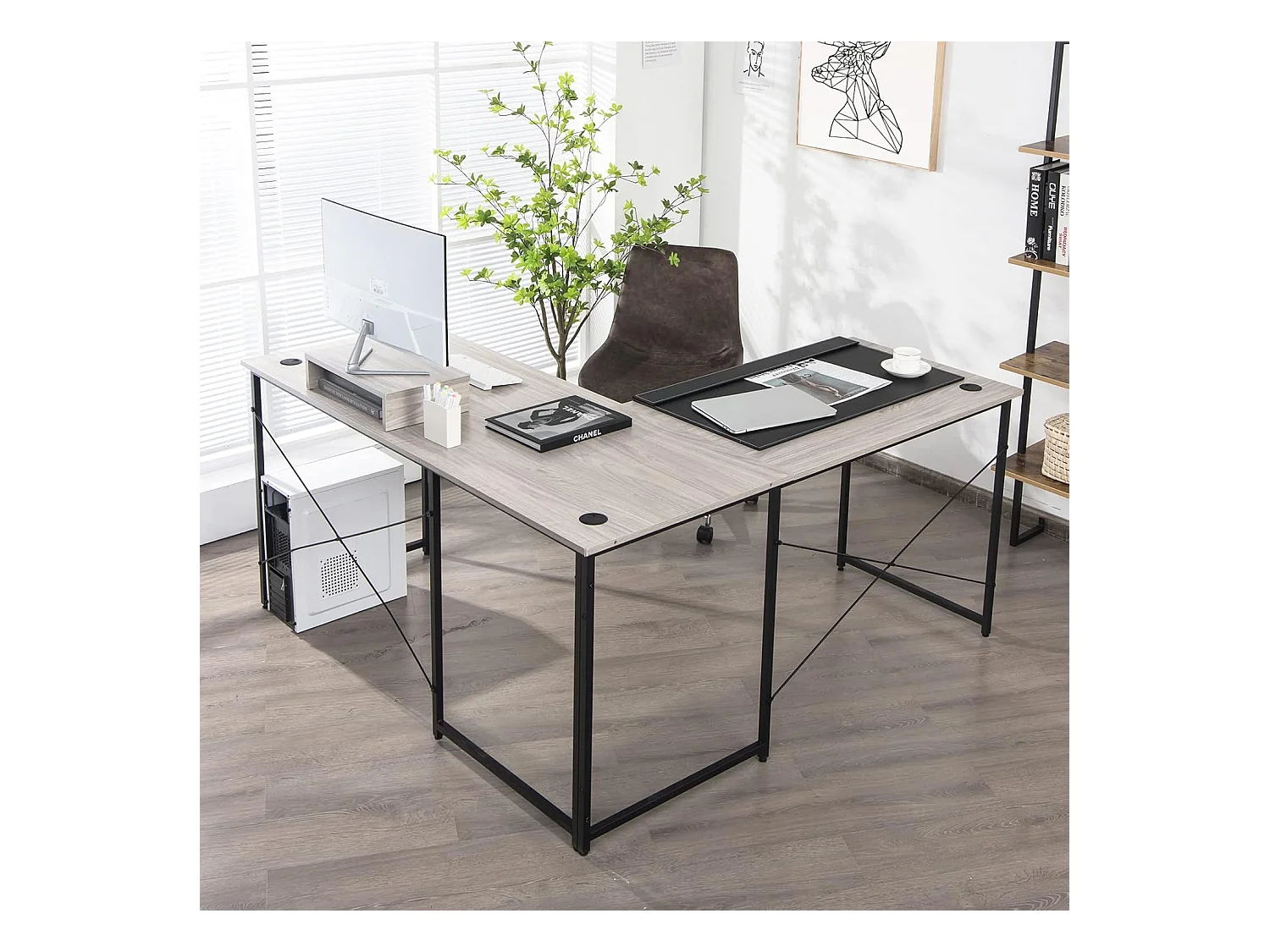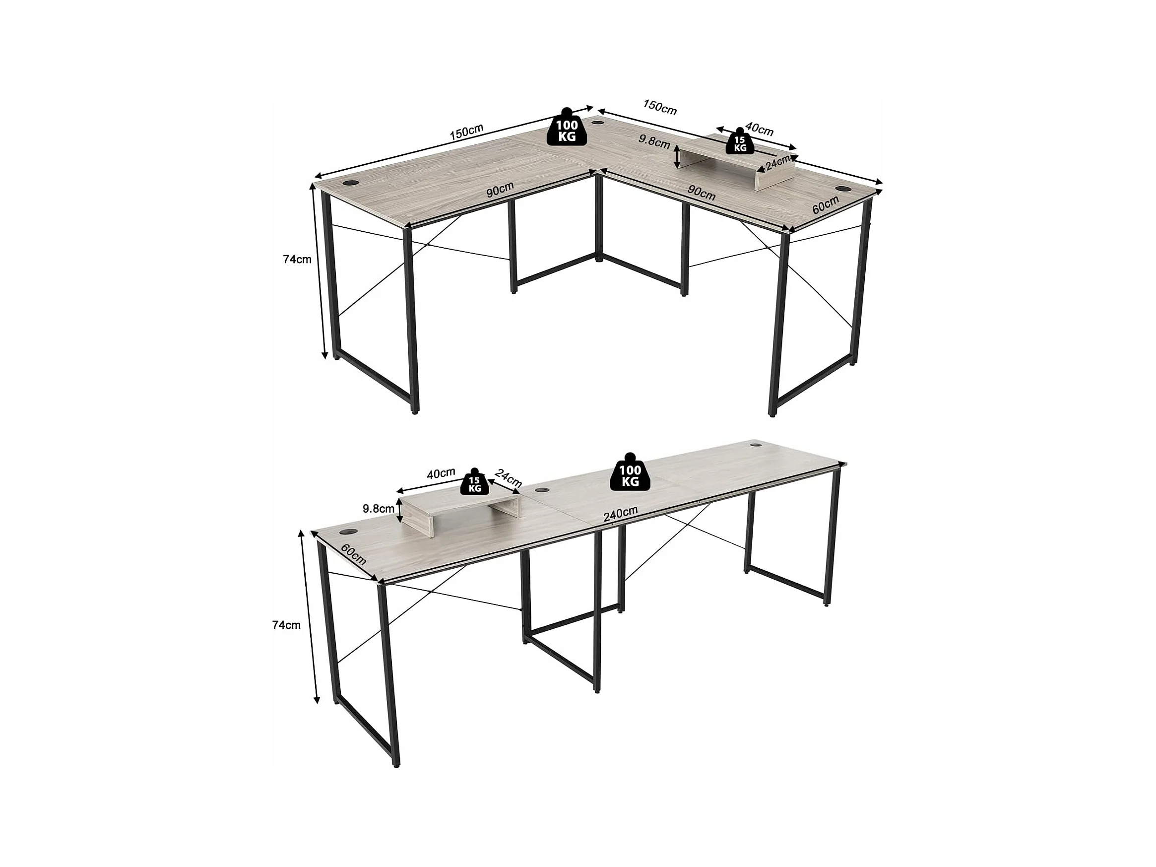 Bureau d'angle en L Réversible avec Support de Moniteur/Poste de Travail Industriel pour 2 Personnes avec 3 Trous de Câble-Assemblage Facile-150 x 150 x 74 CM, Gris
