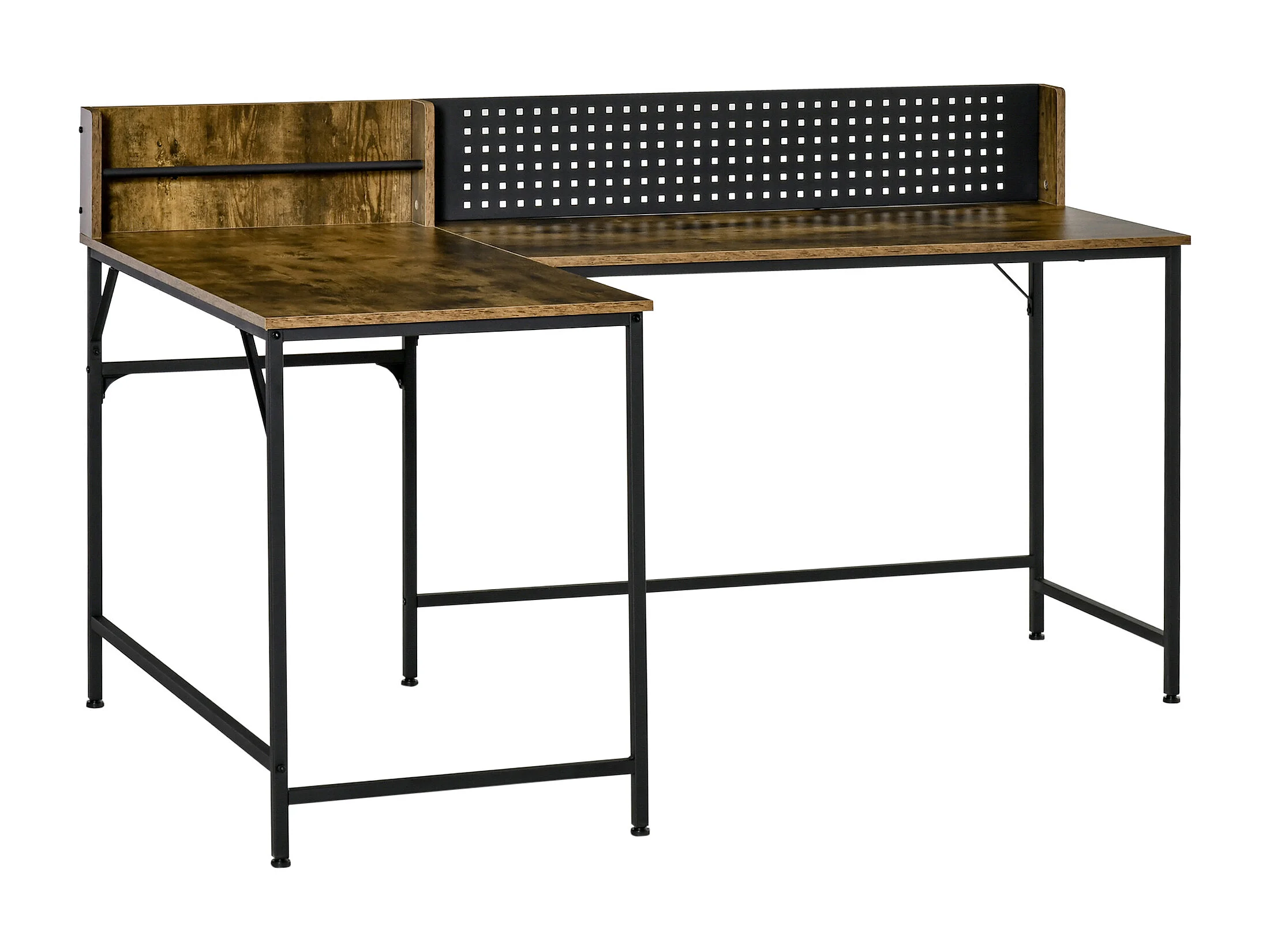 Bureau d'angle informatique design industriel - porte-revues, panneau mémo perforé - métal noir MDF aspect bois vieilli