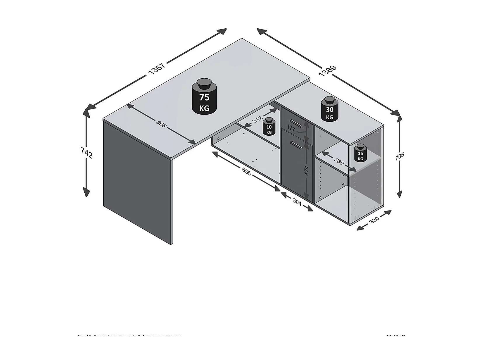 Bureau d'Angle Modulable avec Caisson, Tiroir et Étagères de Rangements - Lex