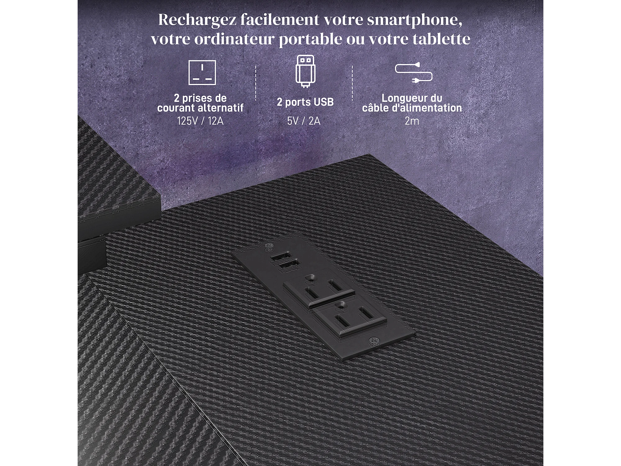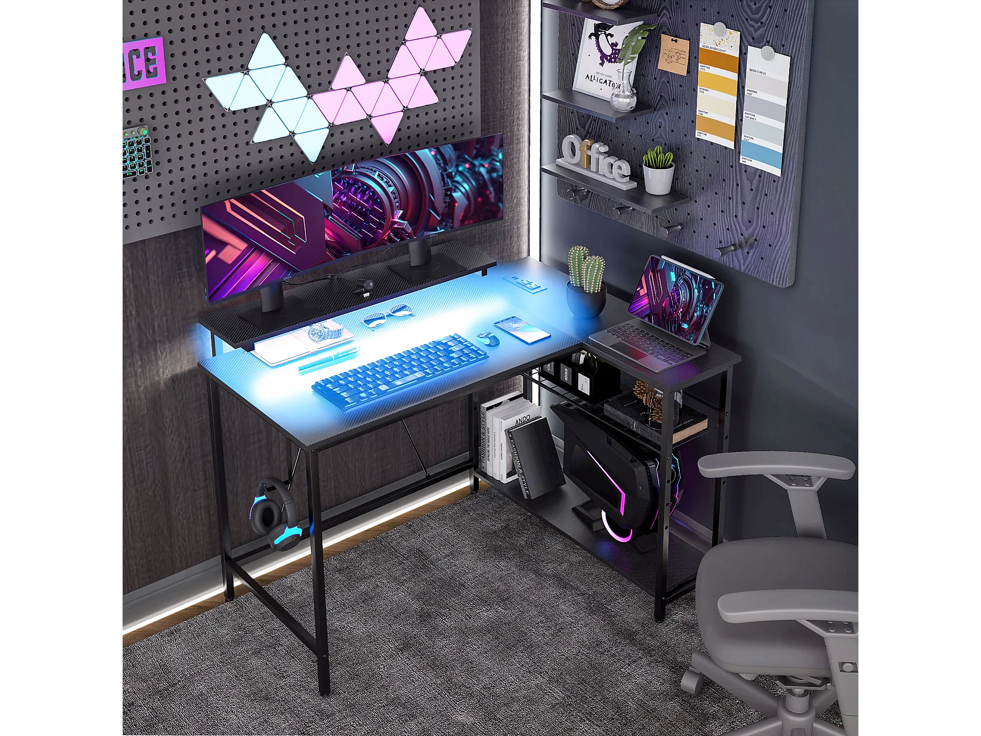 Bureau d'angle réversible avec LED, 2 prises et 2 ports USB, 107x80cm, avec étagère, support d'écran, noir