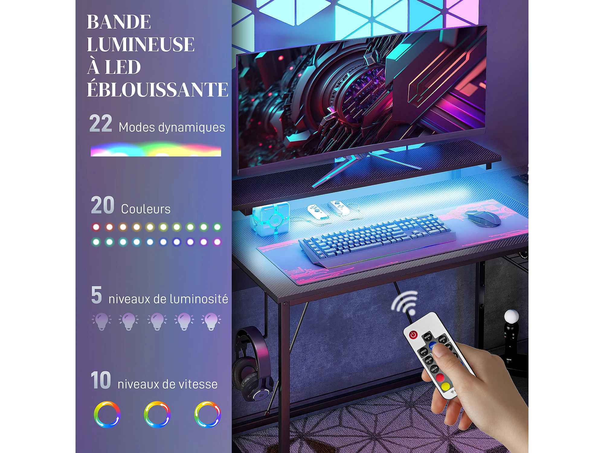 Bureau de Jeu Bureau Gamer Surface en Fibre de Carbone 120 X 60 X 76CM avec Porte-gobelet, Crochet pour Ecouteurs et Supports Audio (Noir et Rouge)