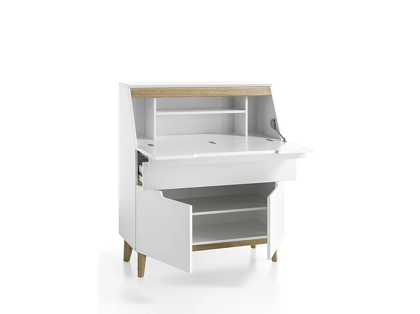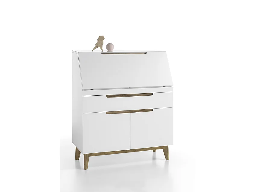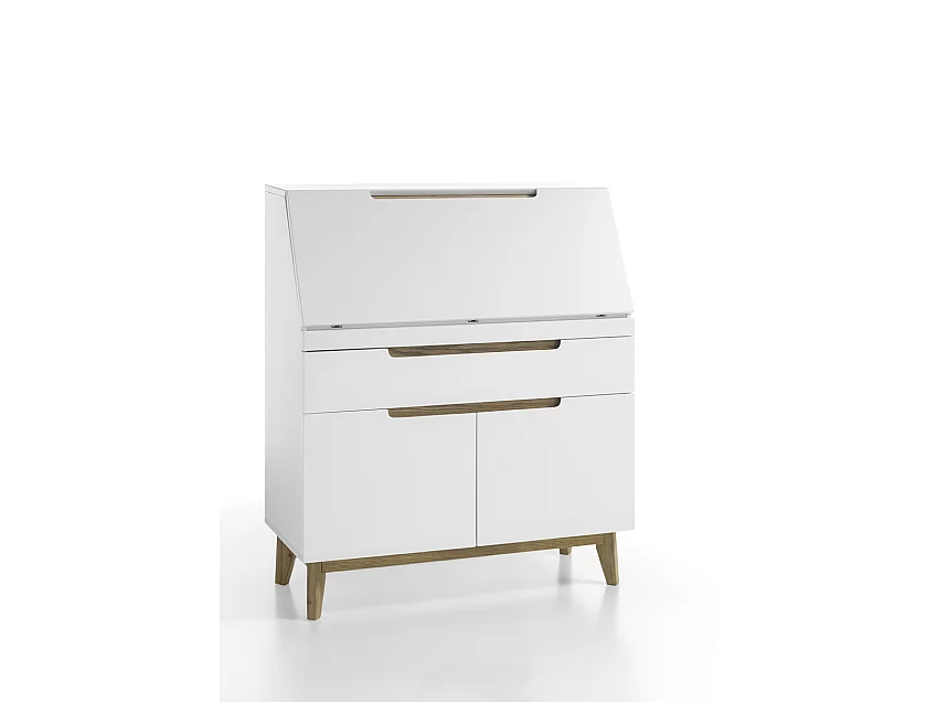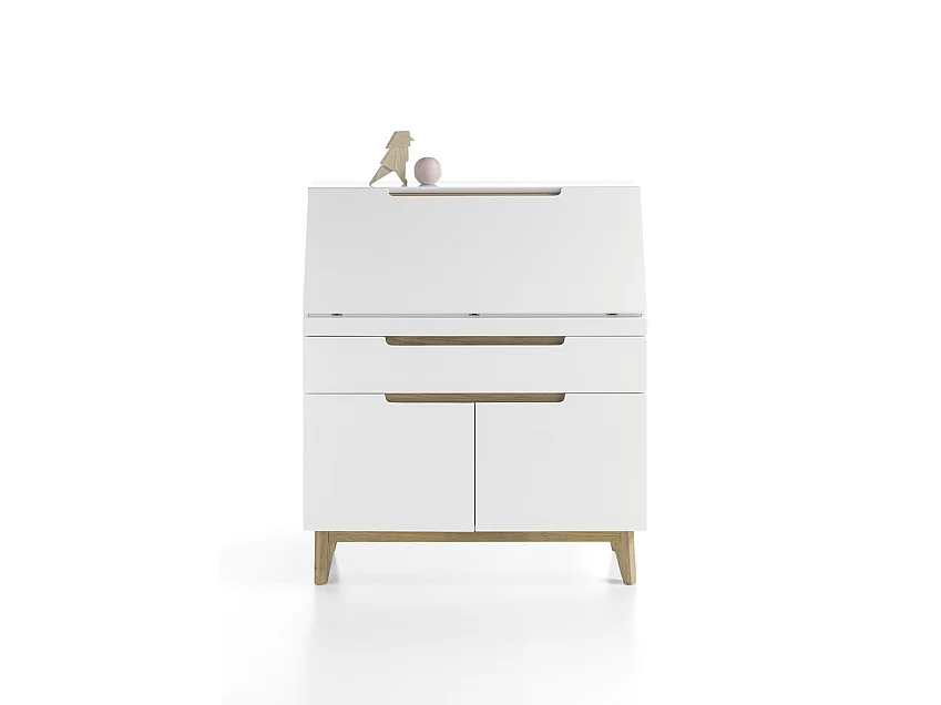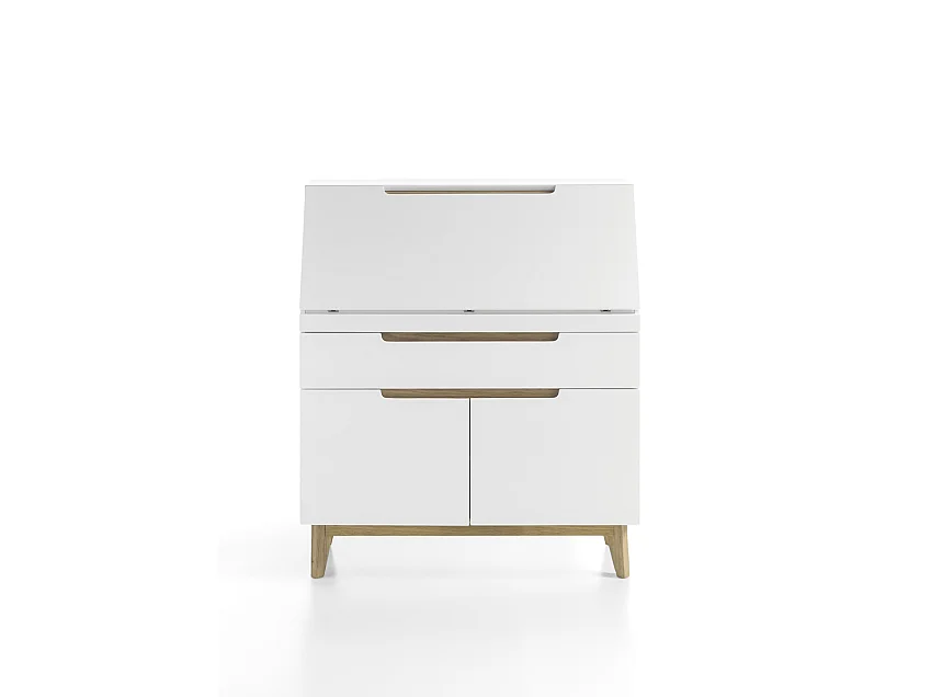 Bureau de sécretaire en laqué blanc mat avec piètement en chêne - L97 x H113 x P40 cm