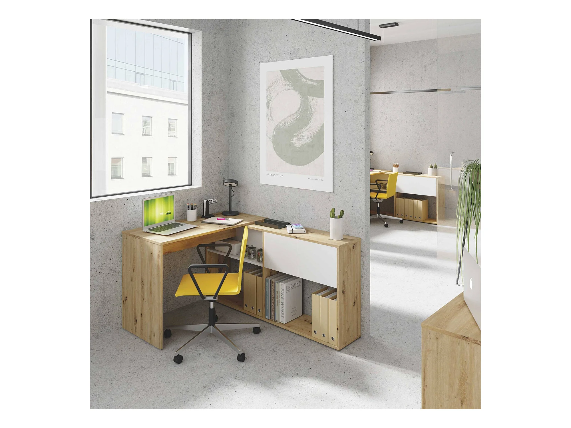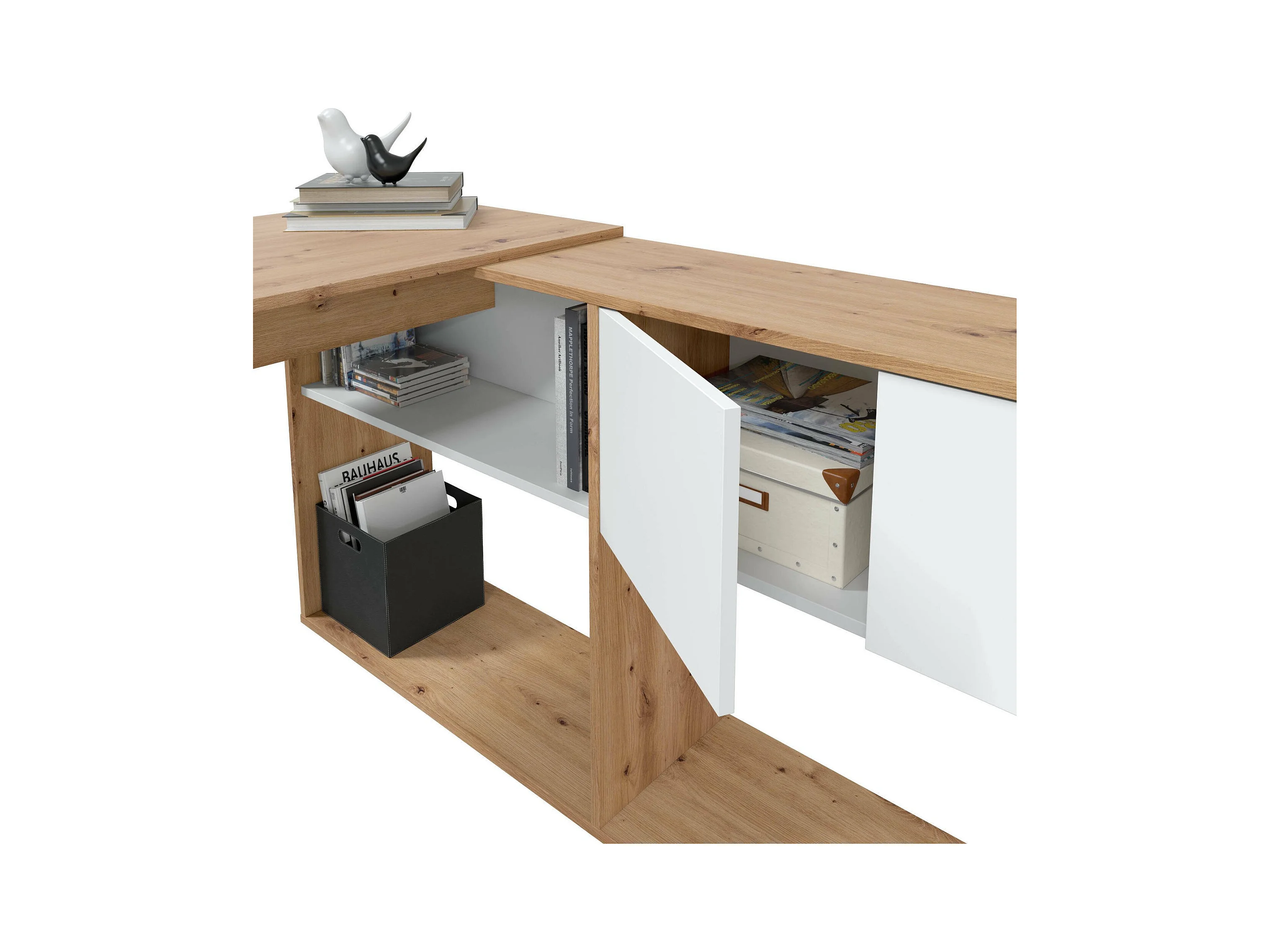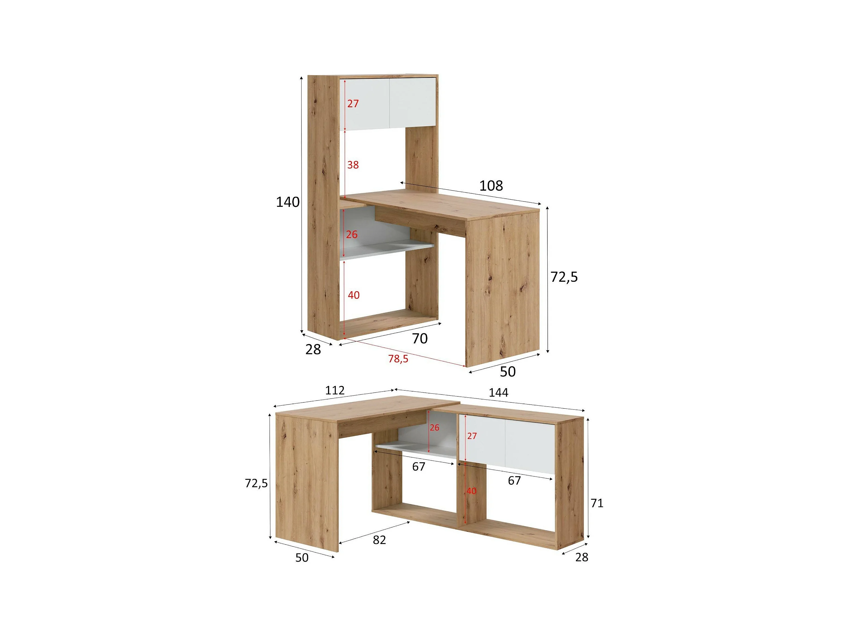 Bureau Dmangn, Bureau d'angle réversible multifonctionnel avec bibliothèque, Table d'étude ou de bureau multi-positions, 108x70h140 cm, Chêne blanc et noué