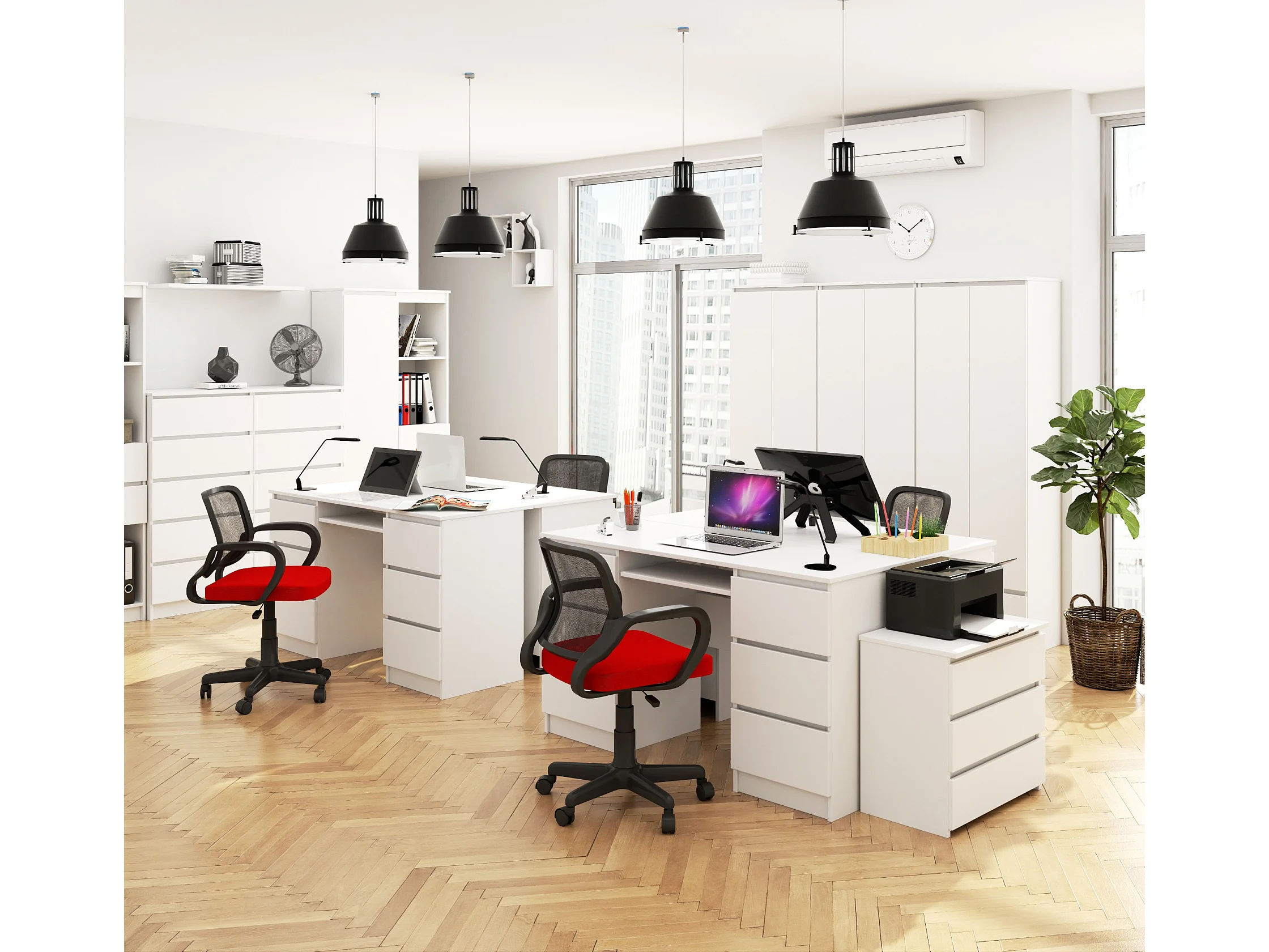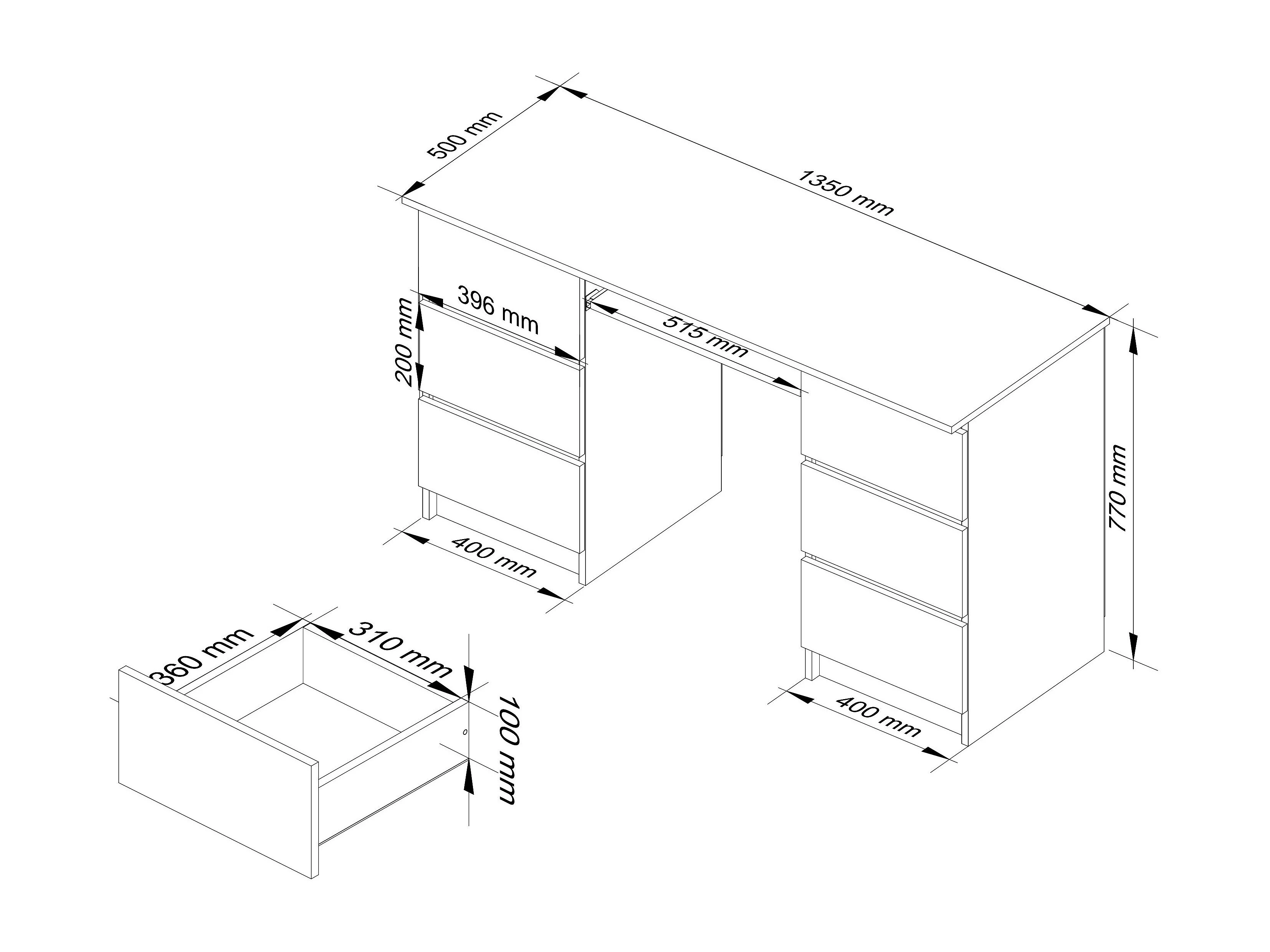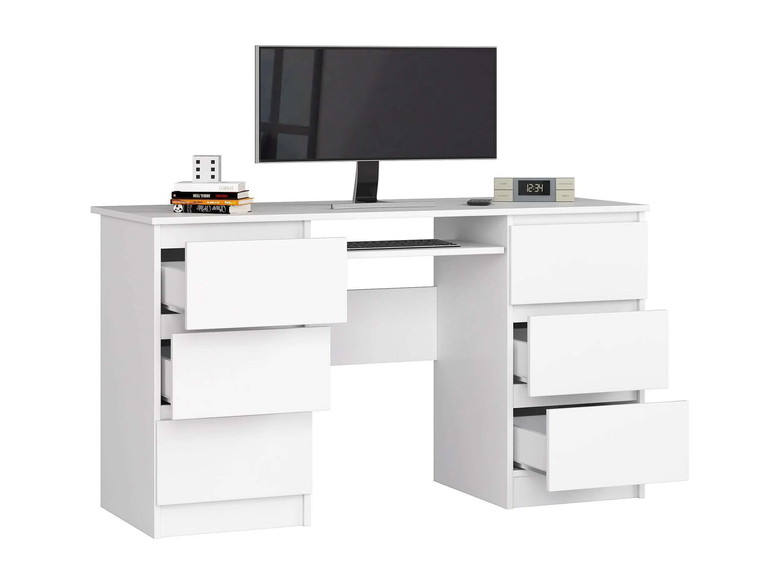 Bureau d'ordinateur AKORD A11 Blanc 135 cm 6 tiroirs façade Blanche 135x50x77 cm