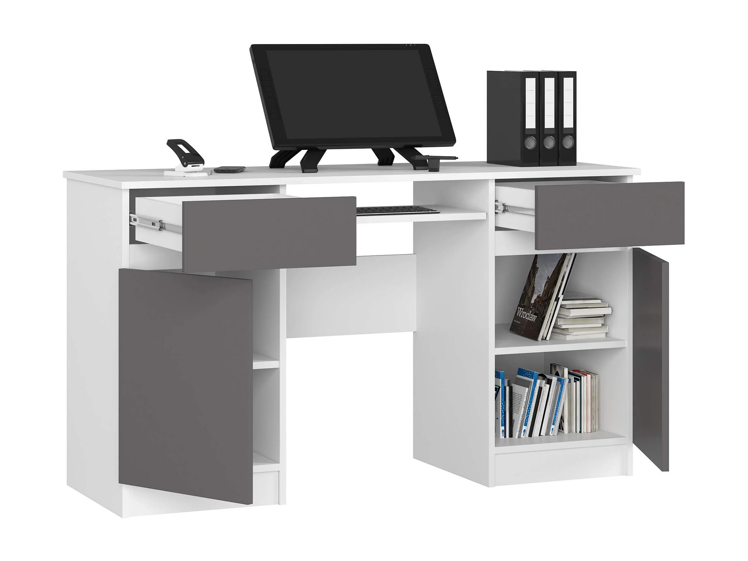 Bureau d'ordinateur AKORD A5 Blanc 135 cm 2 portes 2 tiroirs façade Gris Graphite 5 étagères 135x50x77 cm