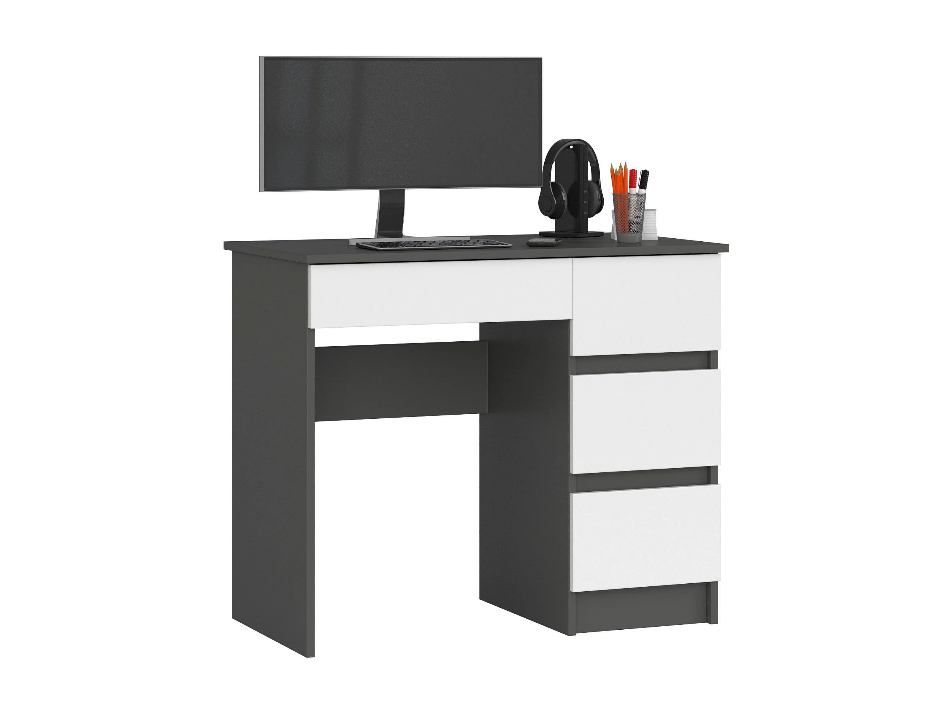 Bureau d'ordinateur AKORD droit A7 Gris Graphite 90 cm 4 tiroirs façade Blanche 90x50x77 cm