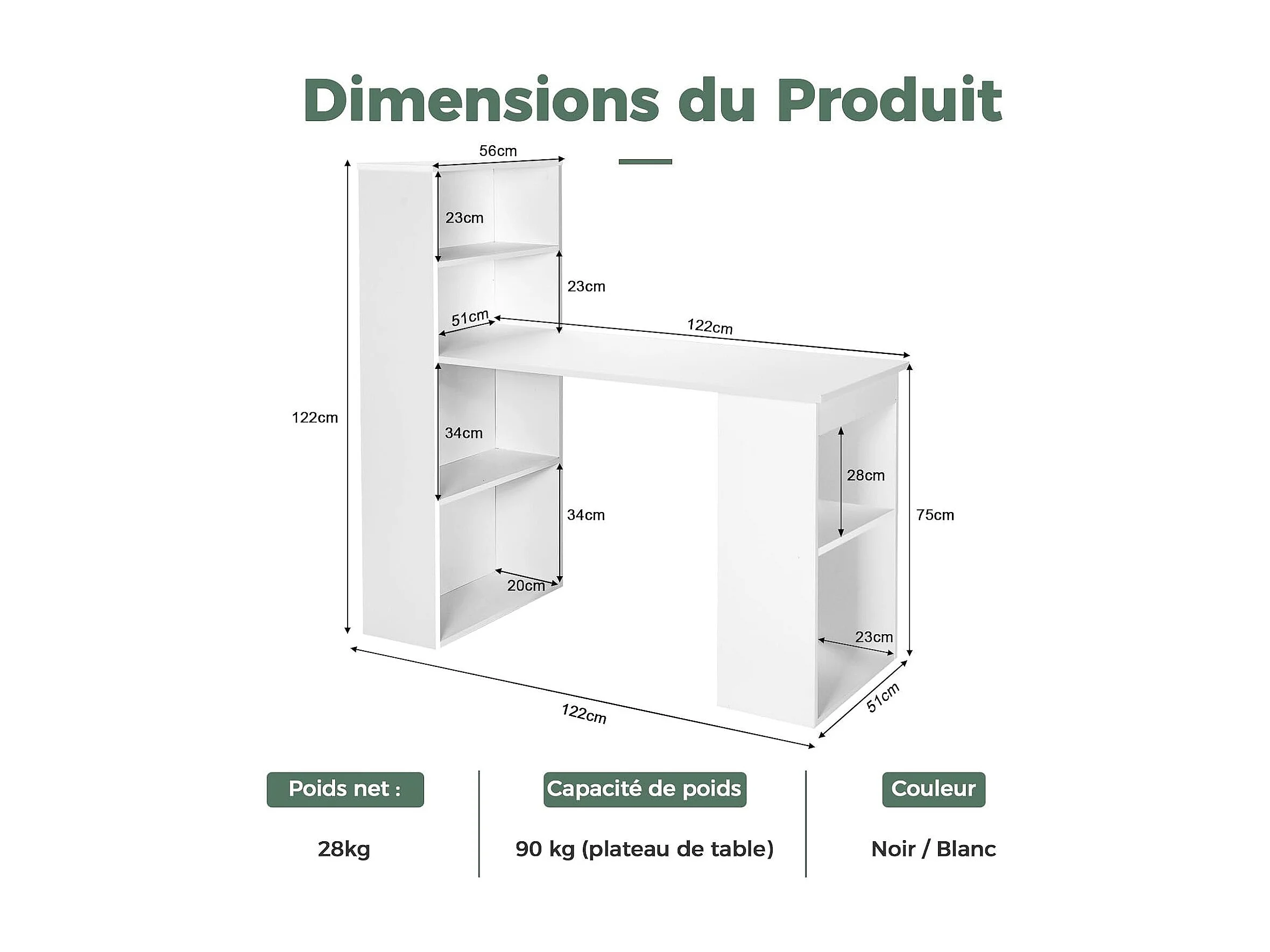 Bureau d'Ordinateur Réversible avec Bibliothèque, Poste de Travail Moderne avec Étagères de Rangement à 6 Niveaux, Assemblage Facile, pour Maison, Bureaux (Blanc)