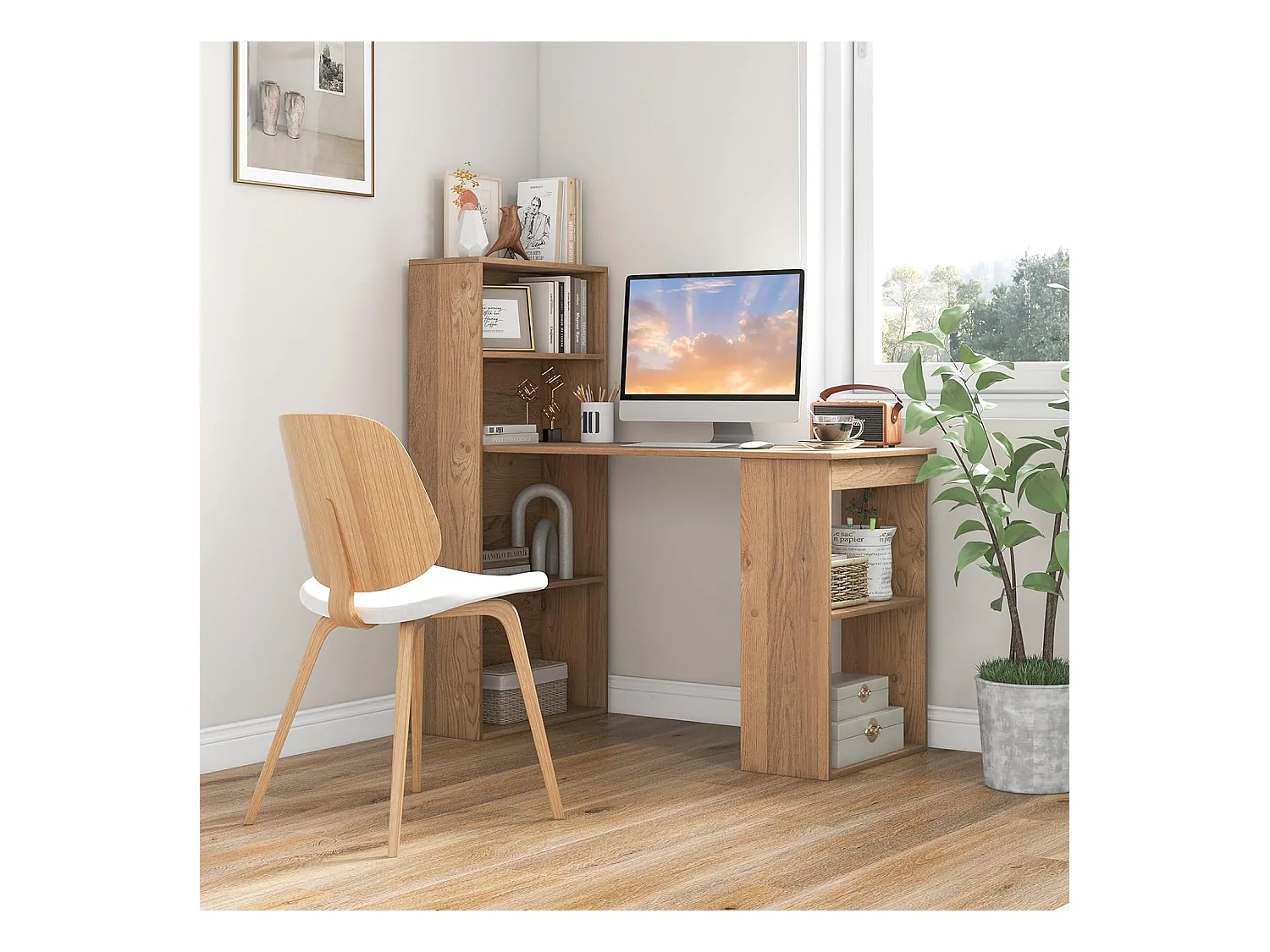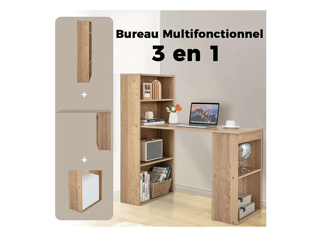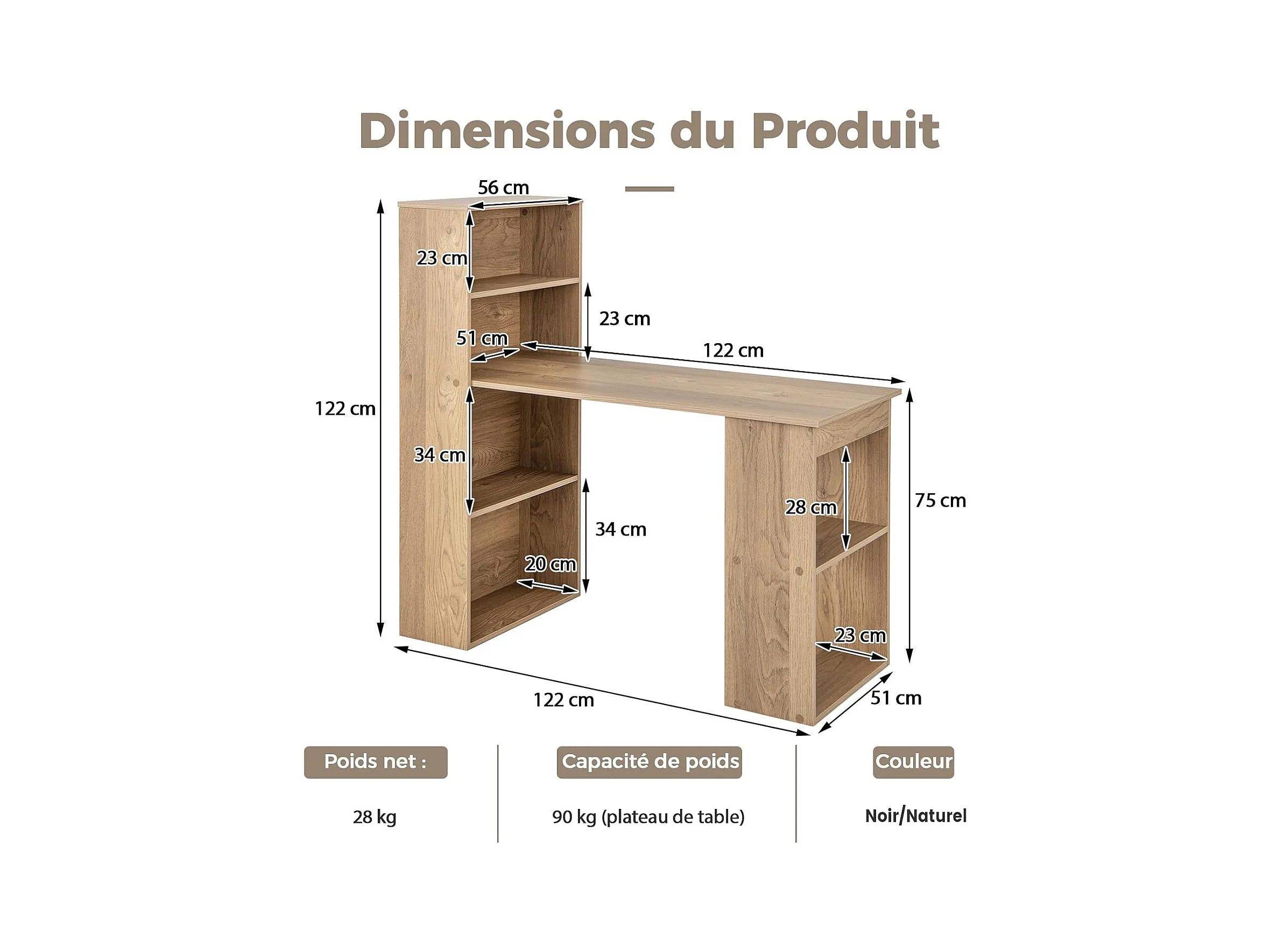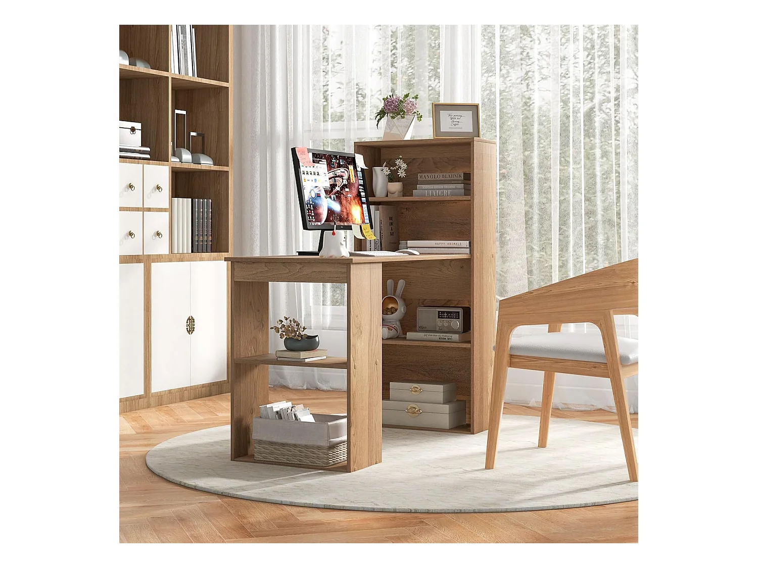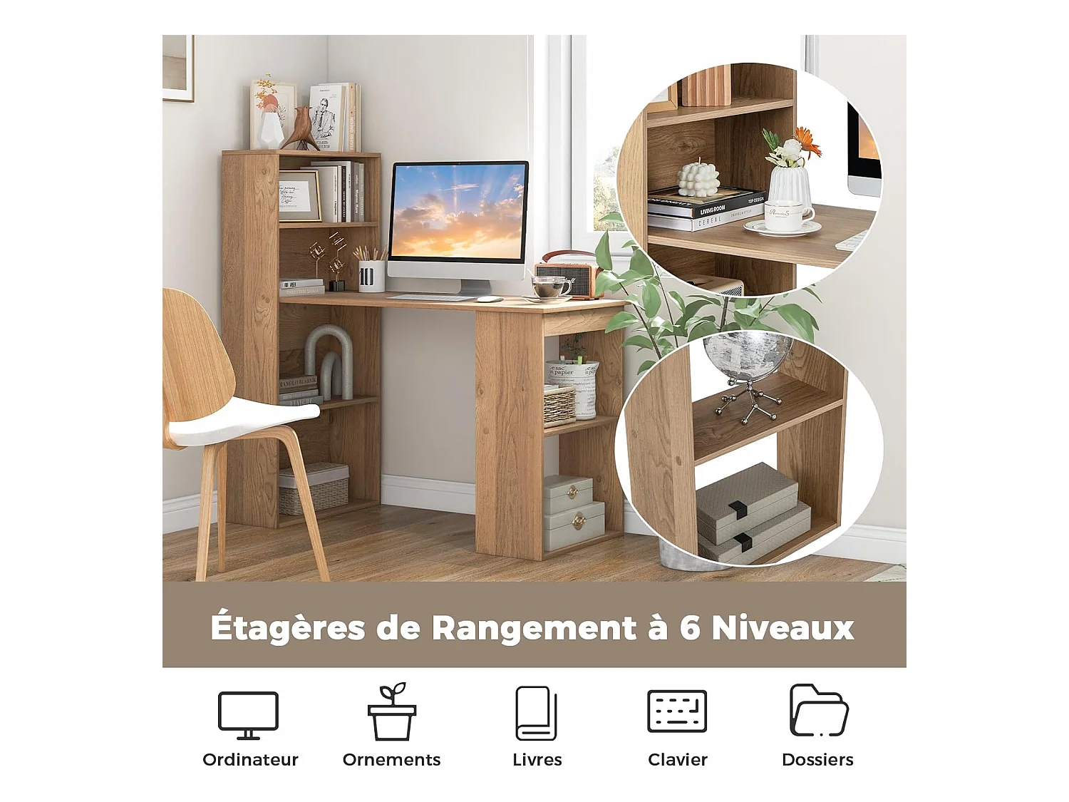 Bureau d'Ordinateur Réversible avec Bibliothèque, Poste de Travail Moderne avec Étagères de Rangement à 6 Niveaux, Assemblage Facile, pour Maison, Bureaux (Naturel)