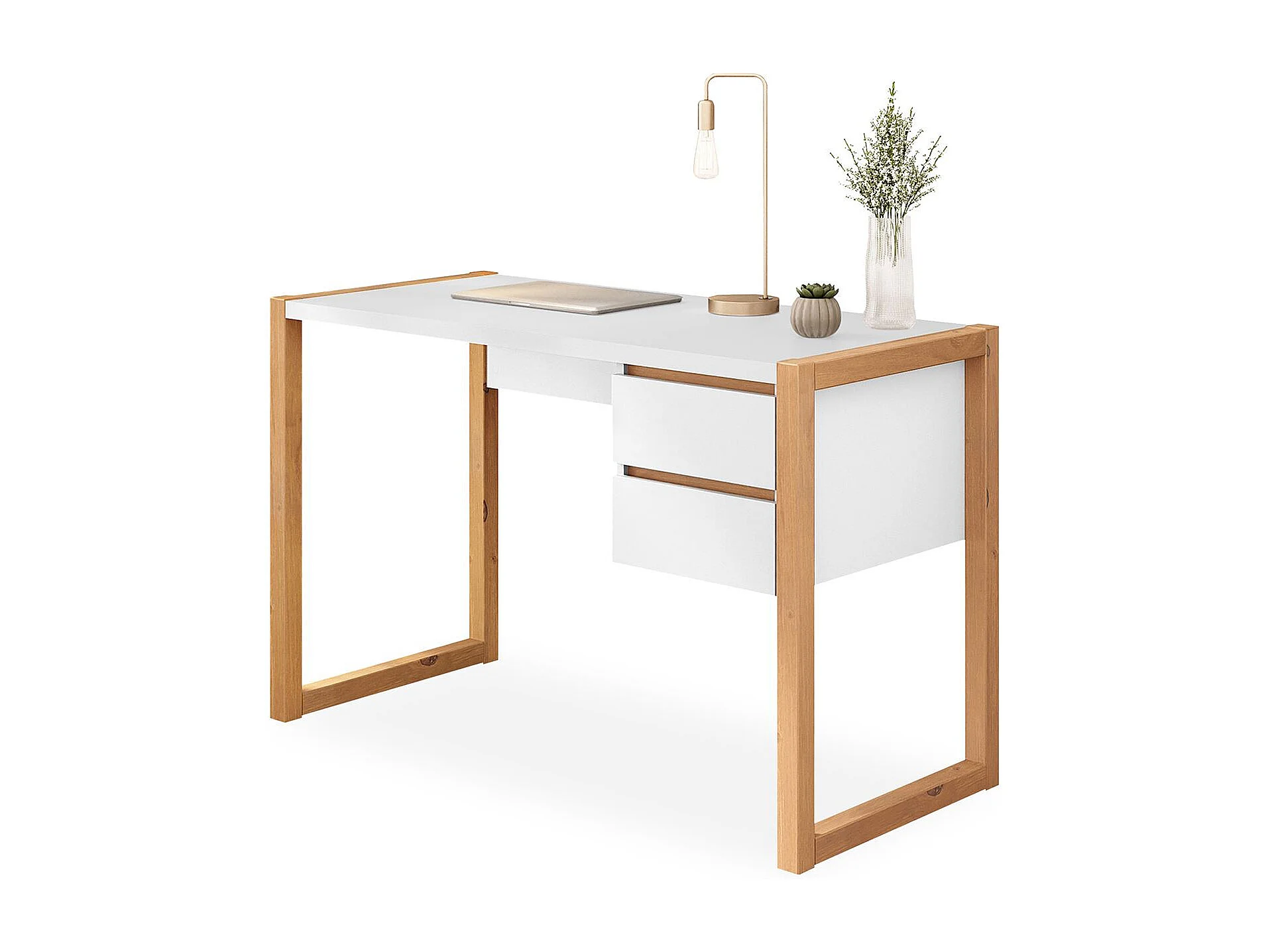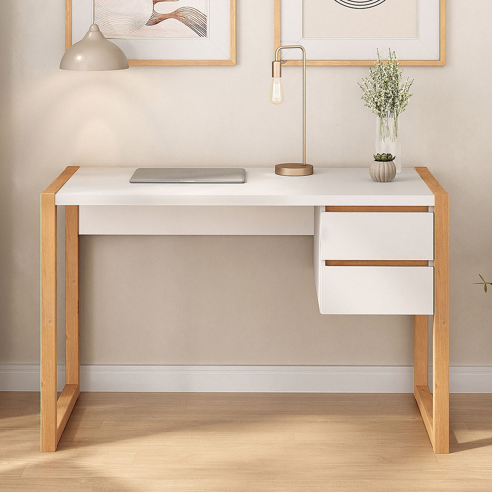 Bureau en Bois Belinda L 119 cm 2 Tiroirs Coloris Blanc et Chêne Table de Travail Bureau Droit Compact