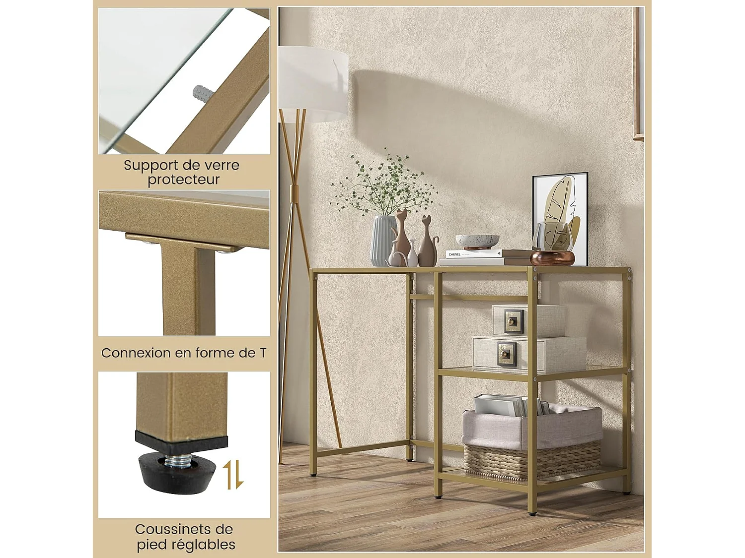 Bureau en Verre Trempé, Bureau 2 Étagères, Cadre Métallique Doré, Meuble d'Entrée pour Couloir, Salon, Chambre, Bureau, Doré, 106 x 51 x 76 cm