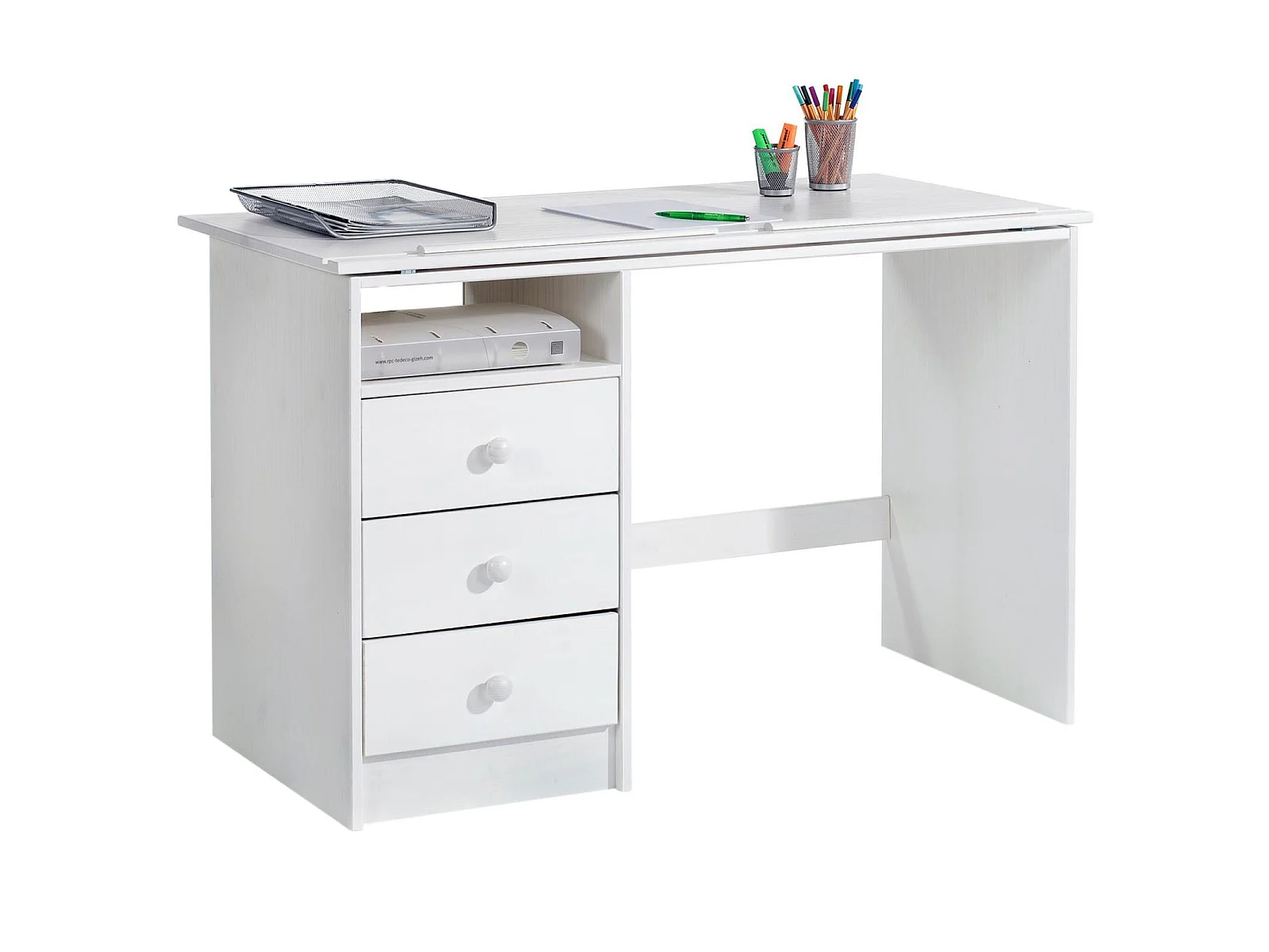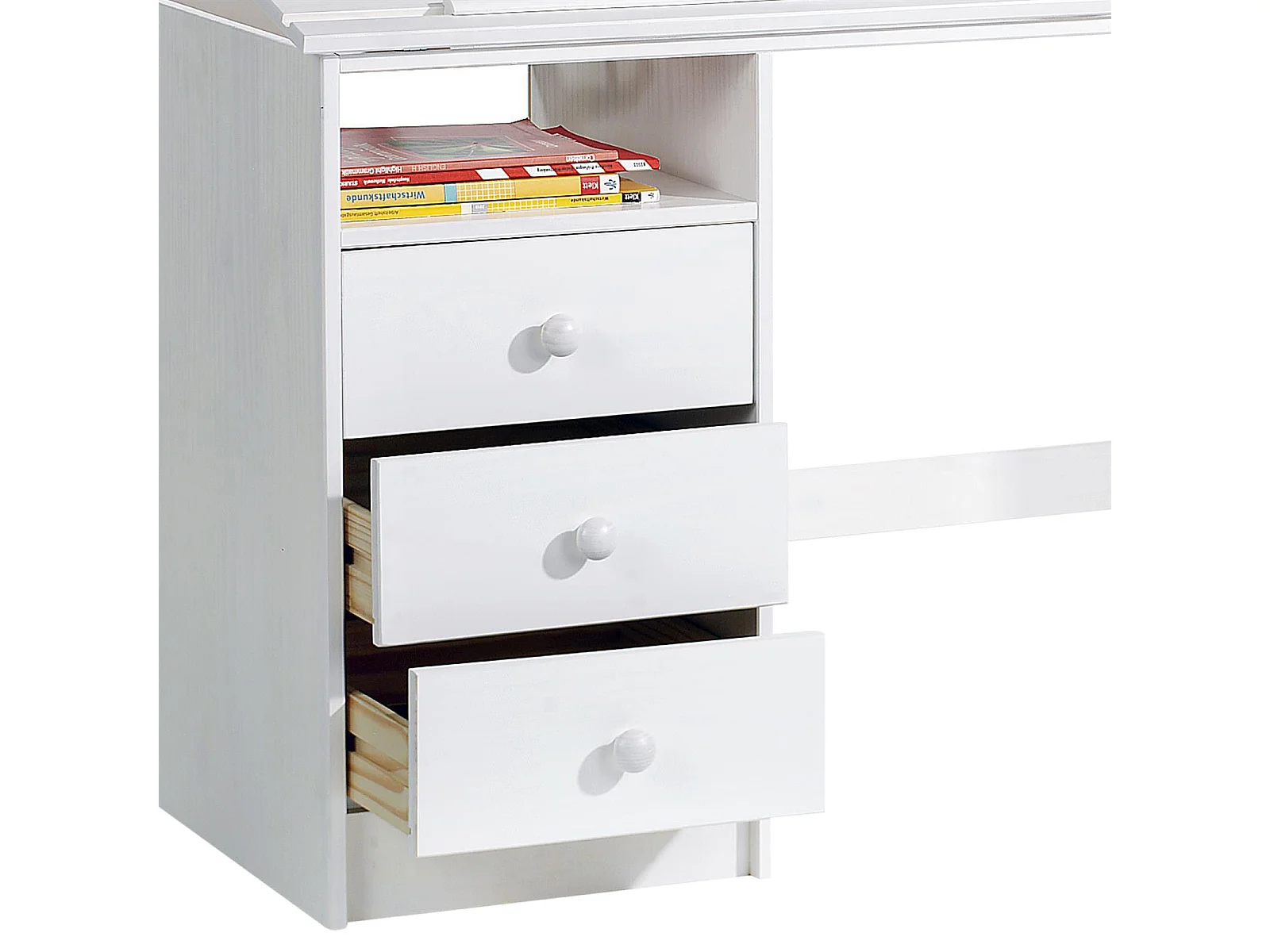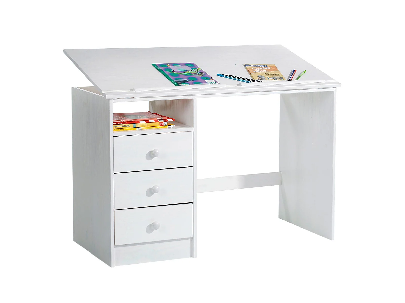 Bureau enfant écolier junior KEVIN pupitre inclinable avec 3 tiroirs 1 casier en pin massif lasuré blanc