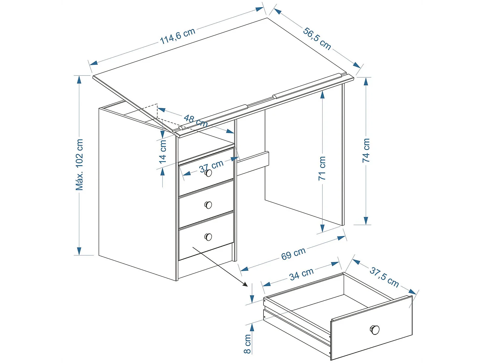 Bureau enfant écolier junior KEVIN pupitre inclinable avec 3 tiroirs 1 casier en pin massif lasuré blanc et rose