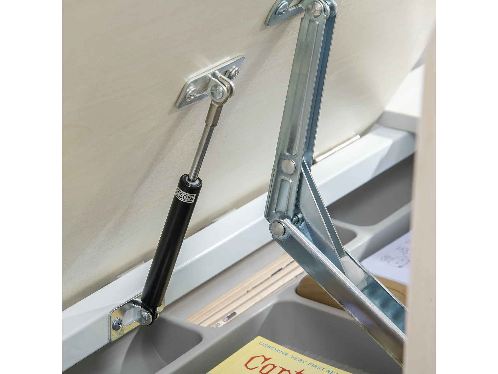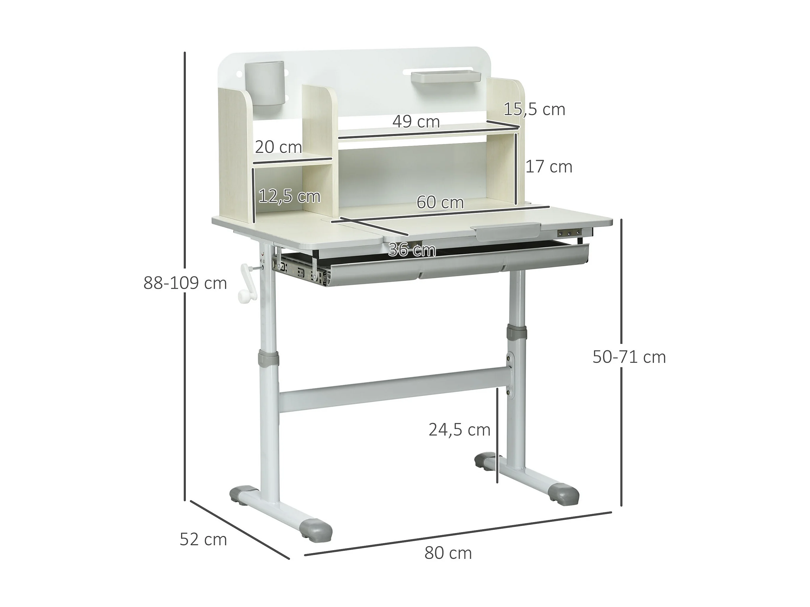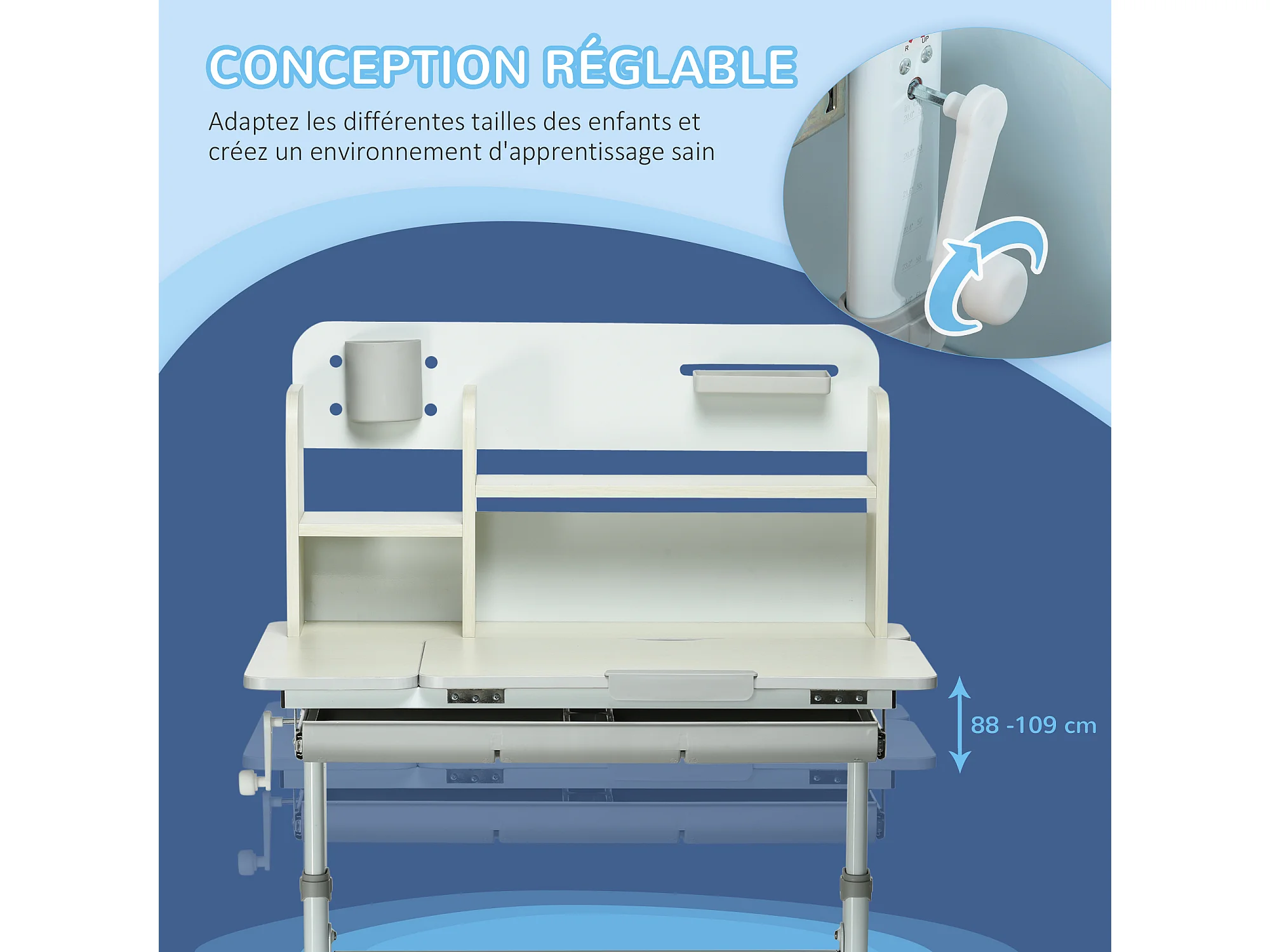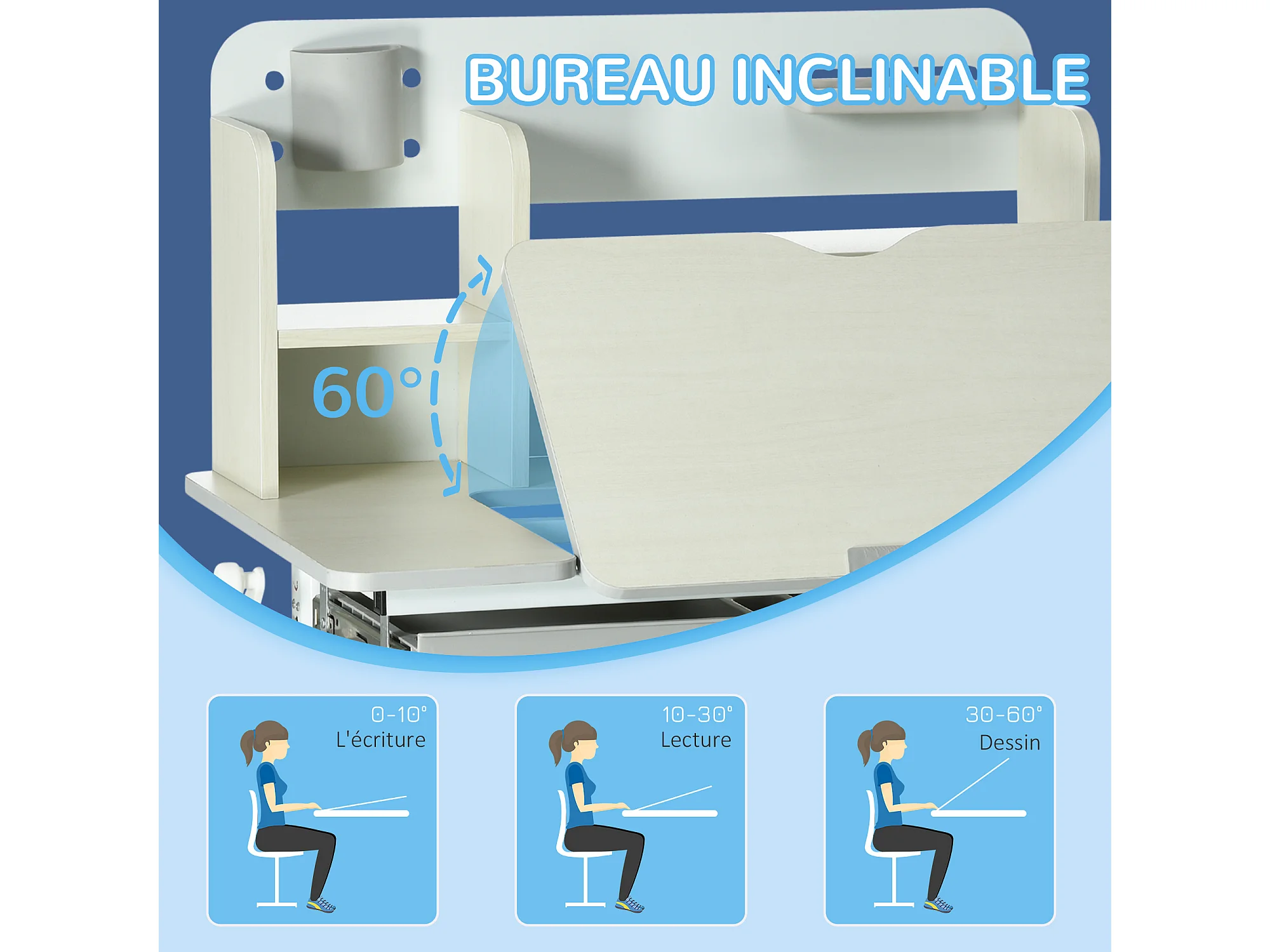 Bureau enfant multi-rangement - bureau hauteur réglable, plateau inclinable - 3 étagères, 2 niches, pot crayon, tablette coulissante à rangement - gris blanc