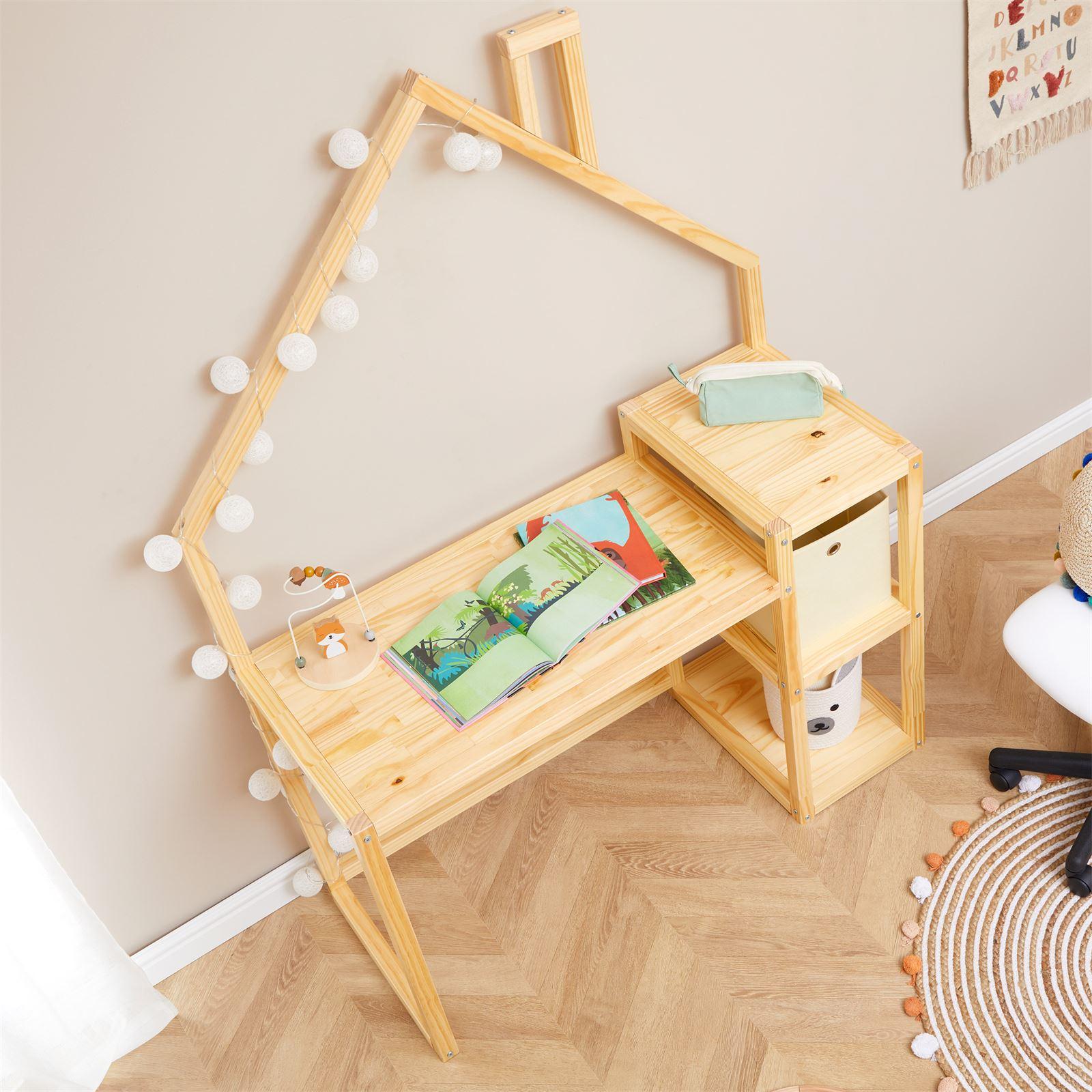 ... deviendra un véritable élément de décoration dans la chambre de votre enfant. Son design minimaliste en forme de maison ajoutera un aspect ludique à l'organisation de sa chambre. Fabriqué en pin massif, ce bureau en bois s'harmonise facilement avec le reste du mobilier. De plus, des étagères intégrées offrent à l'enfant la possibilité de ranger ses affaires lui-même, favorisant ainsi son autonomie et son sens de l'organisation