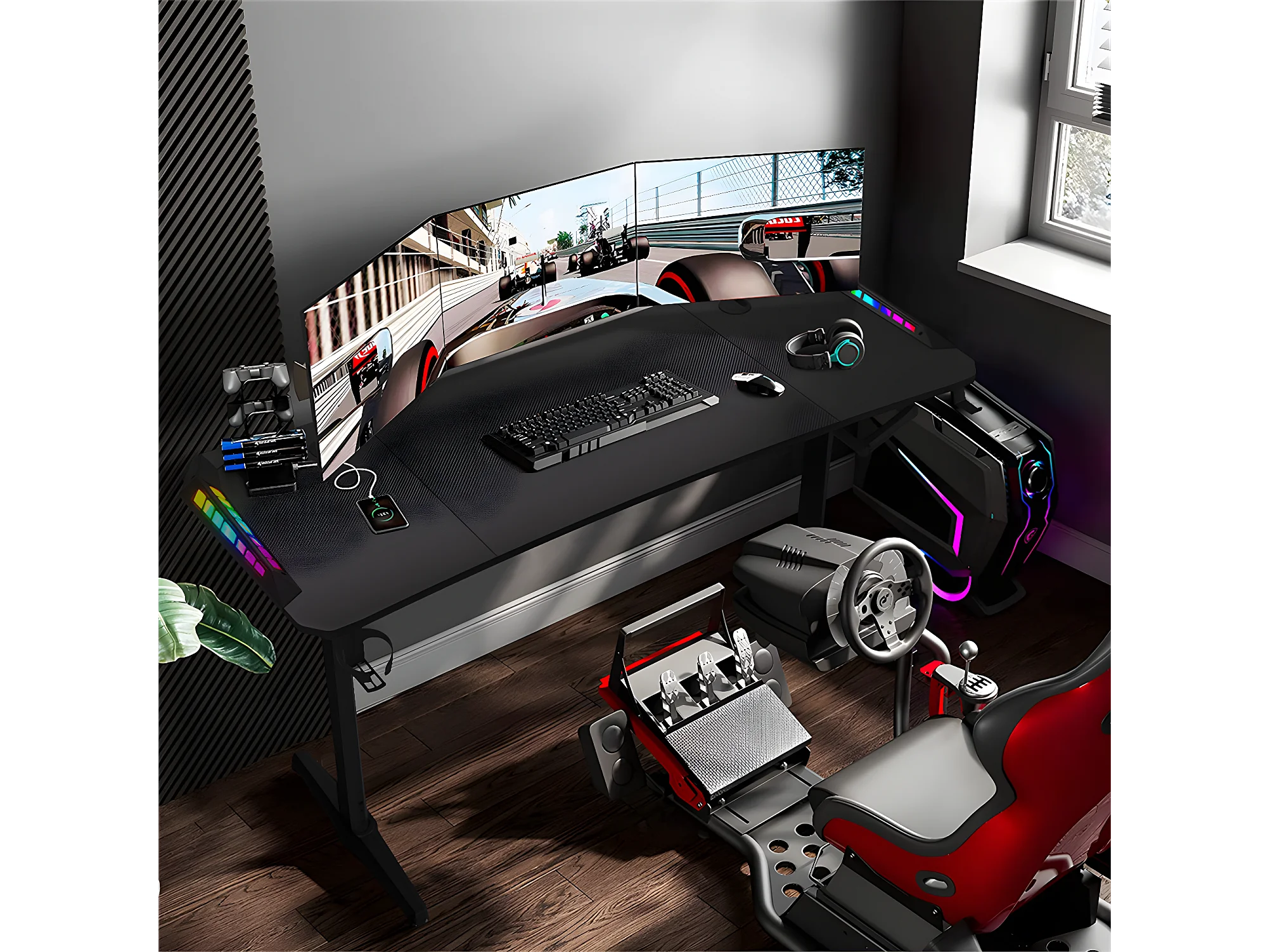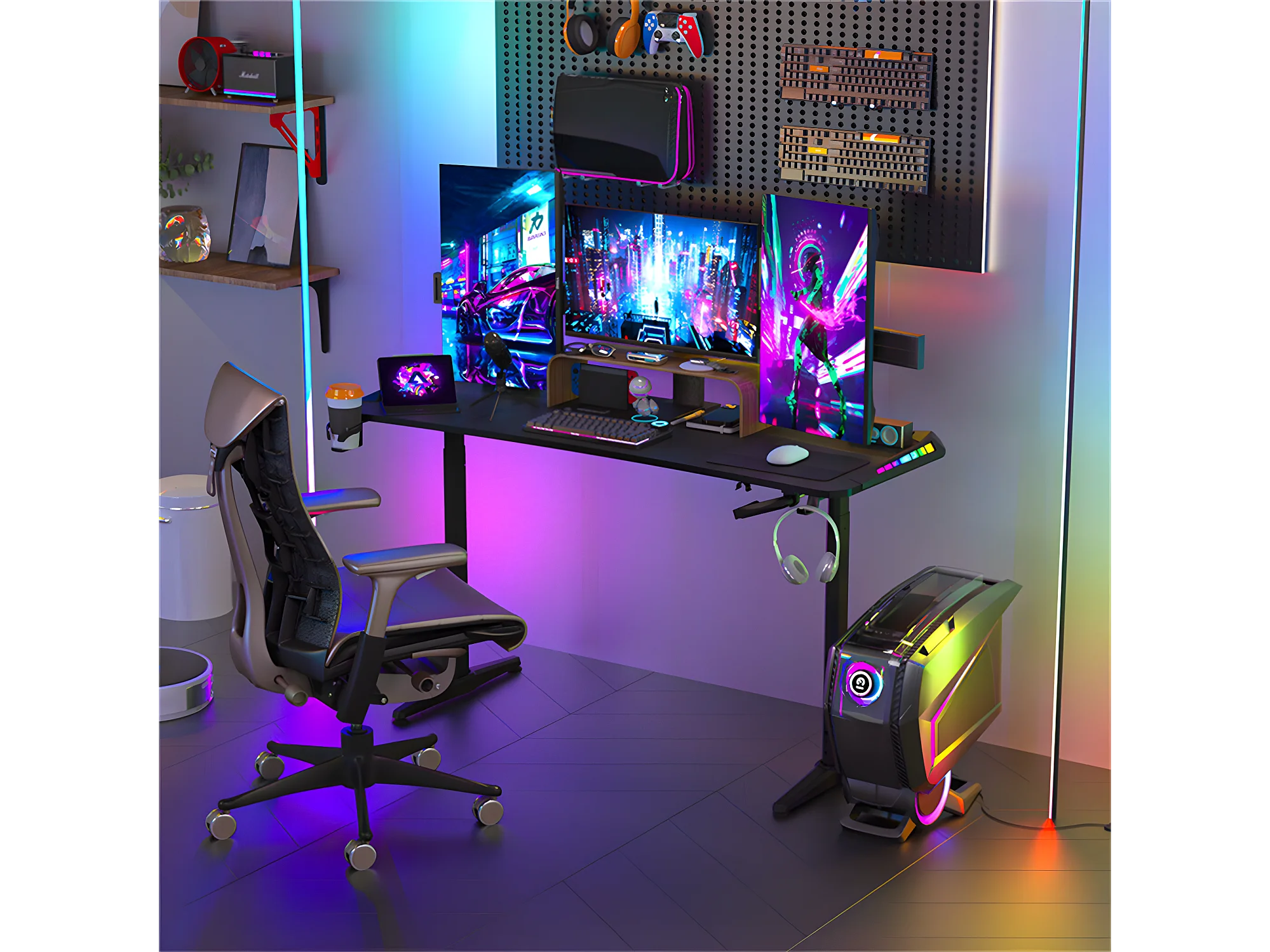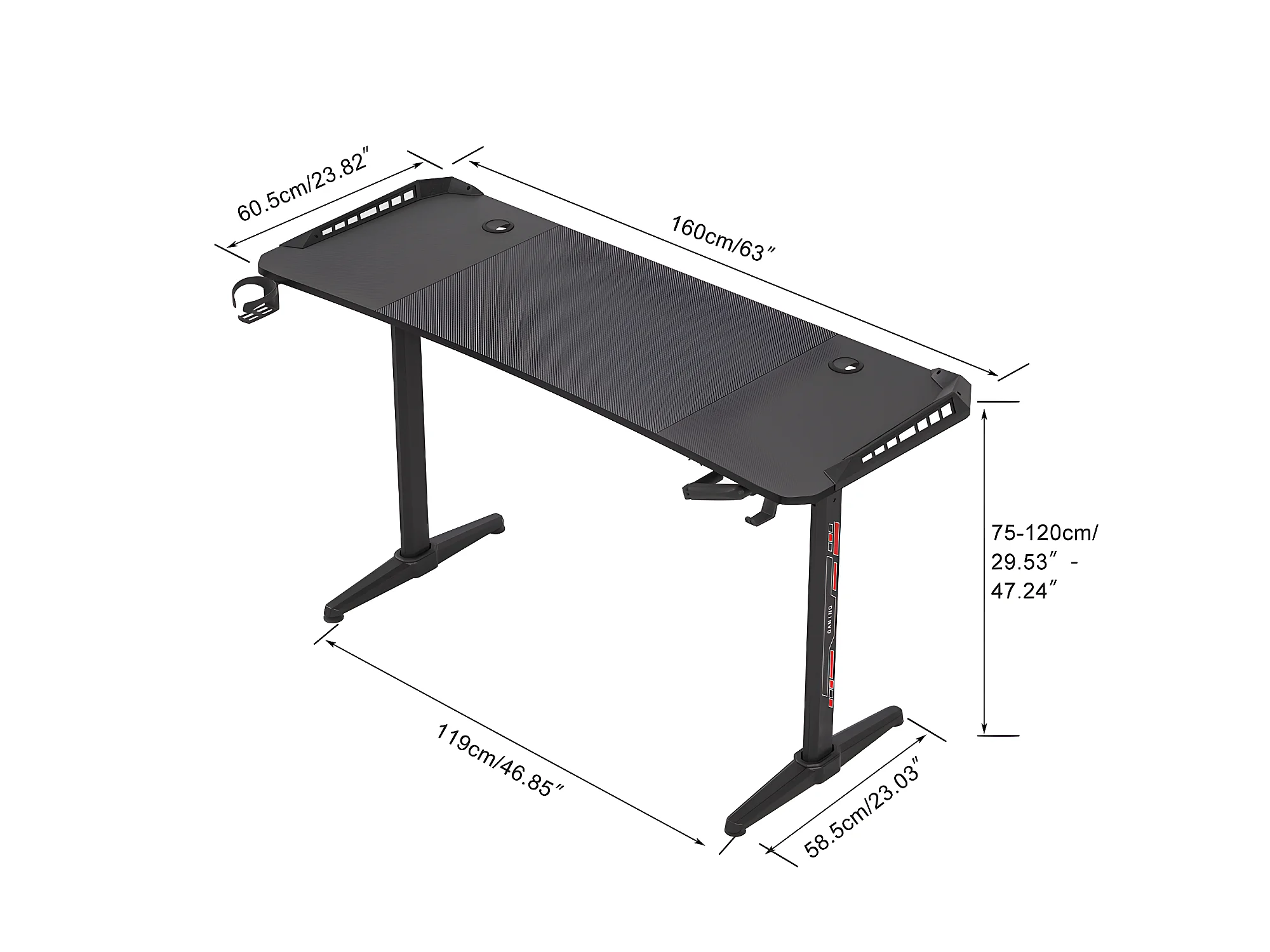 Bureau gaming led hauteur réglable de 69 à 155cm bureau gamer rgb noir table gaming avec rangement 160x60.5x120cm