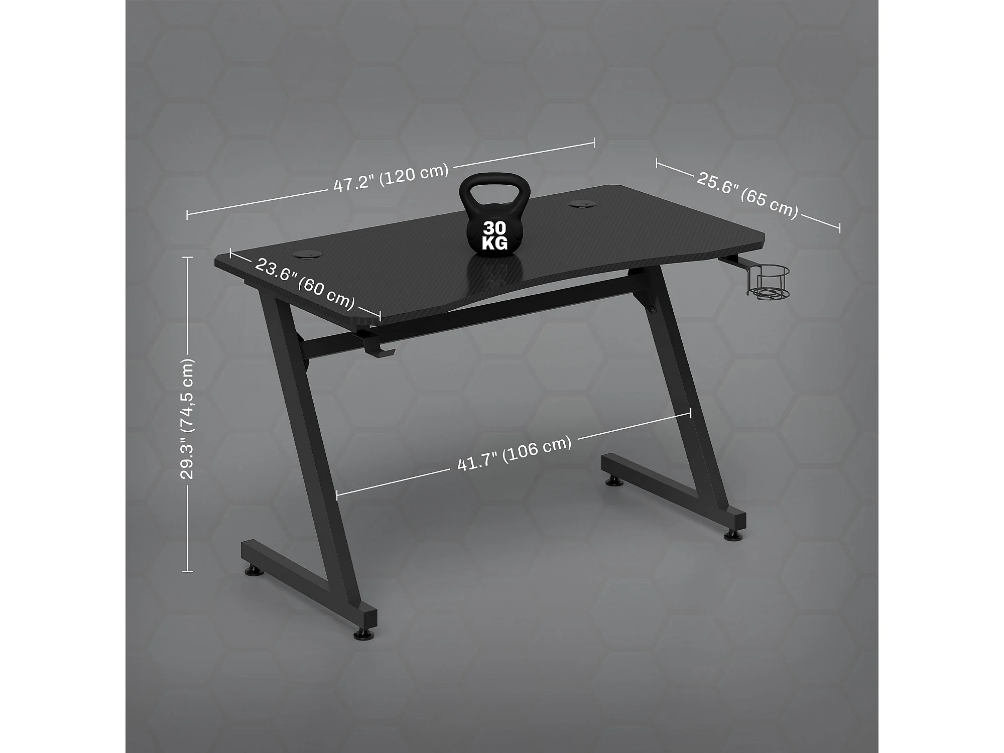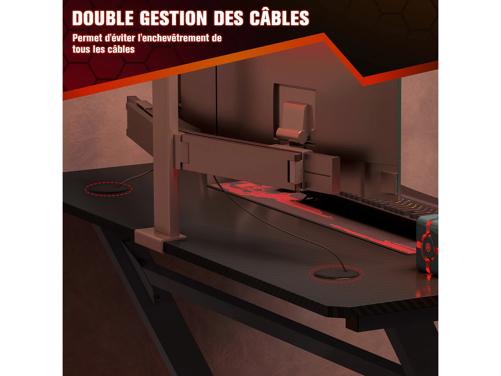 Bureau gaming plateau effet fibre de carbone dim. 120L x 65l cm bracket casque porte-gobelet passe-câble noir
