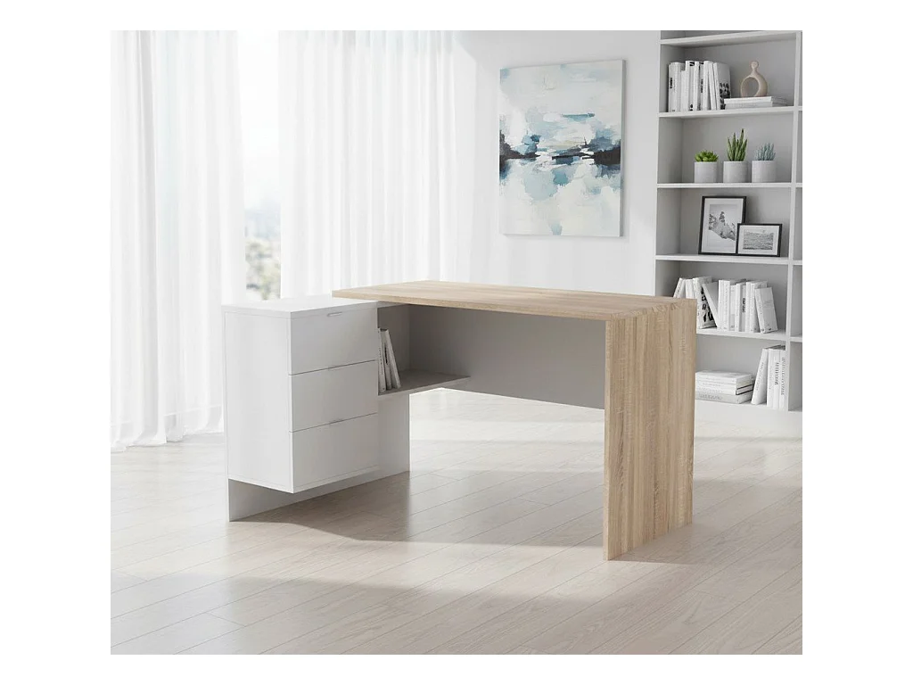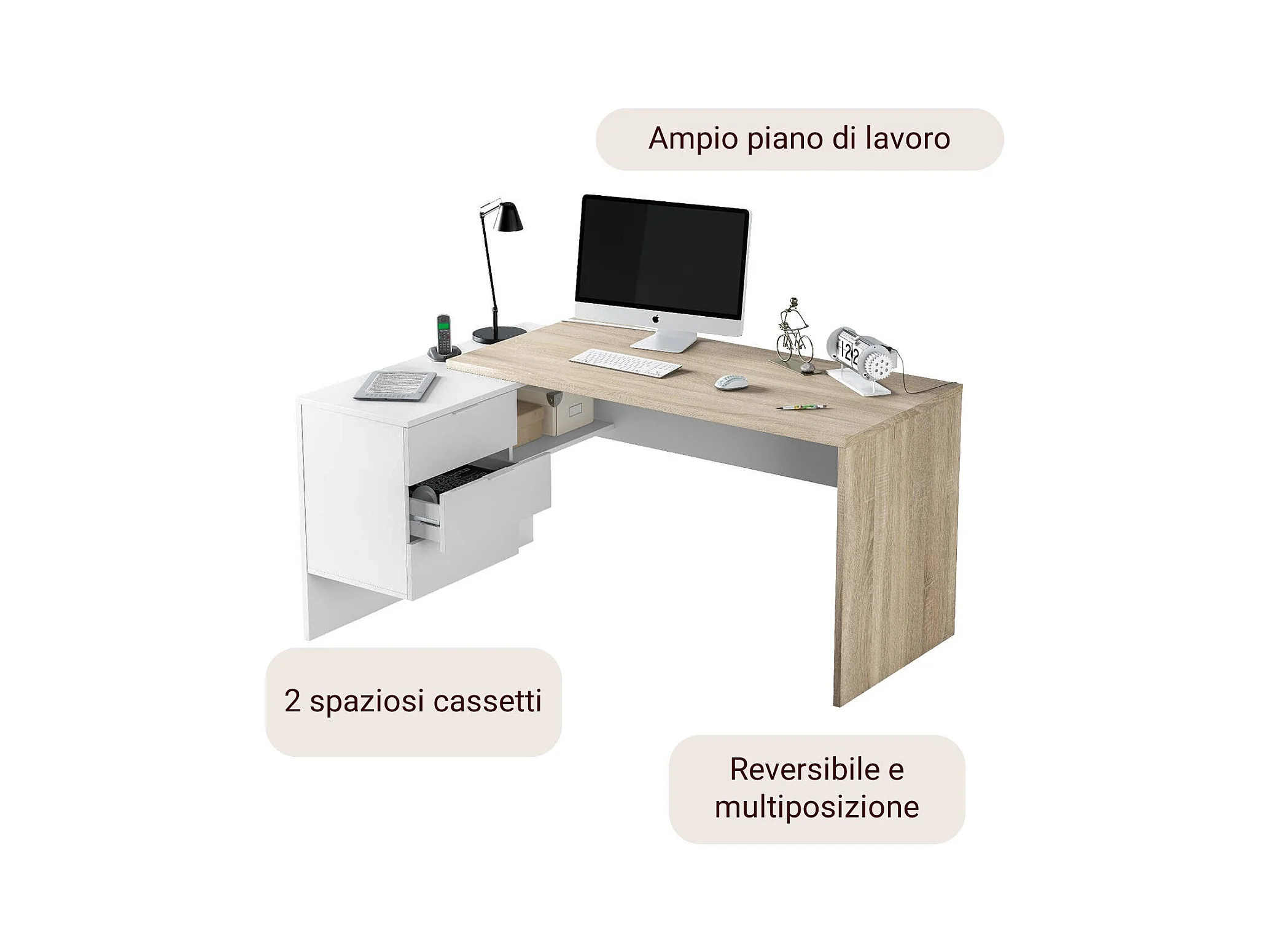 Bureau Greensboro, Bureau réversible multifonctionnel avec tiroirs, Bureau d'angle avec support PC ou table de bureau, 145x108h73 cm, Chêne et Blanc