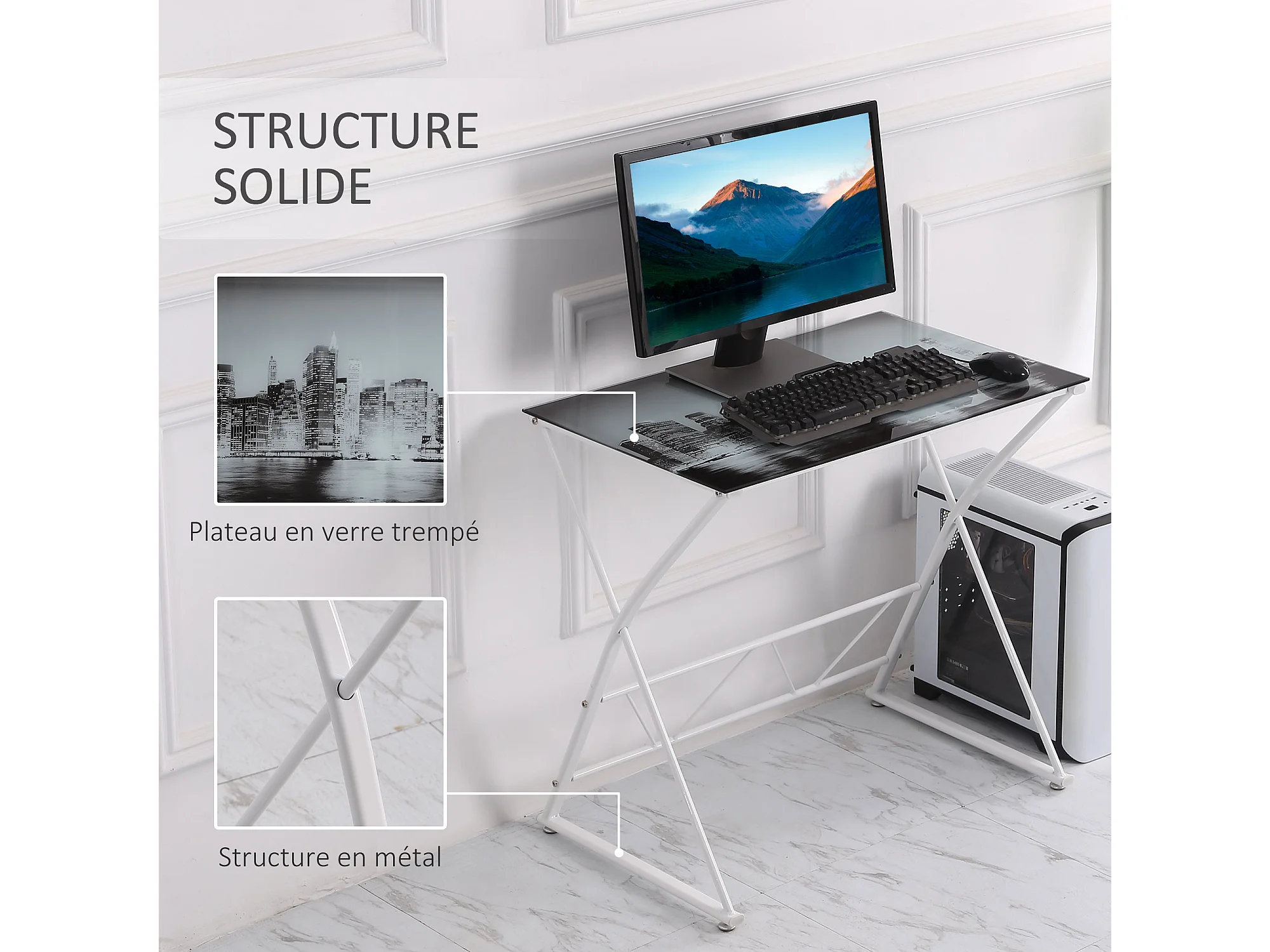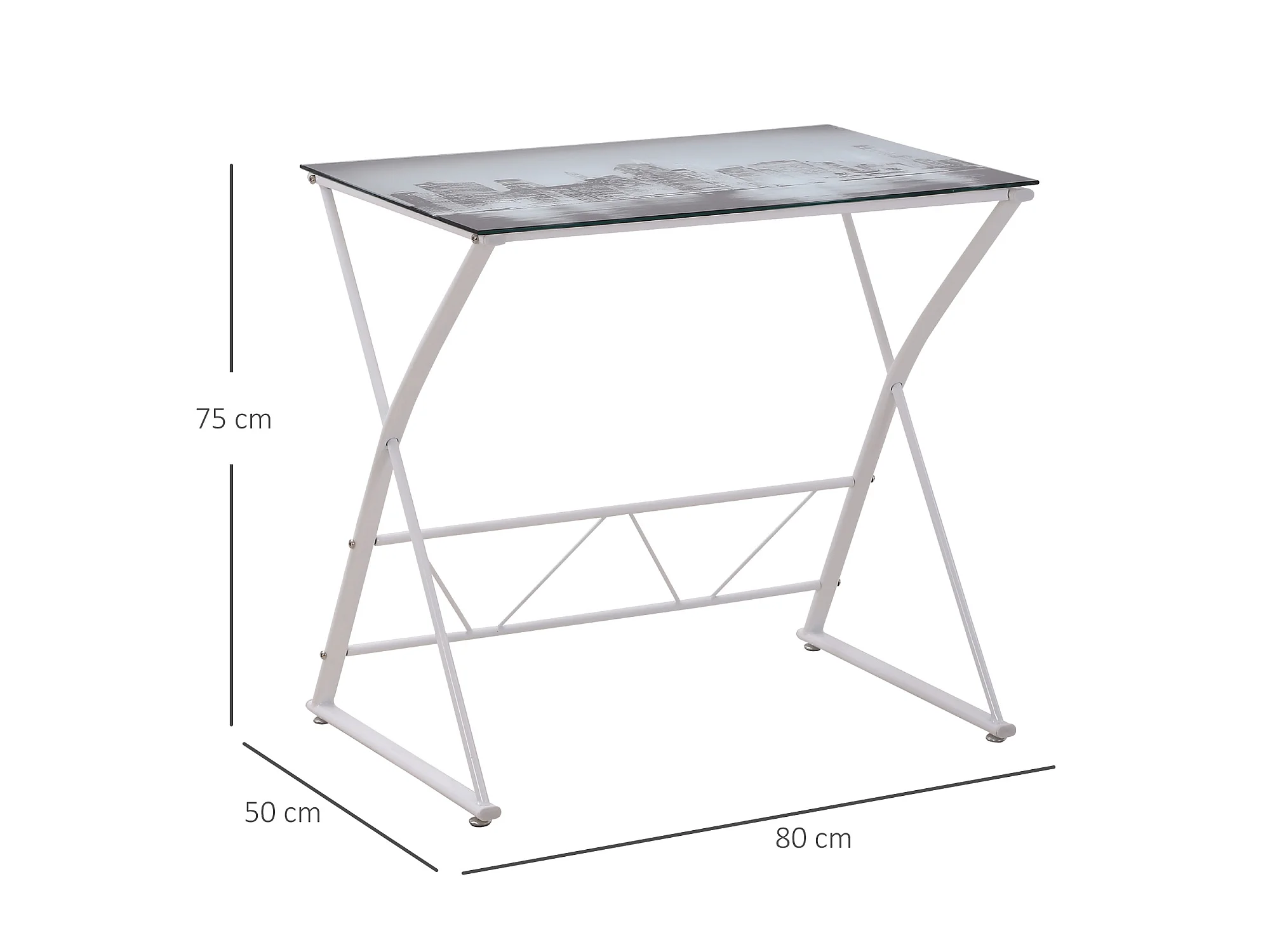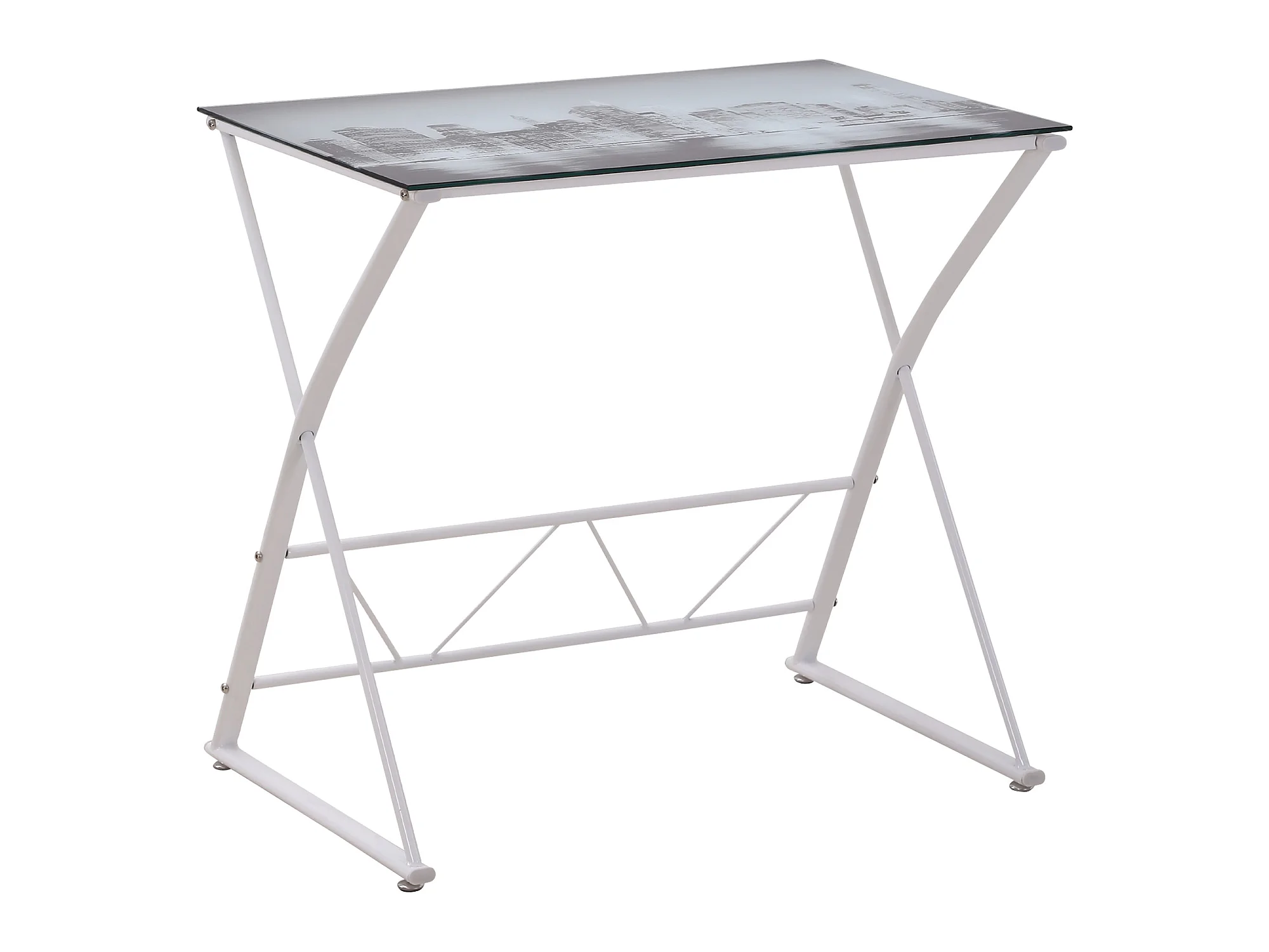 Bureau informatique design contemporain plateau verre trempé décor New-York châssis métal blanc